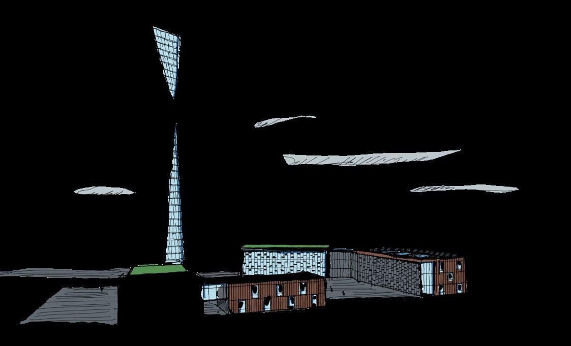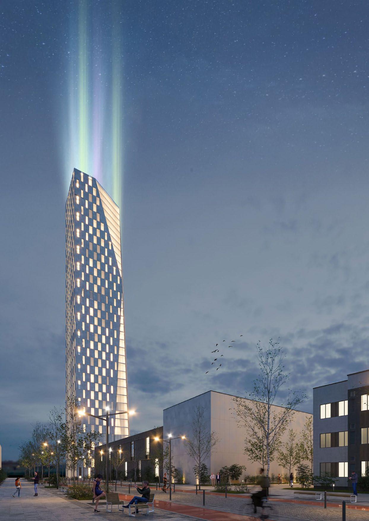 The composition of the detached buildings creates a courtyard block, where the self-standing tower is the dominant, and the low-rise podium buildings are visually, functionally and geometrically connected to it. The tall building is characterized by two inclined walls and a large ‘cut’. it is located at the level of the cathedral, symbolizing its pinnacles. from the other side, a vertical panoramic wall faces the Oresund Bridge.