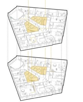 Within the structure are carved out hollow spaces to host private functions within the central space