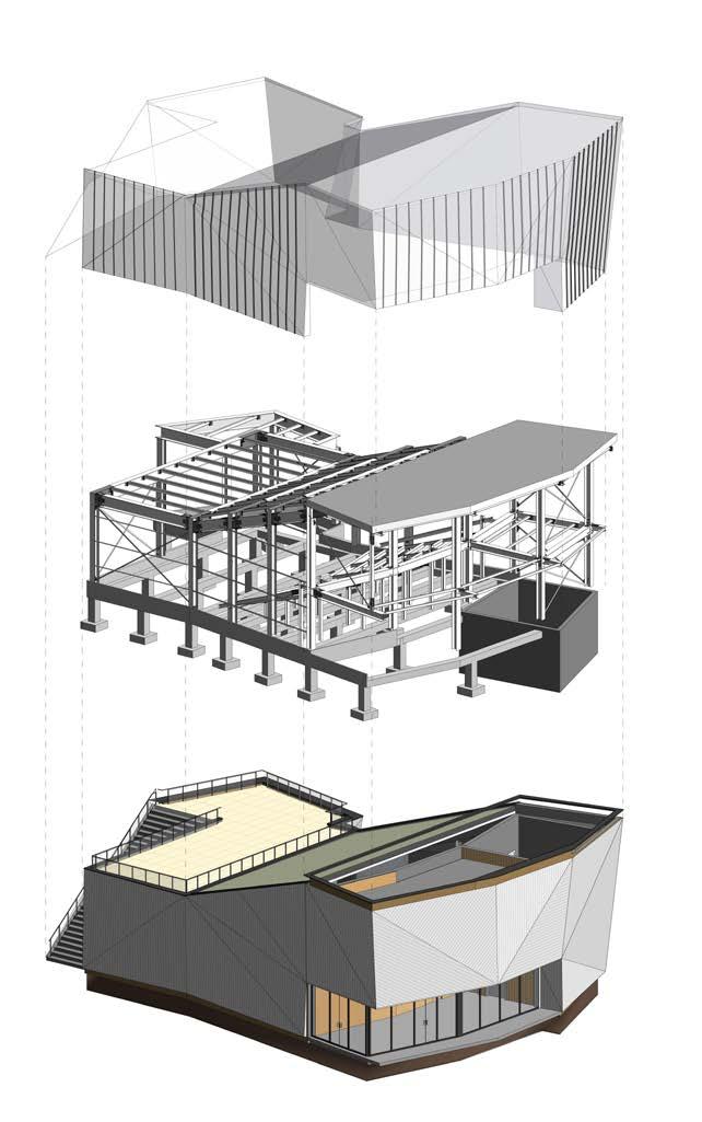 1. in the design of this auditorium the conceptual idea was done in sketchup , and then shifted to revit through mass modling preparing the outer shell of the building dividing it to floors and then modeling the structural parts with full steel detailed joints and a clad of panels carried by customized mechanical system of purlins.