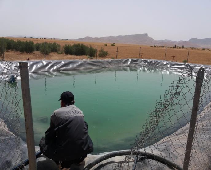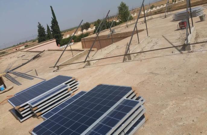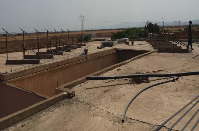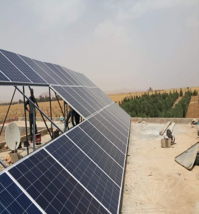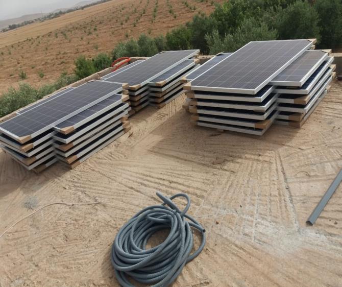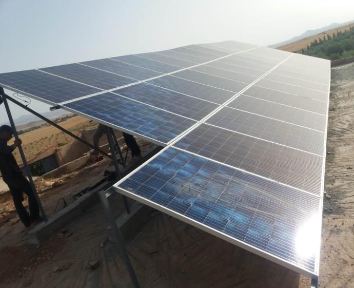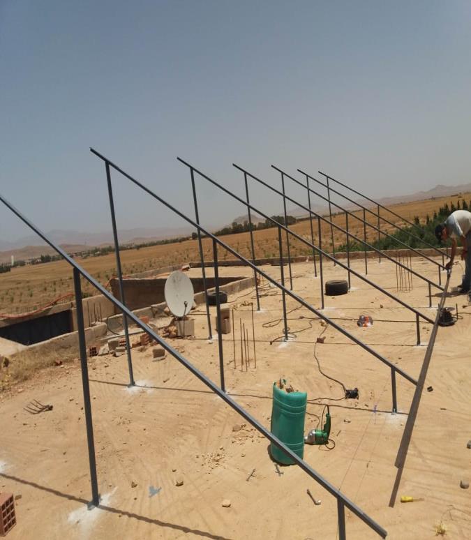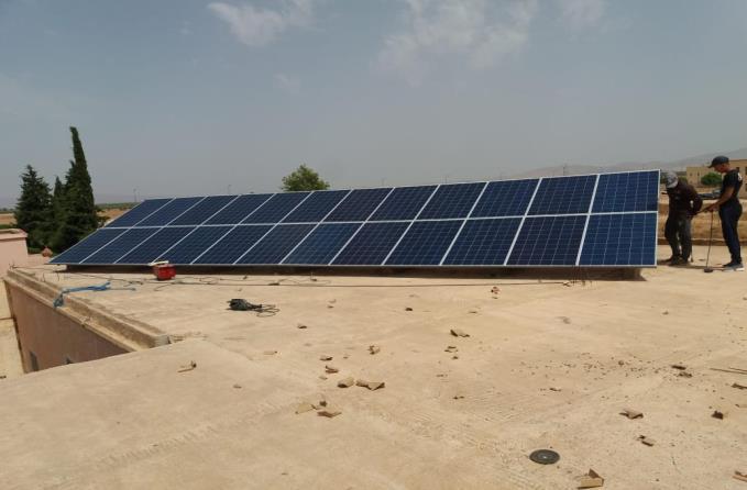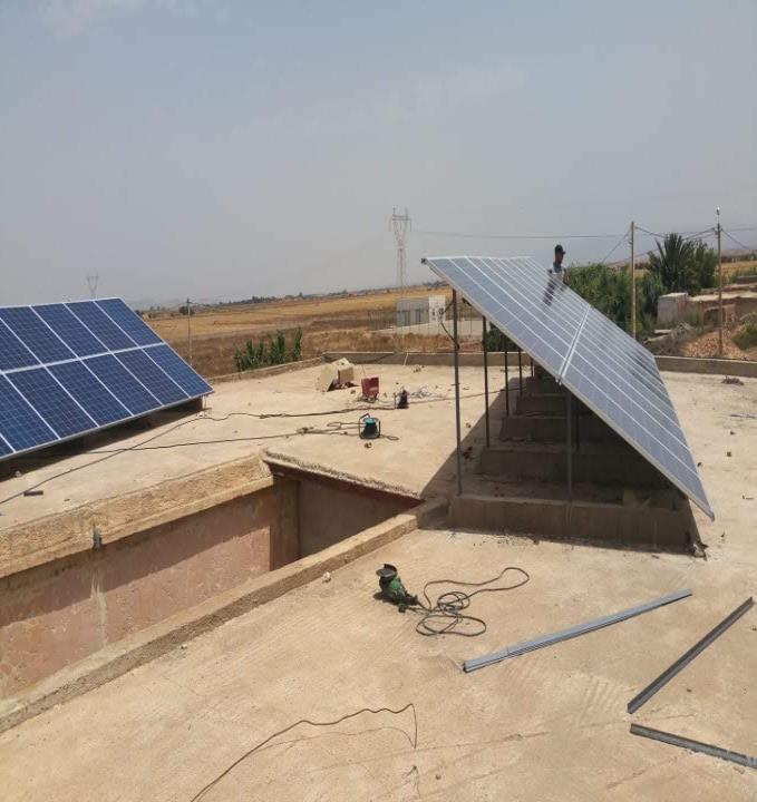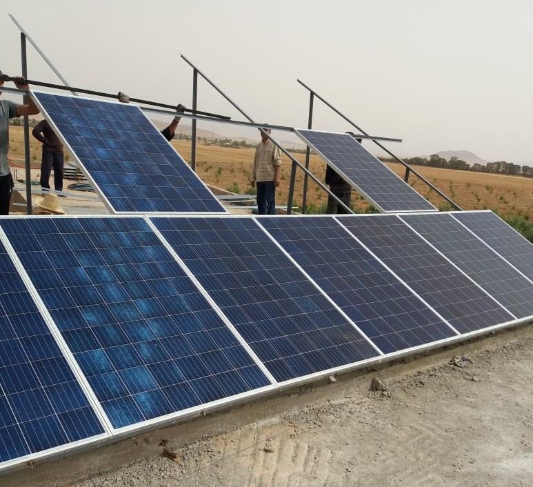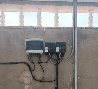 Die zweite Phase des Projekts umfasste die Elektromontage und den Pumpenbetrieb. Nachdem die Solarmodule installiert wurden, haben wir die Solarmodule in Reihe geschaltet (2 Strings Jeder String besteht aus 22 in Reihe geschalteten Solarmodulen). Dann installierten wir die elektrische Kabel und die 2 Strings mit der DC-Box verbunden, um die Installation zu schützen. Danach haben wir die DC-Box-Kabel mit dem Frequenzumrichter montiert.