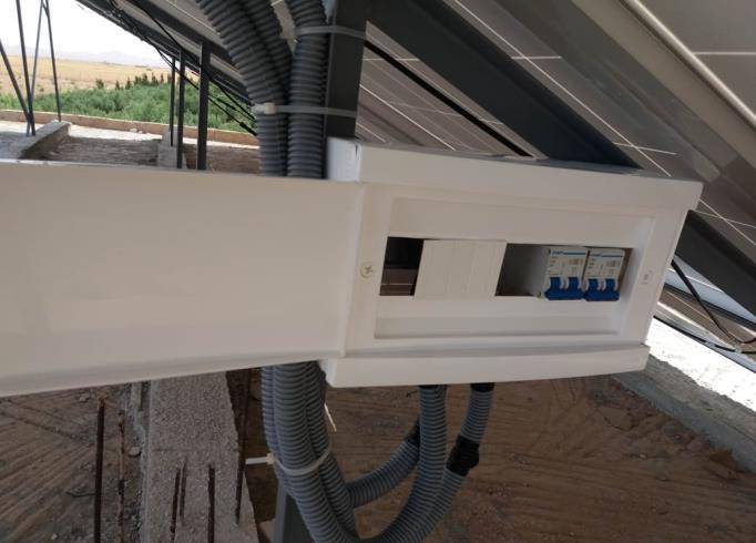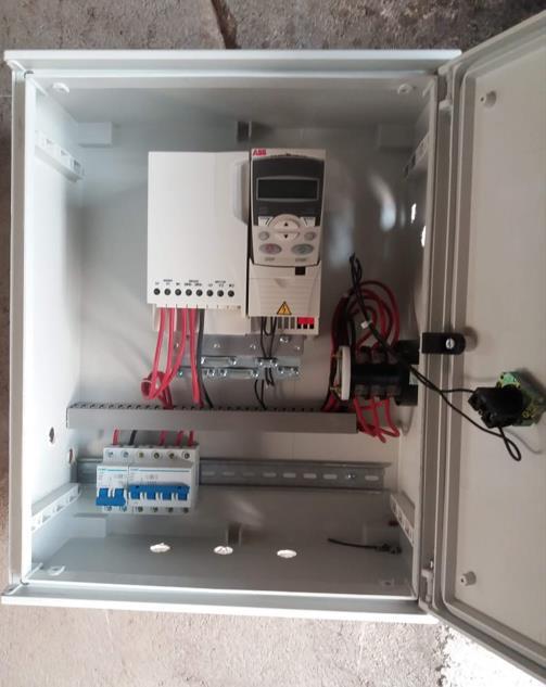 Die letzte Phase des Projekts war die Installation und Montage der Solarmodule. Nachdem die Solarmodule installiert wurden, haben wir die 2 Strings mit der DC-Box verbunden, um die Installation zu schützen. Danach haben wir die DC-Box-Kabel mit dem Frequenzumrichter ACS355-Der von ABB montiert. Wir haben diesen Frequenzumrichter verwendet, da er mit jeder Art von Solarpumpe kompatibel ist. Dies ermöglicht eine optimale Nutzung der Energie der Sonnenkollektoren und der Leistung der Pumpe über den Tag.