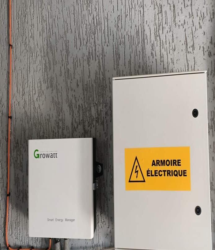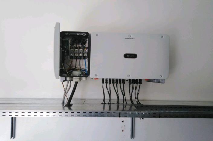 Danach haben wir mit der elektrischen Verkabelung und der Installation des Schutzsystems begonnen (Die 3 Stränge sind an die DC-Box angeschlossen, um die Photovoltaiksystem zu schützen und die DC-Box-Kabel sind mit Wechselrichter befestigt).