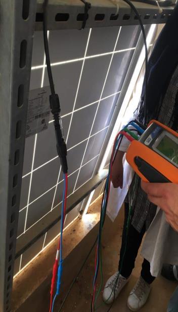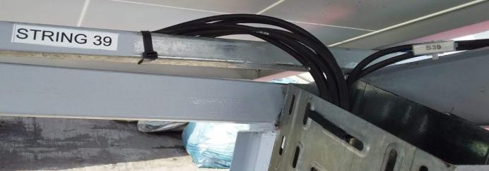 Nachdem wir die Solarmodule in Reihe geschaltet haben (4 Strings Jeder String besteht aus 19 in Reihe geschalteten Solarmodulen), installierten wir die elektrische Kabel und die 4 Strings mit der DC-Box verbunden, um die Installation zu schützen. Danach haben wir die DC-Box-Kabel mit dem Frequenzumrichter montiert.