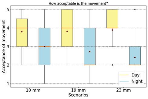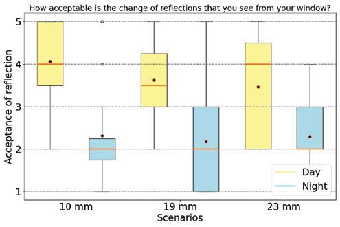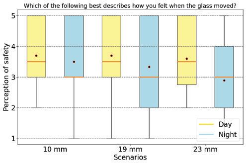 During the experiment participants response was recorded using questionairs.The results demonstrate the feasibility of measuring human responses to deformations in the glazing and provide essential data for setting serviceability limits. The experiments and corresponding user satisfaction feedback indicate that the current serviceability limit of L/50, may be relaxed, thereby presenting opportunities for material efficiency, such as the adoption of thinner glass in facades. The methodology effectively captures human responses, revealing that changes in reflection were the primary reason for the perception of movement, leading to a higher perception of glazing movement and a lower acceptance at night. Overall, participants felt safe regardless of their prior knowledge on glass properties, and providing this information to participants did not improve acceptance, which was already sufficiently high.The findings from this research fill an important knowledge gap in understanding user acceptance of glass deformations, crucial for comprehensive user satisfaction assessments and evidence-based reductions in glazing thickness.