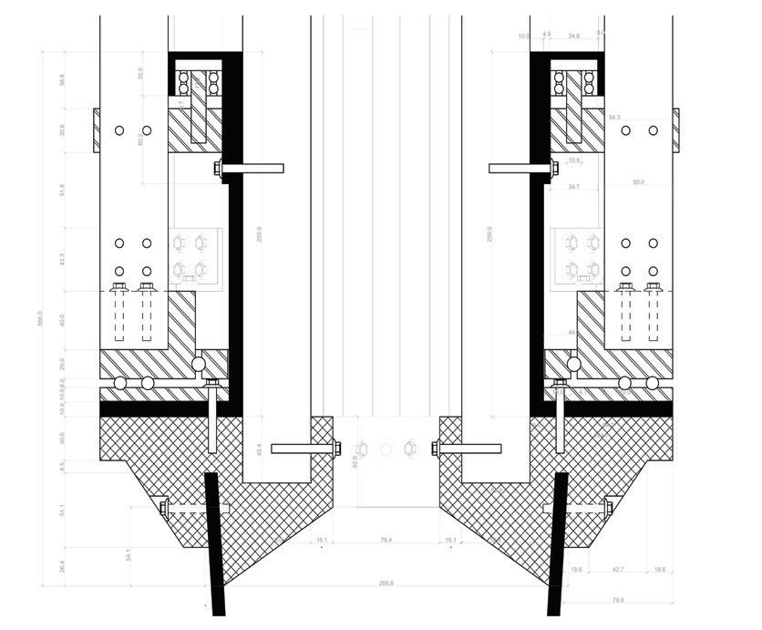 Diagonal HEA 220 column hangs the floor at the bottom(an in-situ connection) and is anchored to the top floor using a J bolt.