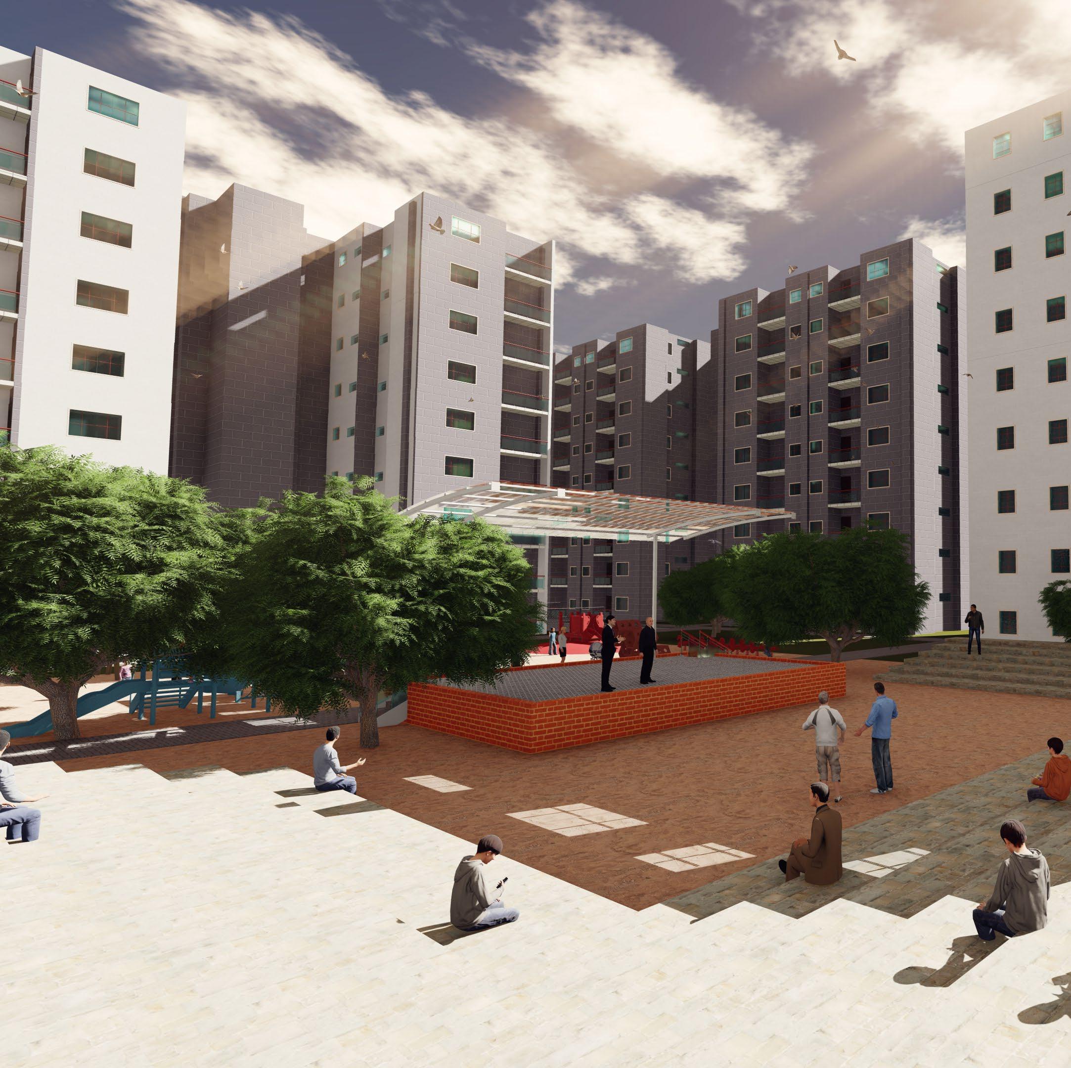 As an open space within a cluster of building, courtyard fulfils various functions like; social, leisure, microclimate etc. social, interactive space, playgrounds, activities, in a single space. leisure, club activities. microclimate, courtyard effect, site orientation, sunpath, wind direction, wind path. it provides a visual and acoustic protection.