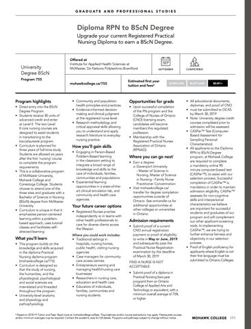 What you’ll learn • This program builds on the knowledge and skills acquired in the diploma Practical Nursing diploma program (mohawkcollege.ca/715). • Curriculum is designed so that the study of nursing, the humanities, and the physiological, psychological and social sciences are interrelated and threaded throughout the program. • University-level anatomy and physiology and pathophysiology