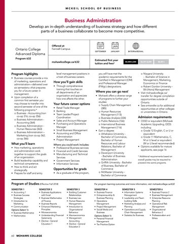 Where you can go next† • Mohawk offers a diverse range of programs to further your studies: oo Supply Chain Management (385) oo Human Resources Management (113) oo Business Analysis (334) oo Public Relations (166) oo International Business Management (116) • Earn a degree: oo Athabasca University Bachelor of Commerce, Bachelor of Human Resources and Labour Relations, Bachelor of Management oo Davenport University - Bachelor of Business Administration oo Griffith University - Bachelor of Business, Bachelor of Commerce oo McMaster University Bachelor of Commerce