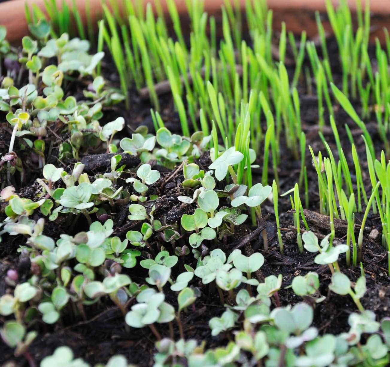 Due to the short time greens spend in their containers, any shallow re ceptacle will do. We think a standard 20 x 10-inch black plastic tray works best. These trays are easily available at garden supply stores or online. A shallow flower pot also works, but keep in mind clay pots can hinder ger mination by drying out too quickly and wicking water from the soil. Proper drainage is important. But if you have a restaurant supply store, you can get some of those clear plastic salad containers, or save them from your take-out meals. These make a great little greenhouse with an attached lid and are the perfect size to grow a lot of varieties of greens in a small area.