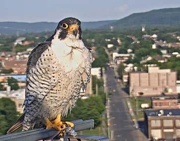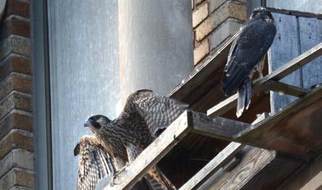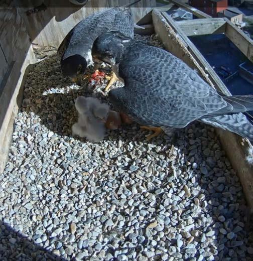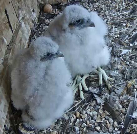 By May 8th, it was clear there would be no more than two falcon chicks in the nest this season. The reason the other two eggs didn’t hatch would remain a mystery. Hav ing only two mouths to feed would be easier for the parents since they wouldn’t have to procure as much food. It would also be easier on our fledgewatch volunteers since, come fledging time, there would be only two birds to keep track of and potentially rescue.