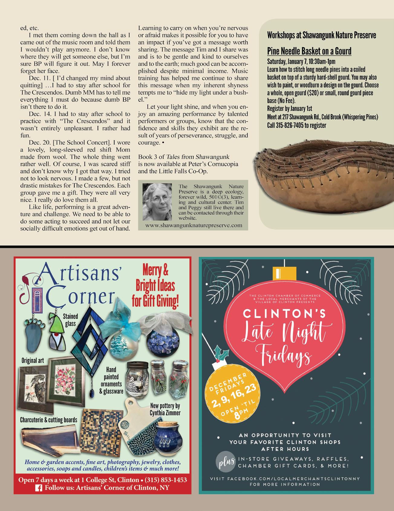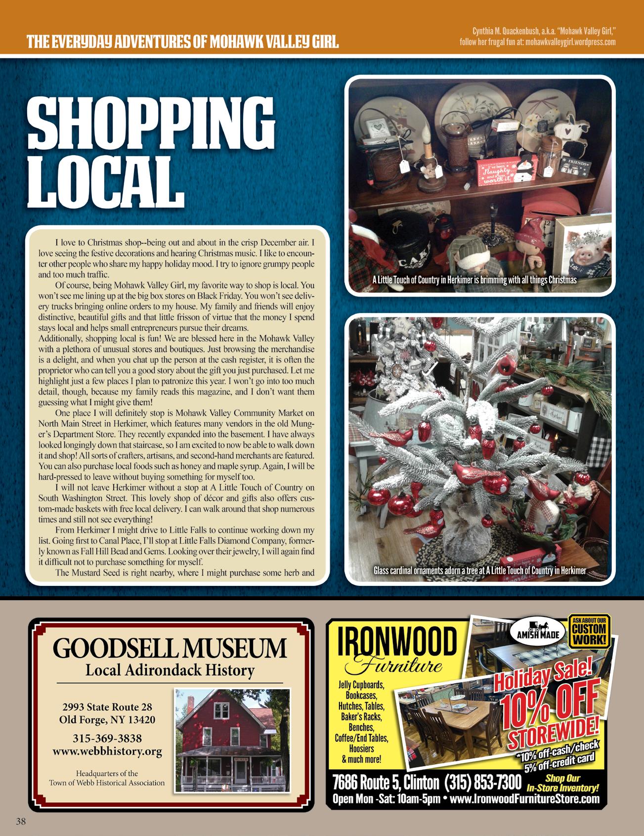 When holiday shopping this season, be sure you don’t overlook local antique and co-op shops. I recently found some treasures at the Mohawk Val ley Community Market in Herkimer. In addition to some pretty gift boxes, I bought a beautiful, hand made wooden step that flips up into a chair for my granddaughter. It’s not new. It had a previous life unknown to me, which makes it even more special. Who knows how long she will have this little piece of furniture? Will she use it in her first kitchen some day to get to an out-of-reach shelf? Will she have a little girl of her own who uses it to reach the sink to brush her teeth?