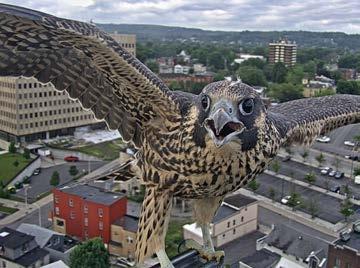 grip on the ledge. At a few minutes after 10am, Percy was ready. He peered into the canyon, bobbed his head a few times and jumped into the sky. His wing flapping was strong as he headed towards the Grace Church steeple. At the last second, he decided against trying to land on the structure’s sheer walls. Instead, he banked right over Genesee Street and headed north towards the Doubletree Inn. He managed to maintain altitude as he approached the building, ultimately landing on the narrow ledge that runs along the hotel’s east side. He wouldn’t try to fly again for the rest of the day.