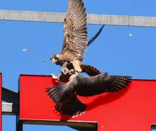 and to ledges on the State Office Building to spend the night. The young falcons remained on their parent’s territory until close to the end of July. After that, they began their long journey southward – possibly to Central or South America. Independence for young raptors is full of challenges, and Percy and Kara were as prepared to meet them as any young falcons could be. If they return next spring, we are unlikely to recognize them. A complete feather molt will leave them look ing more like their parents. As for Astrid and Ares, they will remain on their territory through the winter months. Well before their young left town, they resumed courtship dis plays at the nest box, thus making clear their
