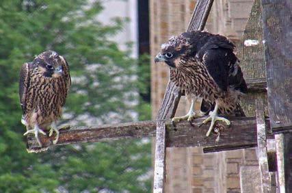 time they go onto the cross perch and long perch. One of the last milestones we watch for is when the nestlings start venturing onto the window ledges beyond the verandas. We found it interesting that Kara nearly kept par ity with Percy. She did virtually everything he did, and sometimes only hours later. This was surprising since female Peregrines, with their larger body size, generally take more time to mature. Temperamentally, female nestlings, while dominant inside the nest, tend to be more timid in their adventurism outside the nest. On the afternoon of June 8th, first Percy and then Kara got up onto the lip of the nestbox. This is always a nerve-rack ing moment for us, when the nestlings first venture from the safety of the box. We are keenly aware that fifteen stories be low is a busy street. Of course, once a