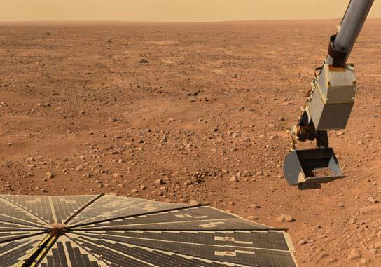 The polar regions of Mars have ice caps that grow and shrink as seasons change, and in 2008 NASA sent the Phoenix lander to the north pole region to in vestigate the composition of the ice and soil. Using a scoop at the end of a robot ic arm to dig trenches about two inches deep it collected surface soil samples. The material was analyzed by onboard “chemistry lab” science instruments, and the tests confirmed water ice was present. Phoenix also detected snow falling from Martian clouds.