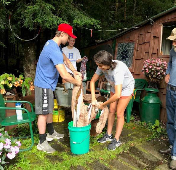 work life with such unusual outdoor activities as doing laundry. The process is the same except that we have a “modern” 1919 manually operated washing machine with metal cups for the “agitation cycle” and an equally vintage handcranked wringer to function as the “spin cycle.” Then, everything is hung to dry on the clothesline. It surprised me one year to realize that some of them had never used clothespins! But this has always been a favorite activity by most of our volunteers.