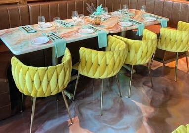 The same lovely scenery can also be admired inside where Phil and Betty Montana are seated alongside the picture window. Comfortably settled in gold velvet chairs, the Montanas marvel at the swirling colors of turquoise, green, and orange beset in the marble tables and floor. “The decor is beautiful,” said Betty Montana. Credit for the elegant motif goes to Roxanne Roser, Grant Roser’s mother.
