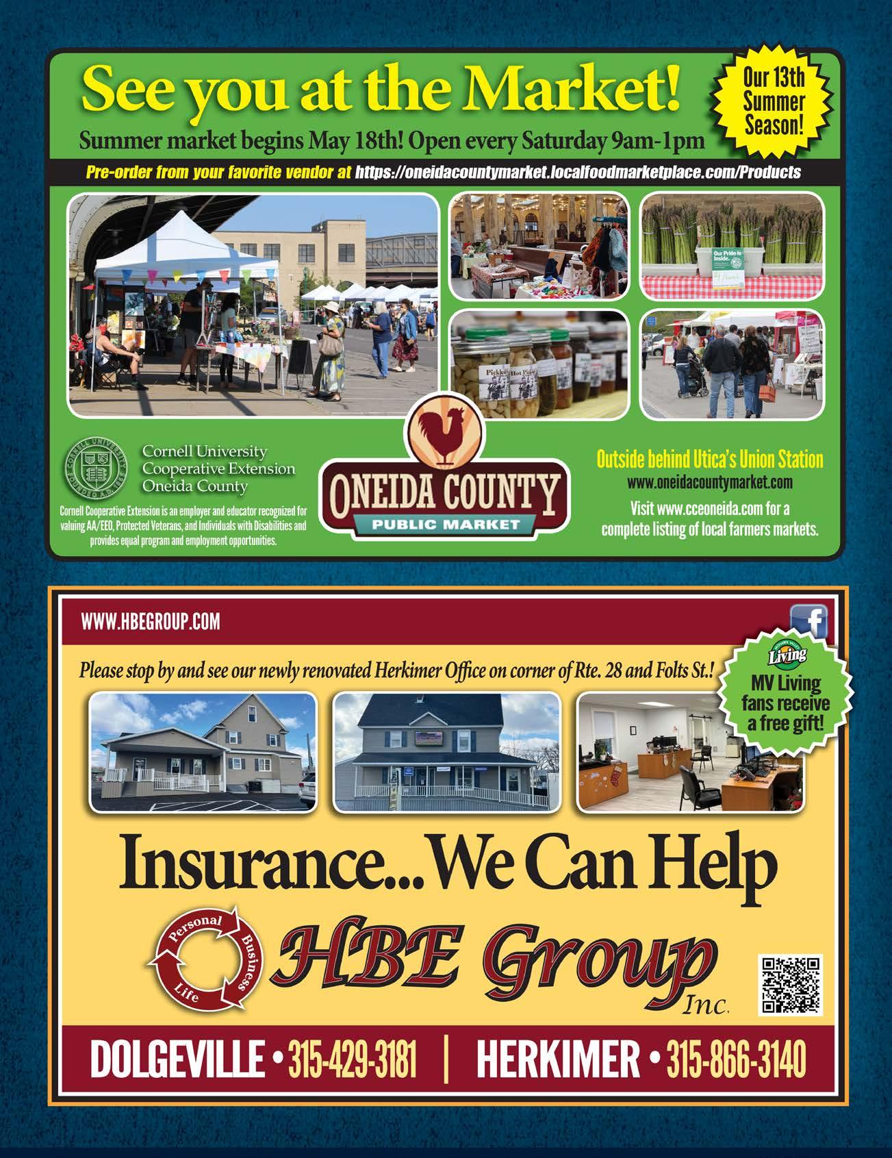 MOHAWK VALLEY LIVING MAGAZINE PUBLISHERS Lance and Sharry Whitney EDITOR Sharry L. Whitney DESIGN & LAYOUT Lance David Whitney ASSISTANT EDITOR Shelley Malenowski CONTRIBUTORS Peggy Spencer Behrendt, Carol Higgins, Suzie Jones, Rebecca McLain, Cassandra Miller, Matt Perry, Cynthia Quackenbush, Maryann Vanderpool-Imundo, Gary VanRiper CONTACT US (315) 853-7133 30 Kellogg Street Clinton, NY 13323 www.MohawkValleyLiving.com mohawkvalleyliving@hotmail.com Mohawk Valley Living is a monthly magazine and television show that explore the area’s arts, culture, and heritage. Copyright © 2024. All rights reserved. No part of this publication may be reproduced without the consent of Mohawk Valley Living, Inc. April 2024 watch mvl every sunday! contents Contest Answers