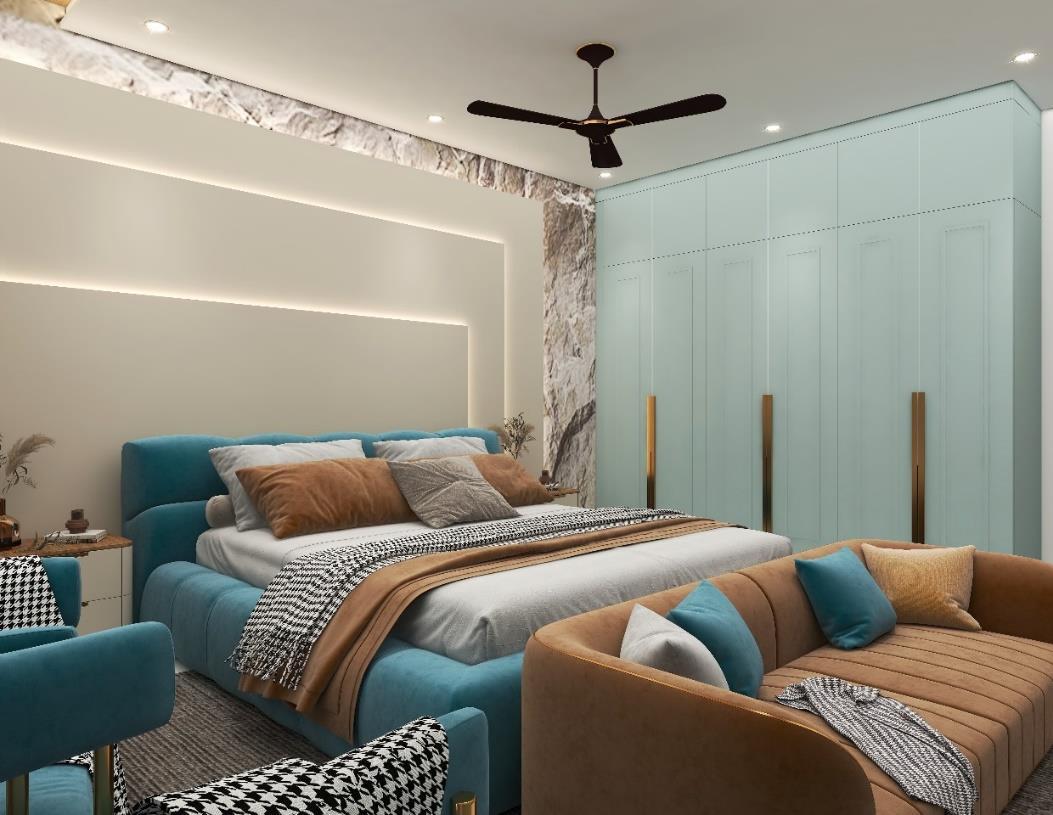 The project needs to design a Master bedroom using the Modern theme with the requirement of King sized bed with side tables, Wardrobe with max. storage, TV unit, Couch/Sofa and Dressing table/mirror.