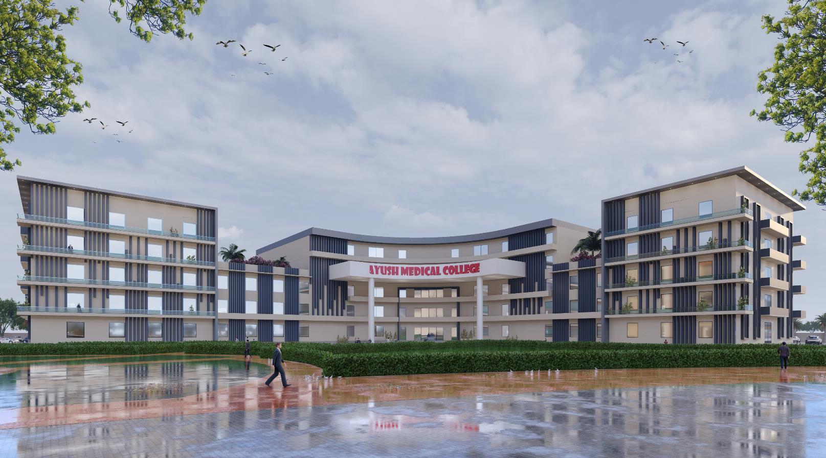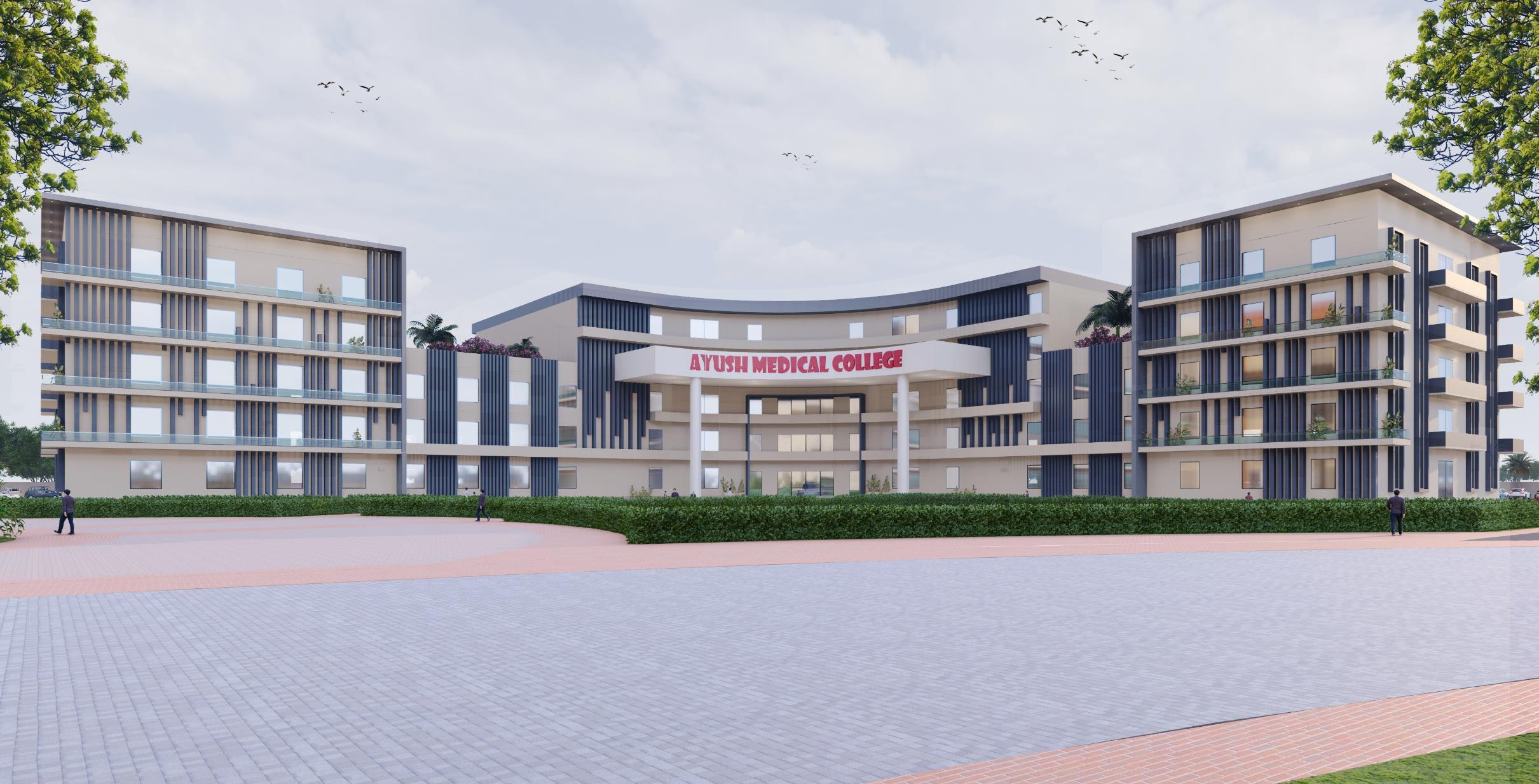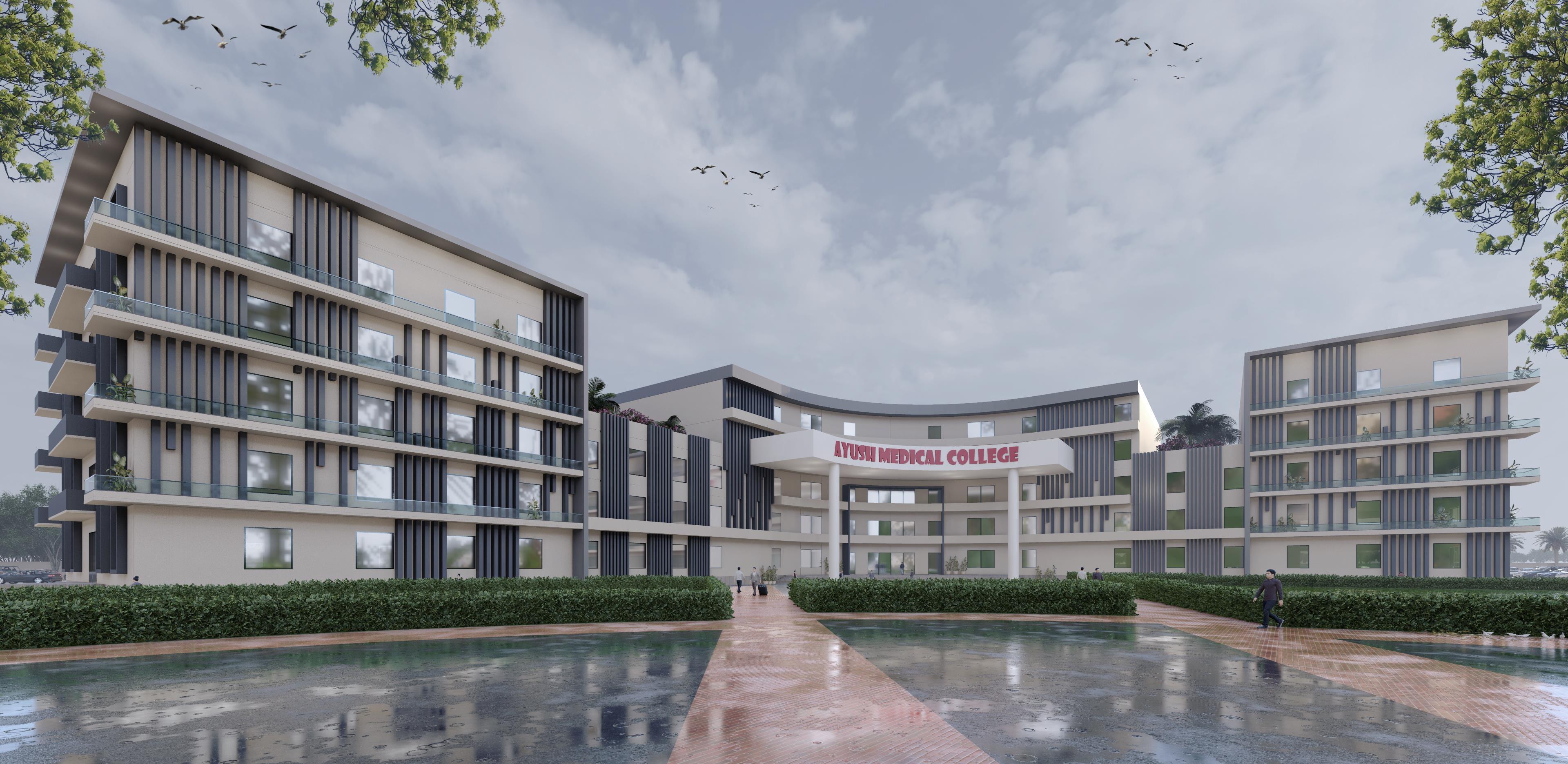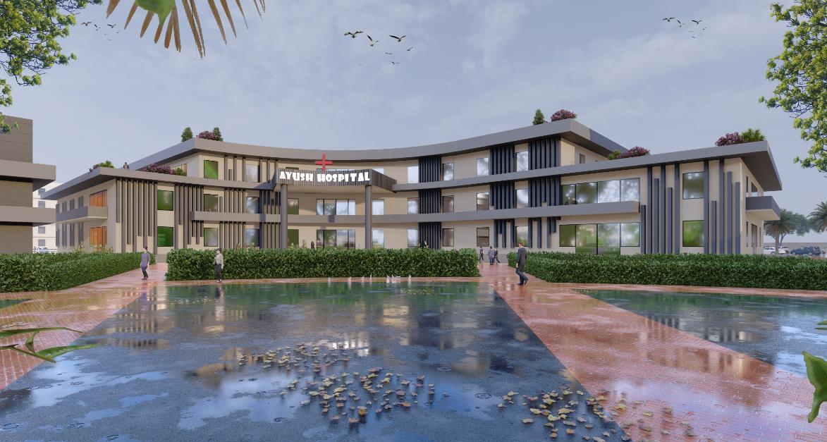The project envisions a Hospital campus designed with a Radial zoning approach for different blocks like – Hospital, Academic, Admin, Residential, Hostels, Staff Residence, Play area, etc. And landscaping follows a radial pattern fostering a holistic environment that seamlessly integrates medical, academic, residential, and recreational spaces. This innovative design aims to enhance the overall wellbeing of patients, staff, and visitors while promoting a collaborative and sustainable campus.