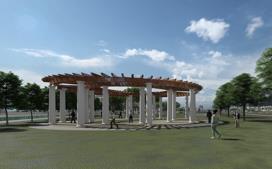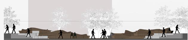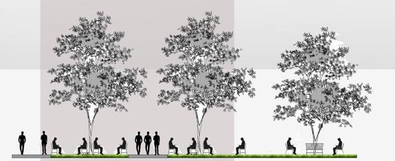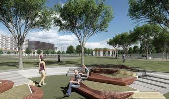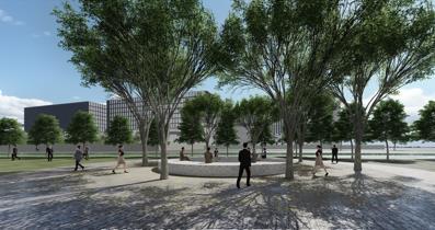 • Landscaping creates a versatile environment with seating, recreation, and healing zones.