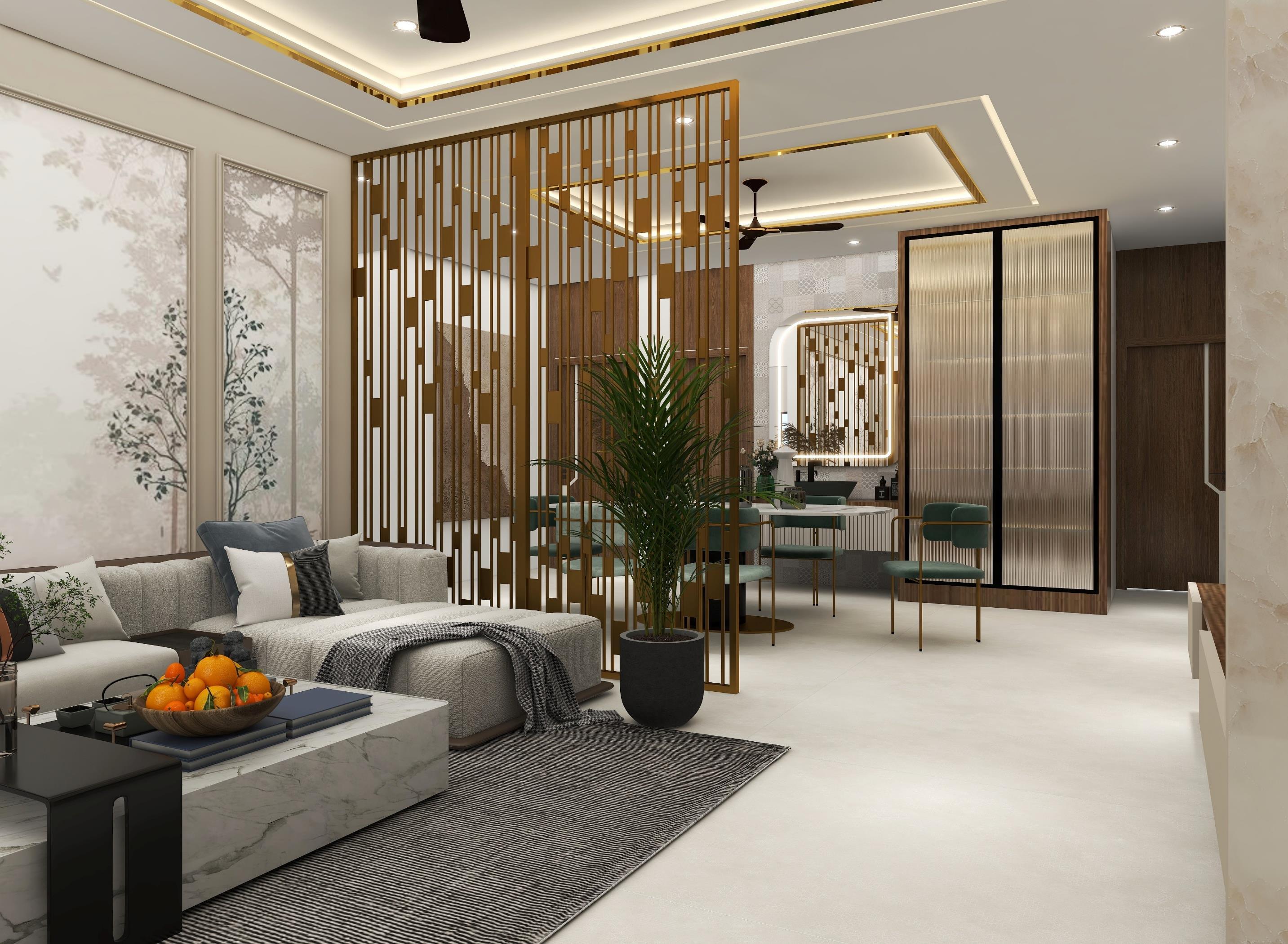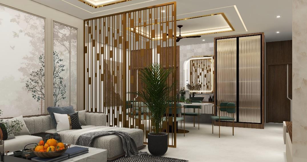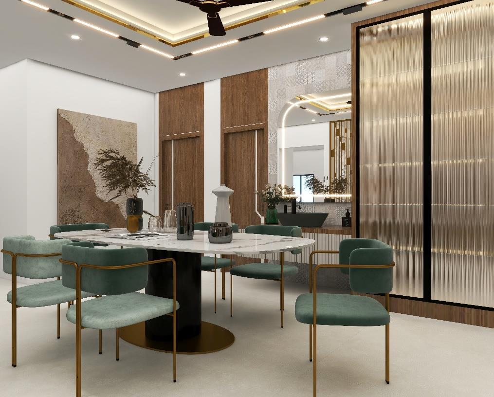 a Living cum Dining area using the Modern theme with the requirement of 6-8 seater sofa with center table, side table and TV unit, Dining area for 6 people with crockery unit and wash basin area