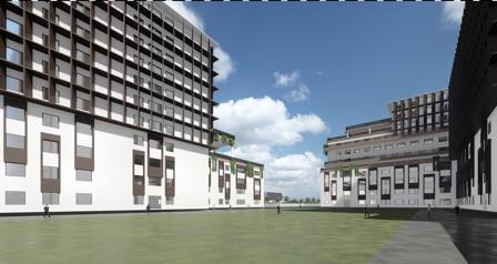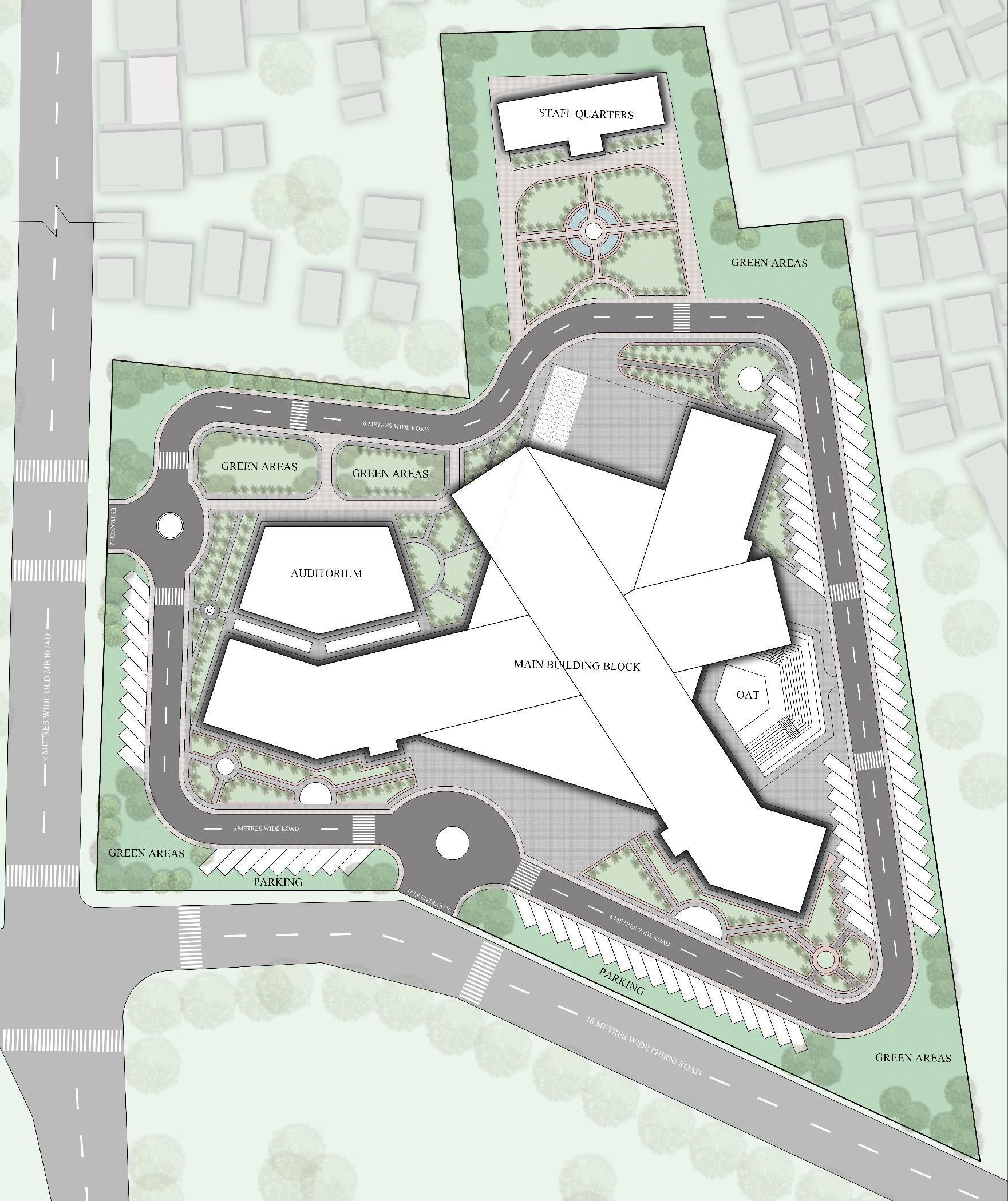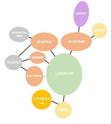 • Academic building (g+4) is hierarchically placed beside hospital (g+2) and admin building (g+2) on a single block.