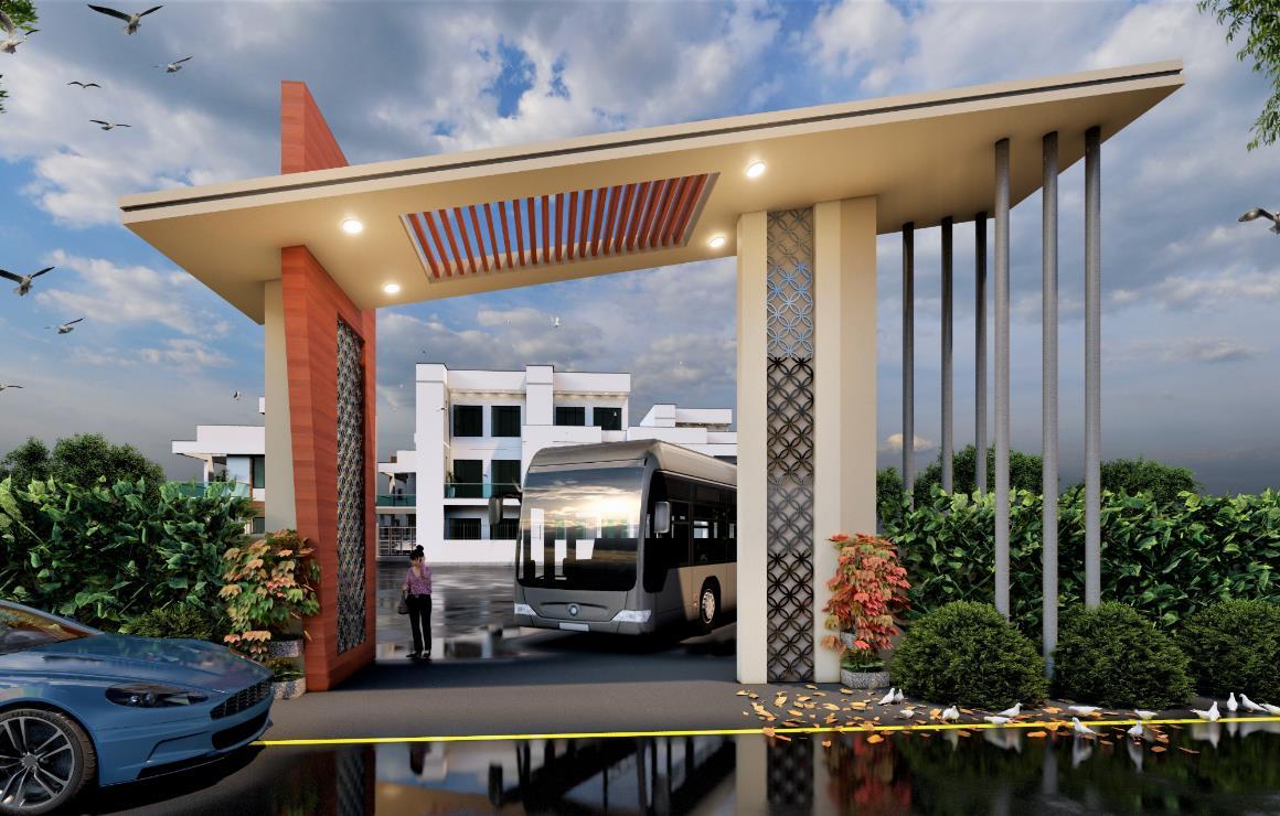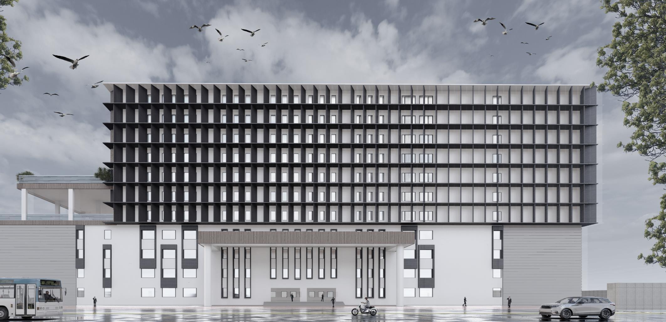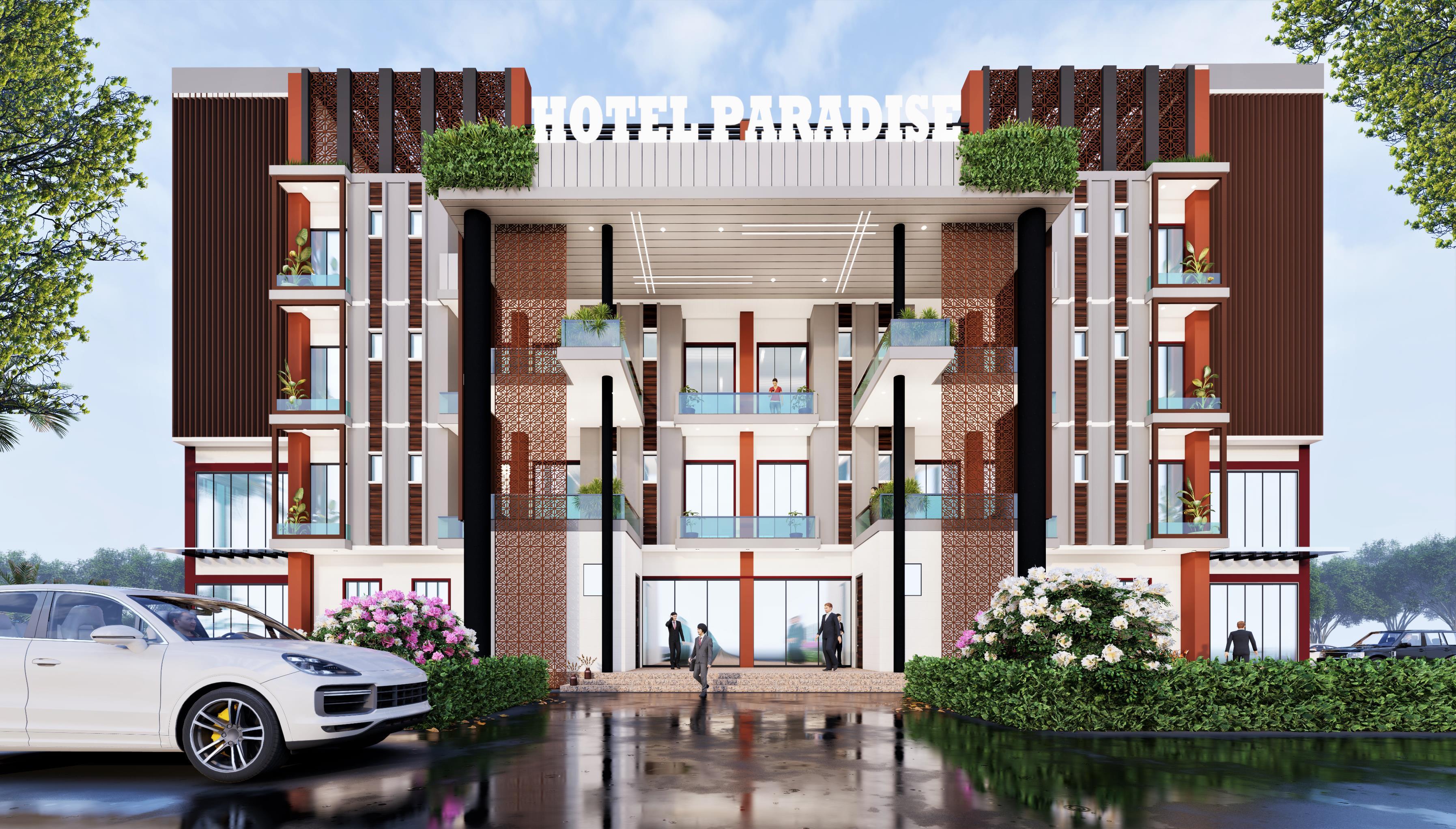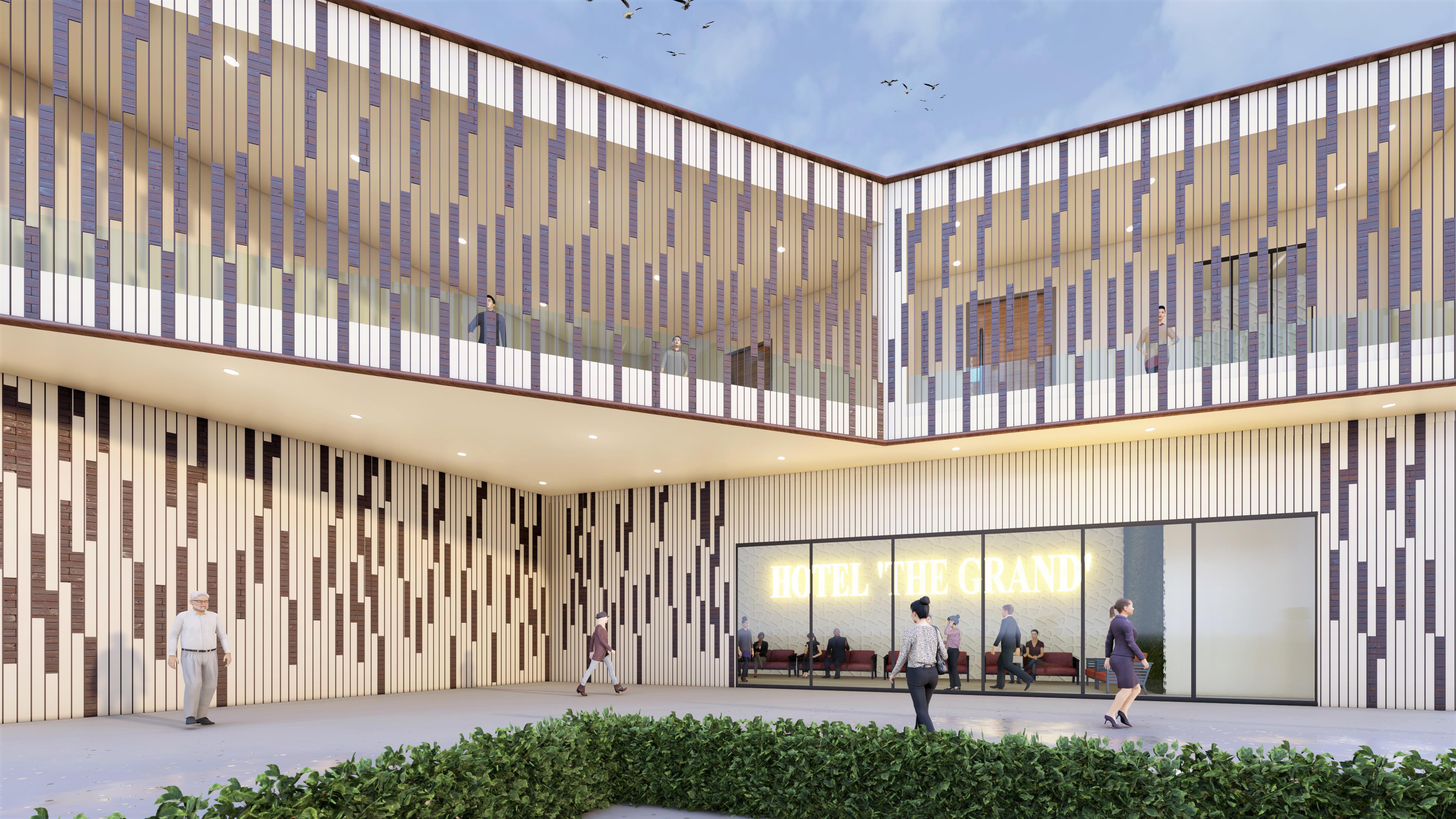PROJECT DES.- The project is to design a Hotel for the client who wanted triple heighted Grand Entrance Porch along with the use of ACP panels and louvers work.