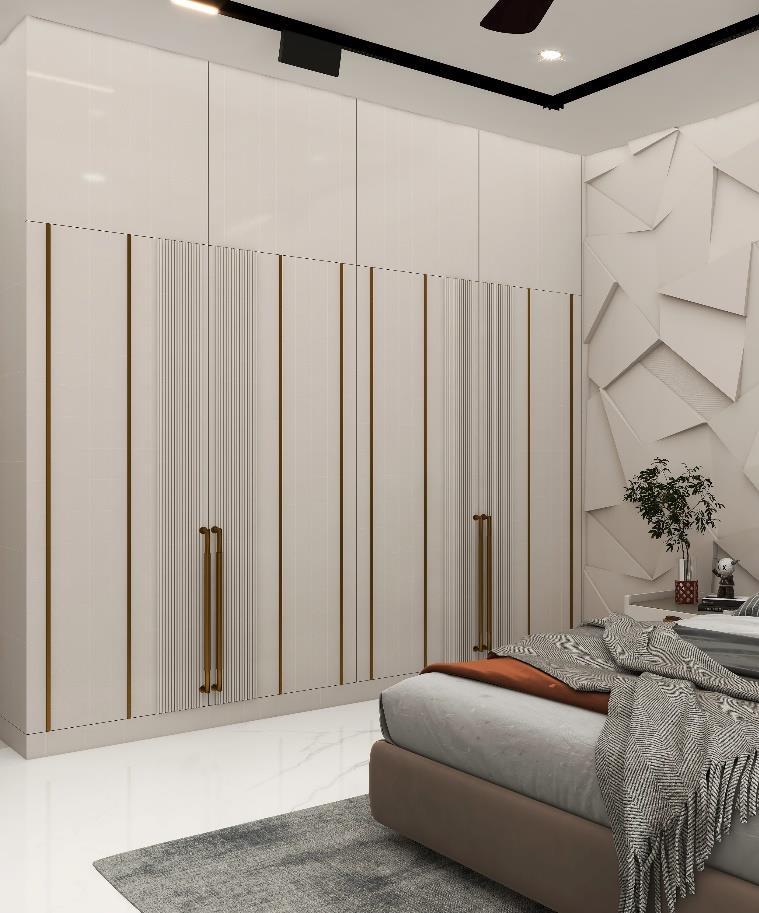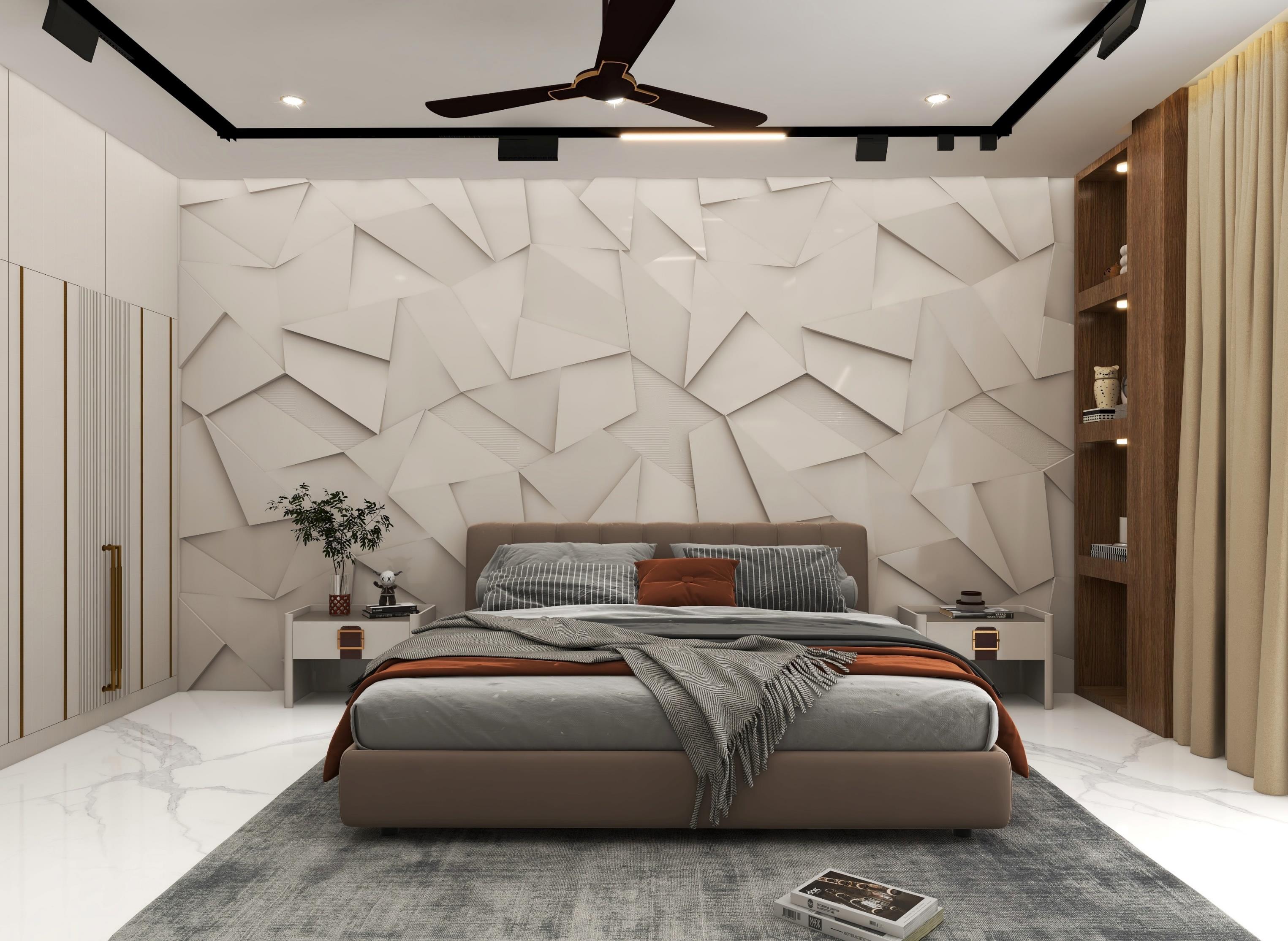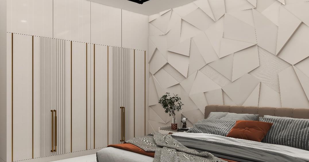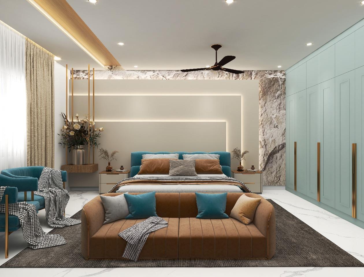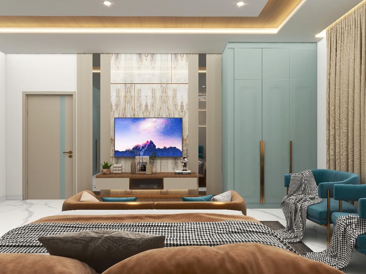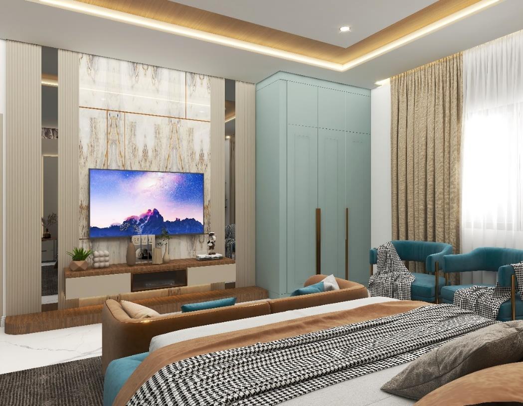 The project needs to design a Master bedroom using the Modern theme with the requirement of King sized bed with side tables, Wardrobe with max. storage, TV unit, Couch/Sofa and Dressing table/mirror