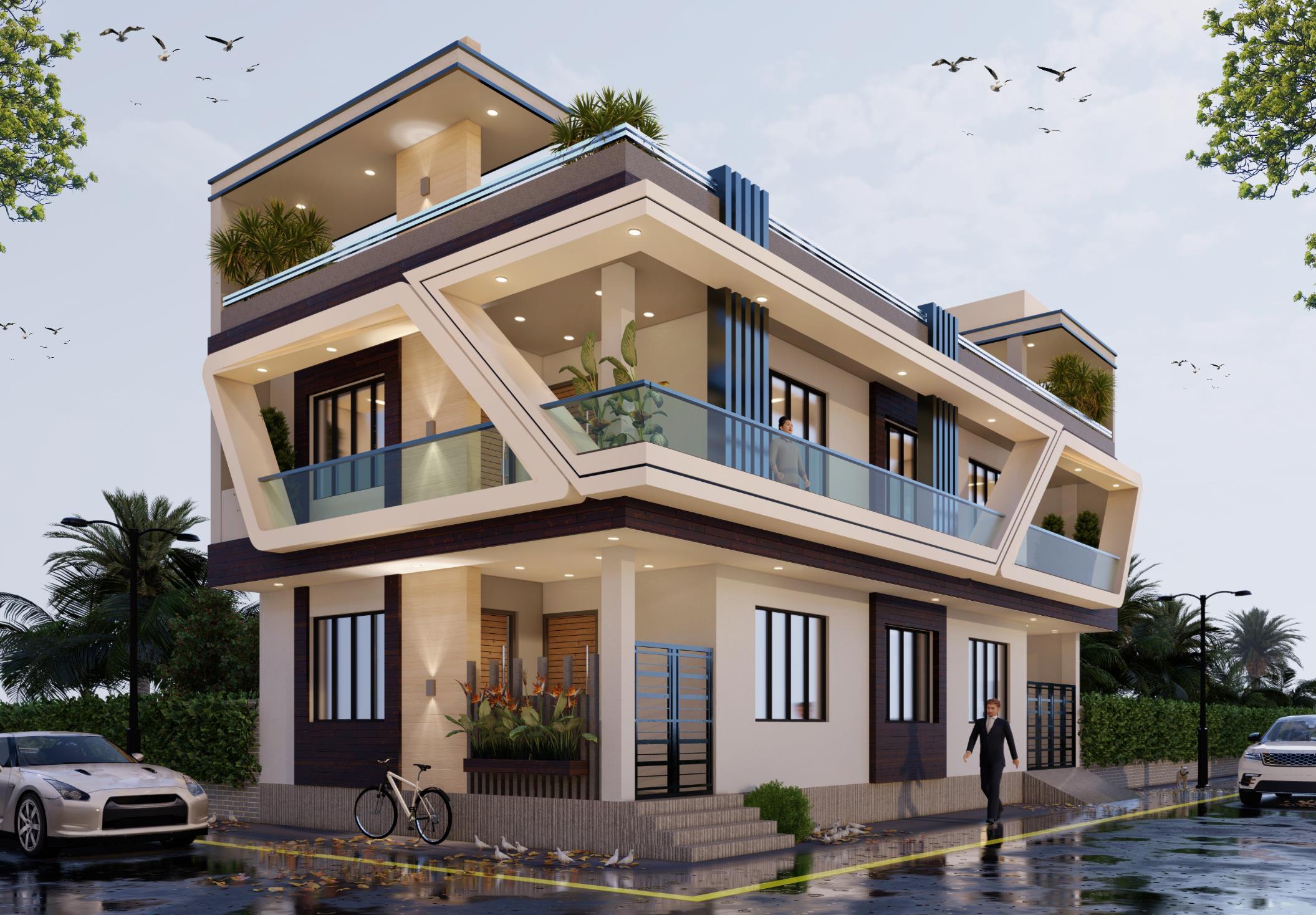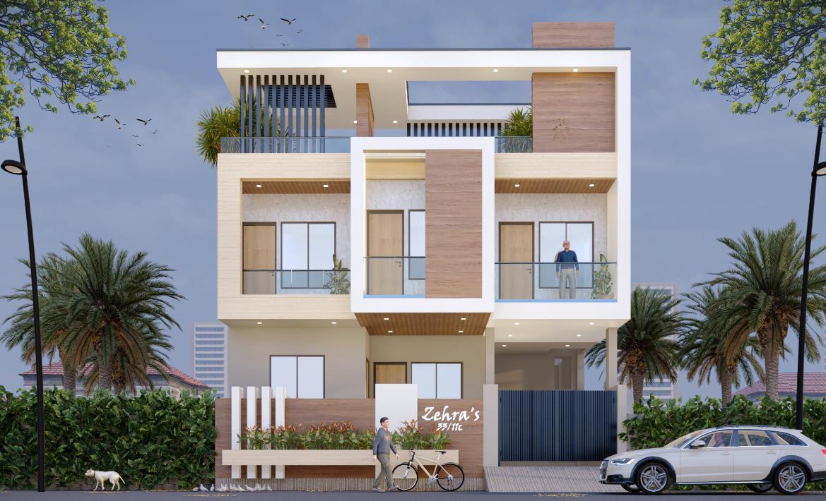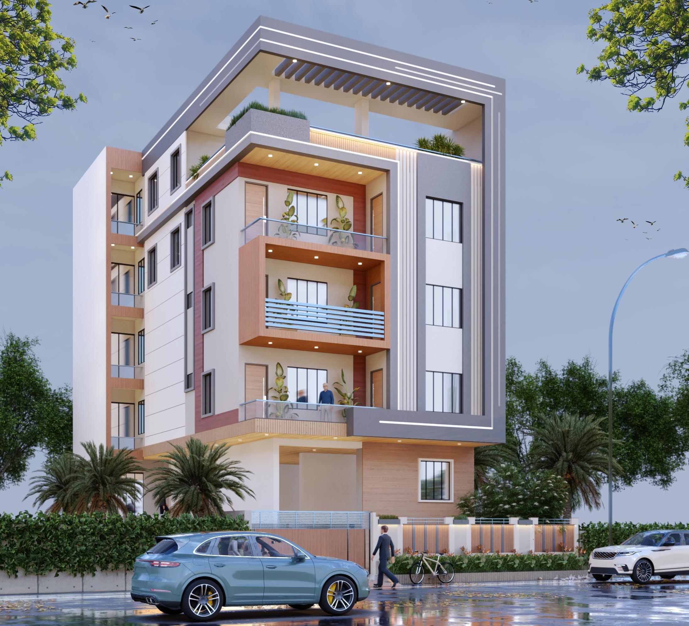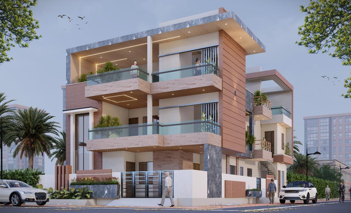 The Client needs a Façade with the Modern Elements and Materials, the use of wooden textured materials with the open balconies for the better view.