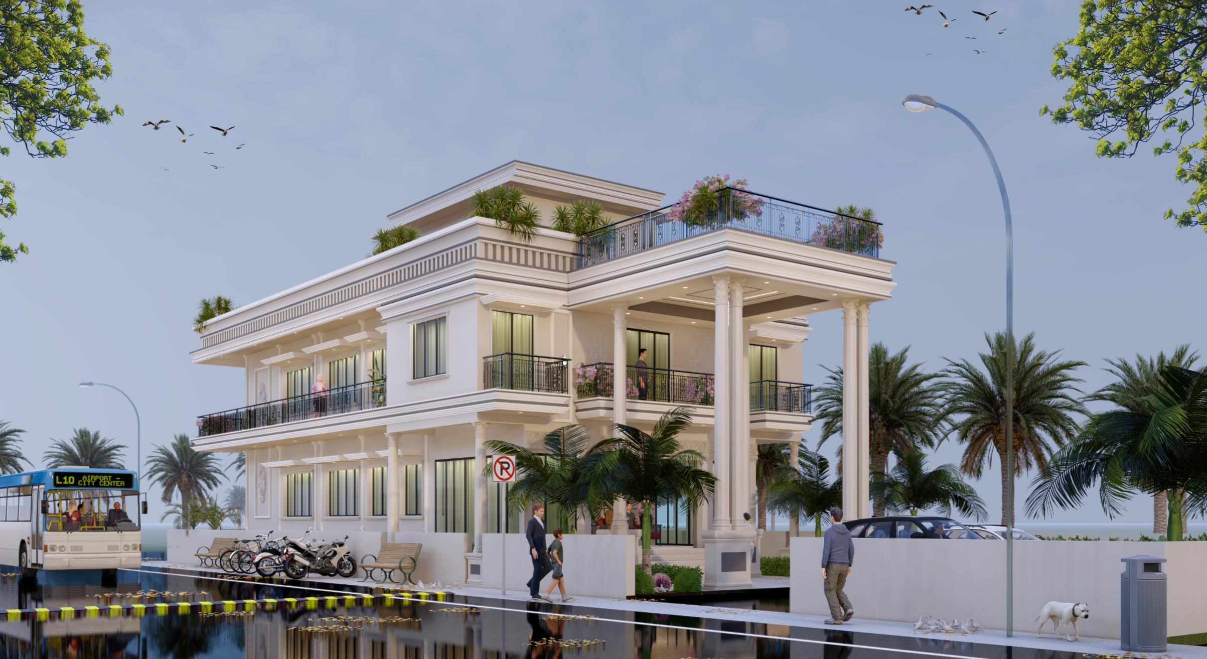 The Classical Residence is a luxurious villa that blends traditional architectural elegance with modern comforts. Featuring grand facades with stately columns, ornate moldings, and a meticulously landscaped garden, the exterior creates a majestic entrance. Inside, antique furnishings, elegant chandeliers, and rich textiles evoke refined luxury.