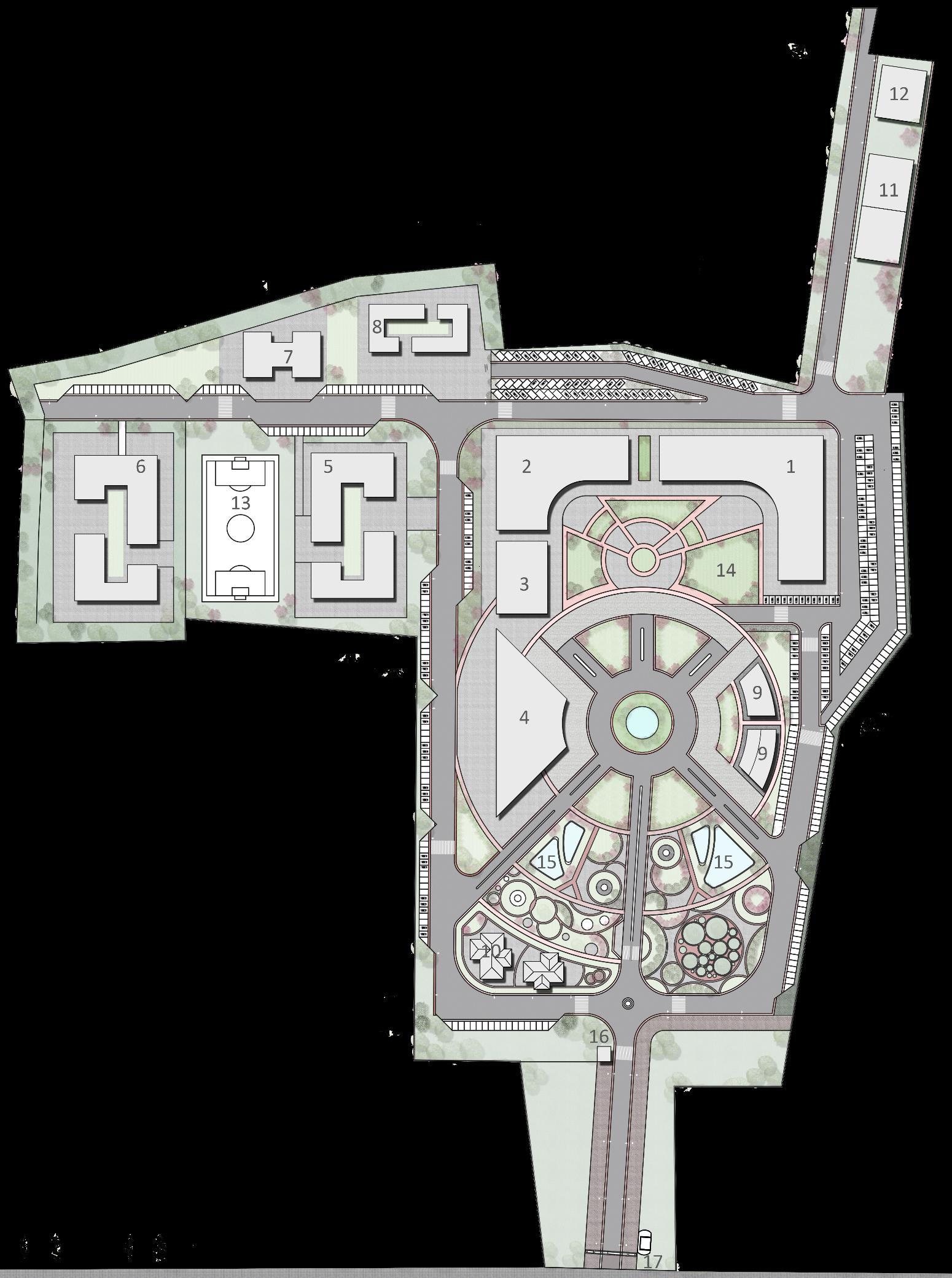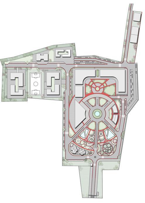 The landscaping follows a radial pattern, fostering a seamless integration of medical, academic, residential, and recreational spaces.