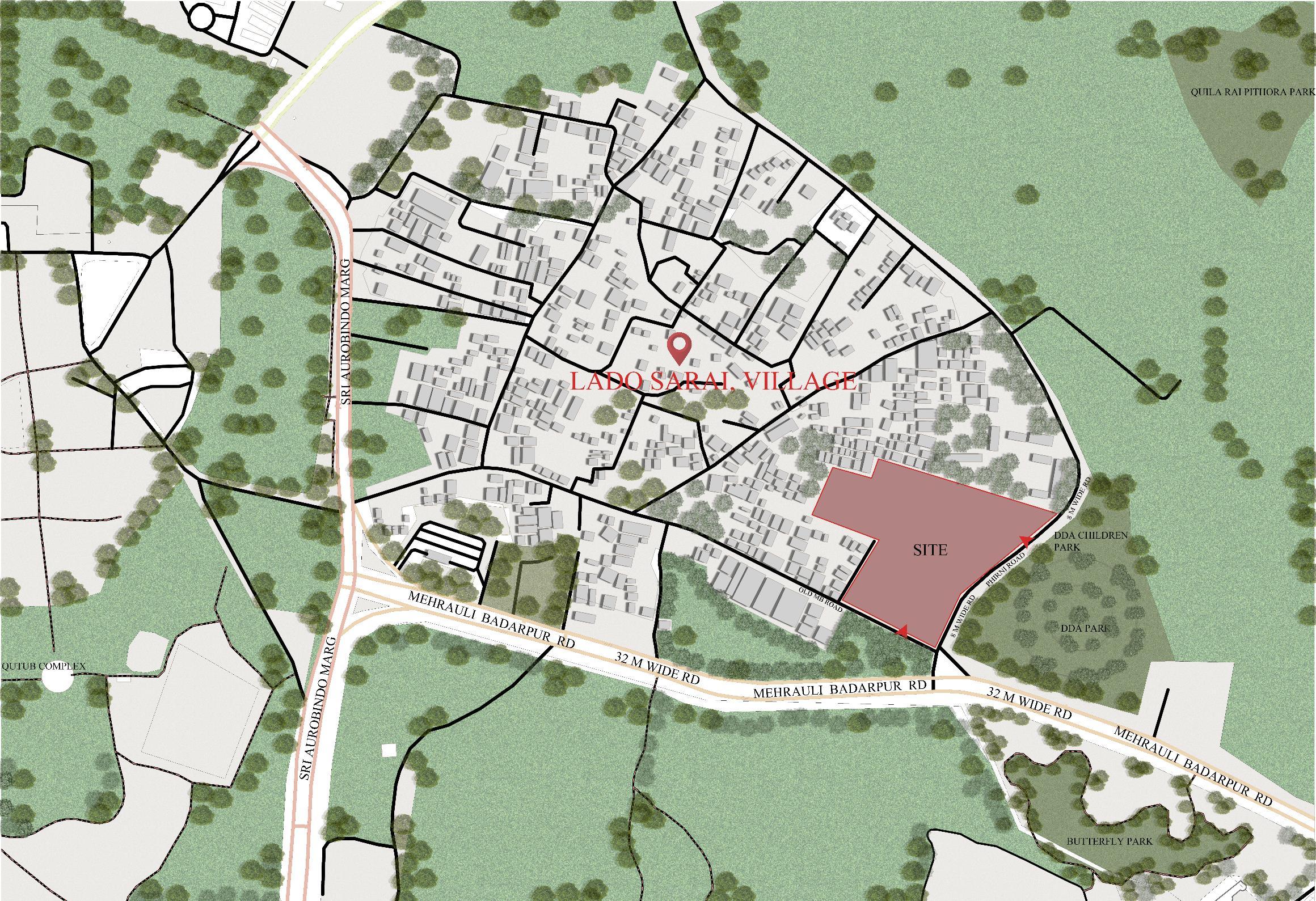 SITE CONTEXT & LOCATION The 6 acres of vacant DDA land is proposed for the institutional building where there is the proposal for the Museum Complex. The site is located at Lado Sarai close to the Qutub complex and Indian Institute of Technology, Delhi. With the access from the Mehrauli - Badarpur Road.