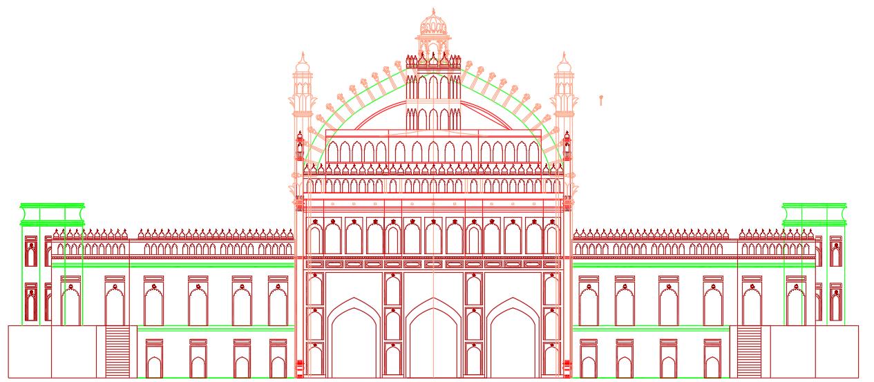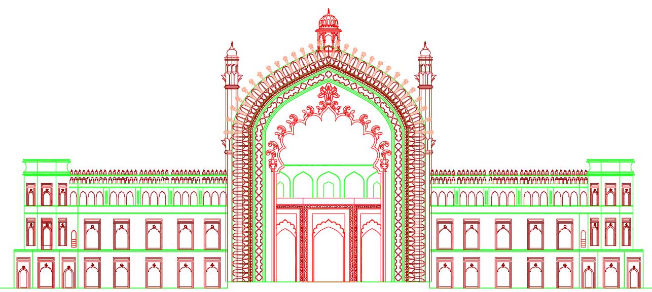 The Rumi Gate, an iconic architectural gateway in Lucknow, does not have a traditional floor plan with multiple rooms or levels but features a grand central archway flanked by smaller niches, all built from red sandstone. This structure, standing at approximately 60 feet, exemplifies Mughal and Awadhi architectural styles with its perfect symmetry, tapering design, and intricate stucco decorations, including floral motifs and calligraphy. The gateway's layout, inspired by the gates of Constantinople, focuses on aesthetic harmony and structural stability, making it a symbol of Lucknow's rich cultural heritage and an enduring tourist attraction.lighting.