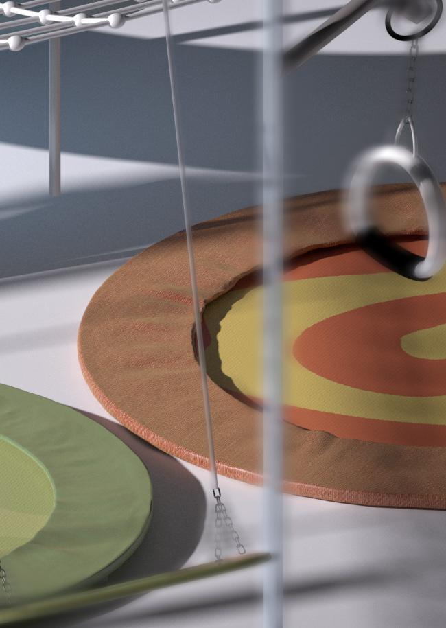 The pattern on the energy-generating trampoline reflects and implies the psychological goals of using smooth curved lines that will aid in the sense of curiosity, activity, and selflessness, while the colors are bright and complimentary giving a modern harmonized appearance and interesting for kids a playing area.