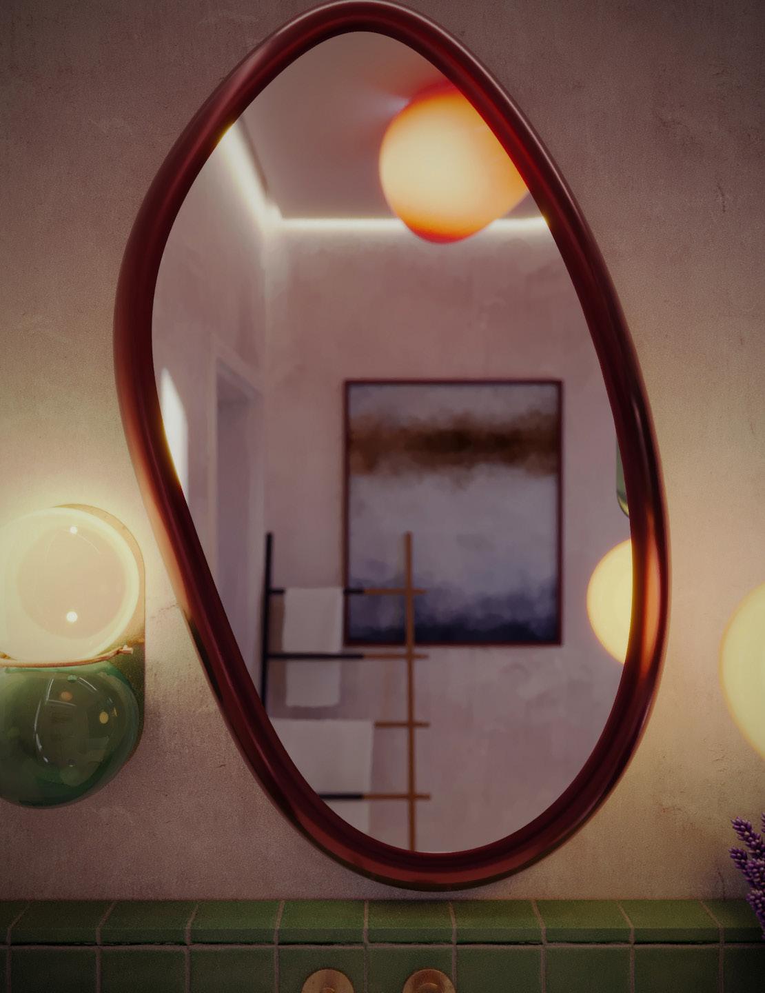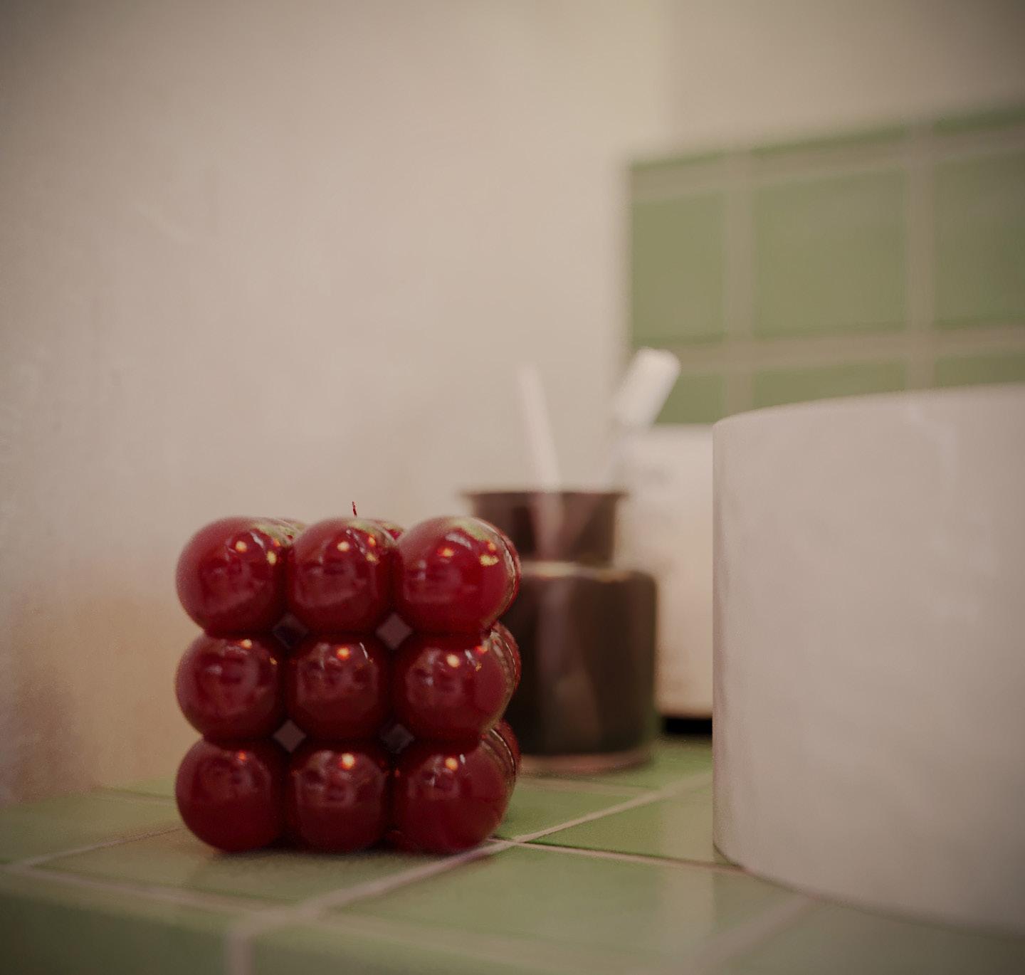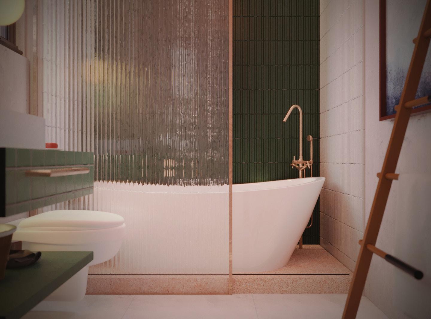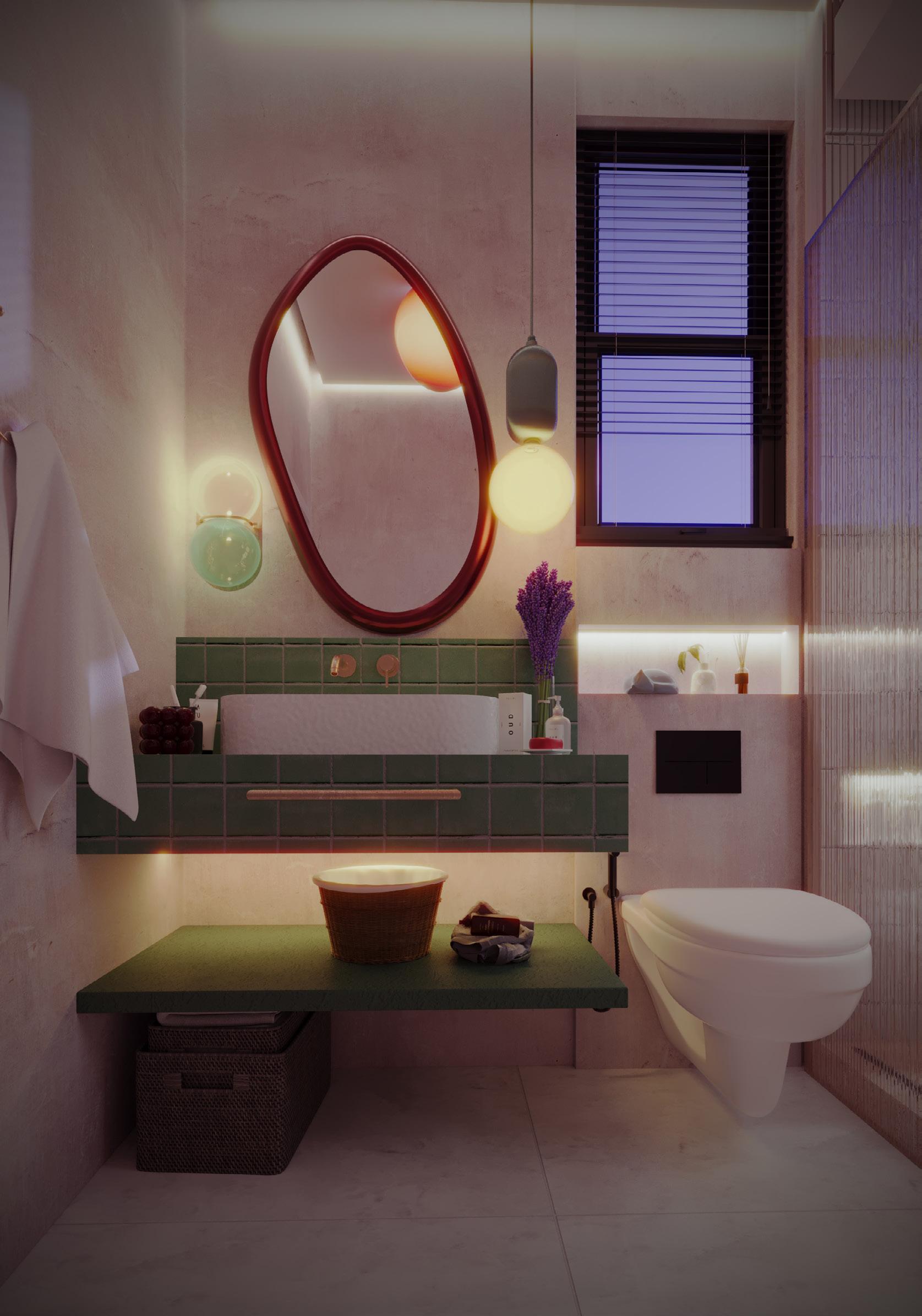 The bathroom an example of my philosophy, with an organic colour scheme featuring green tiles to create a calming ambiance around the bathtub. A naturally curved mirror at the sink adds refinement, while bright maroon accents complement the design. Every detail has been thoughtfully selected to create a luxurious, relaxing experience.