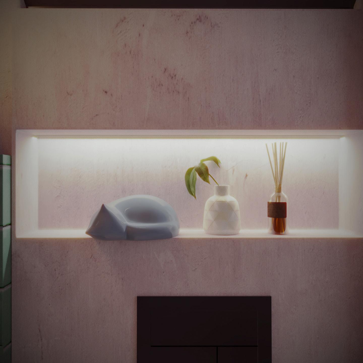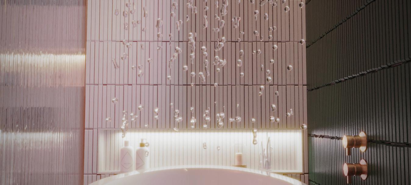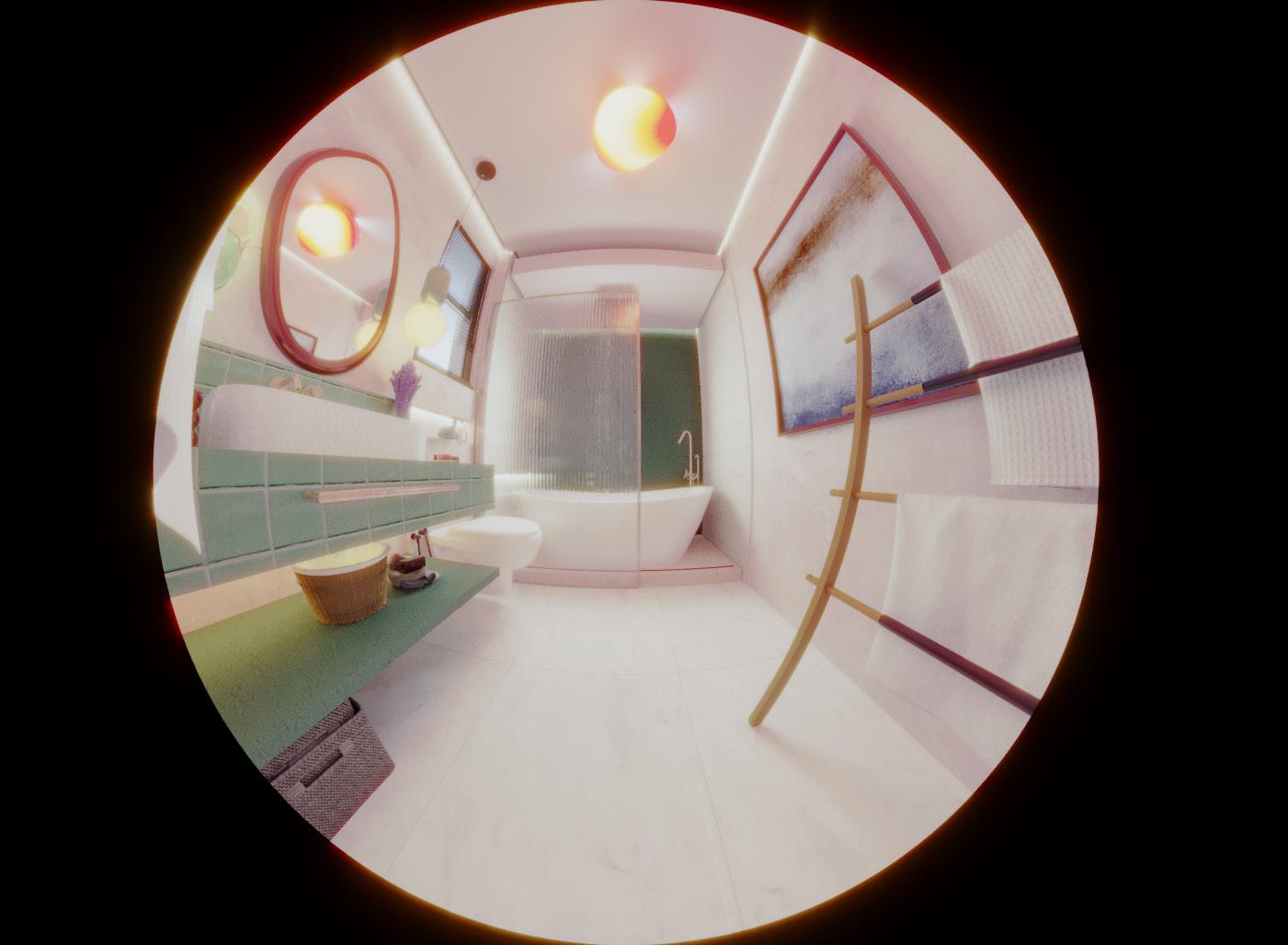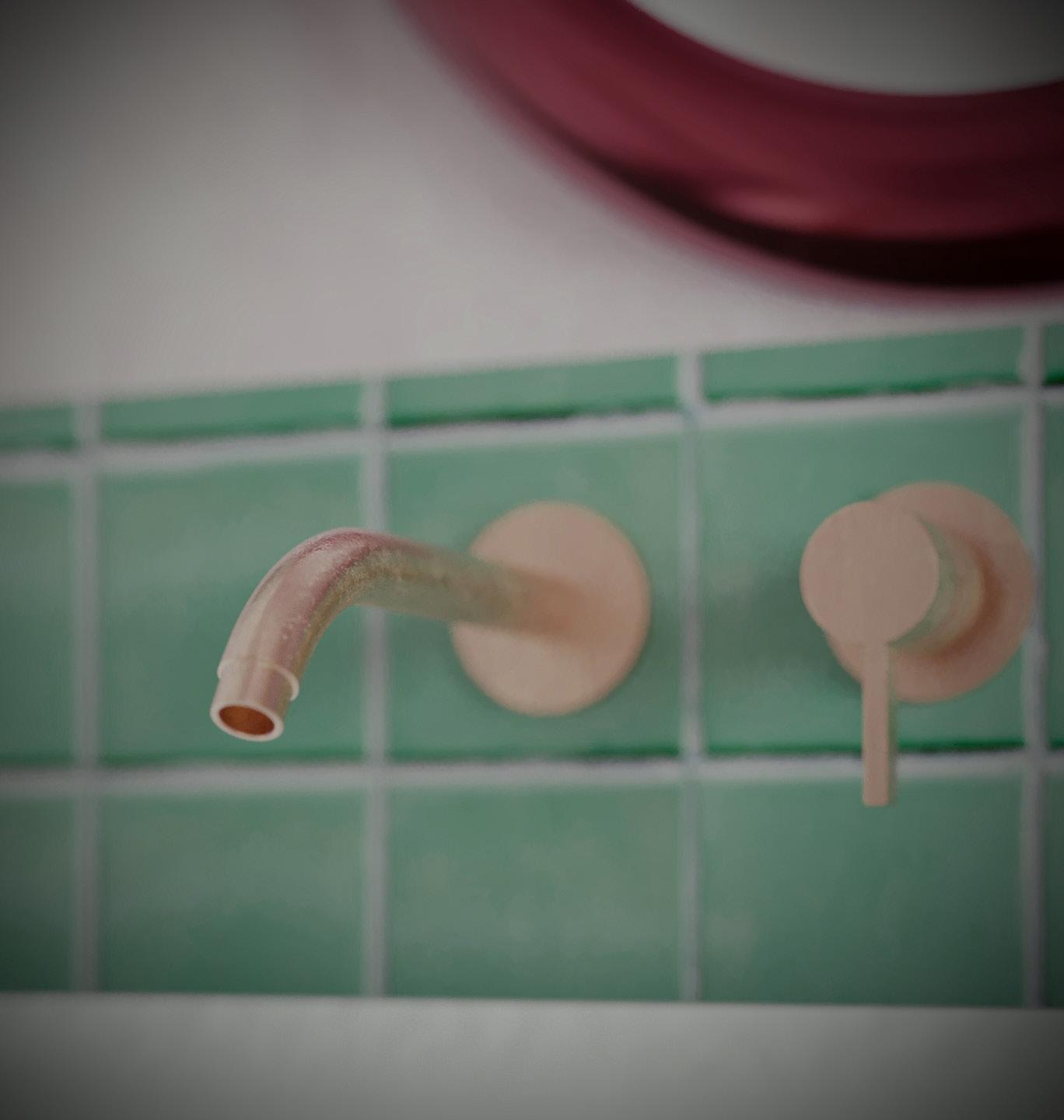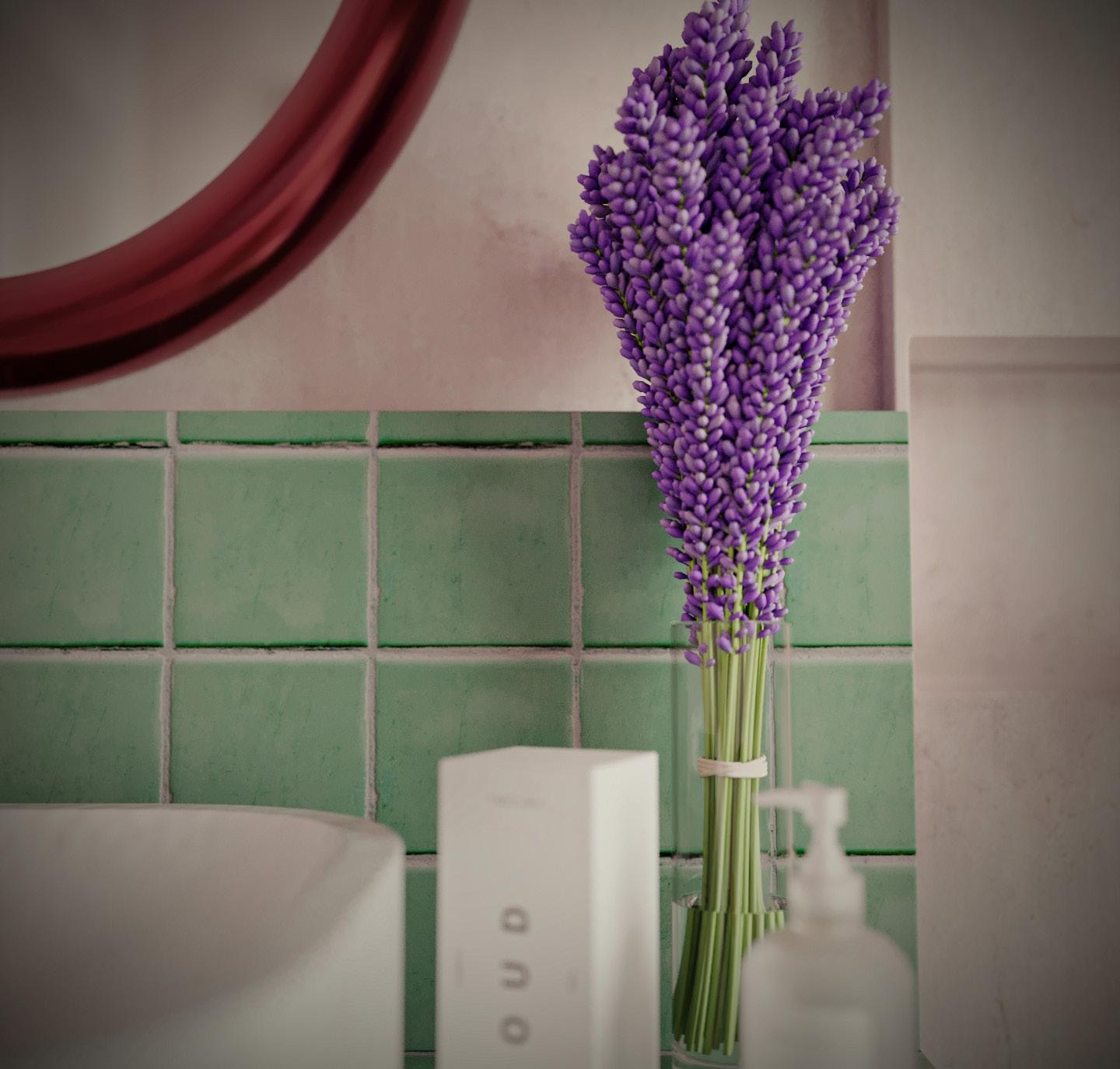 The bathroom an example of my philosophy, with an organic colour scheme featuring green tiles to create a calming ambiance around the bathtub. A naturally curved mirror at the sink adds refinement, while bright maroon accents complement the design. Every detail has been thoughtfully selected to create a luxurious, relaxing experience.
