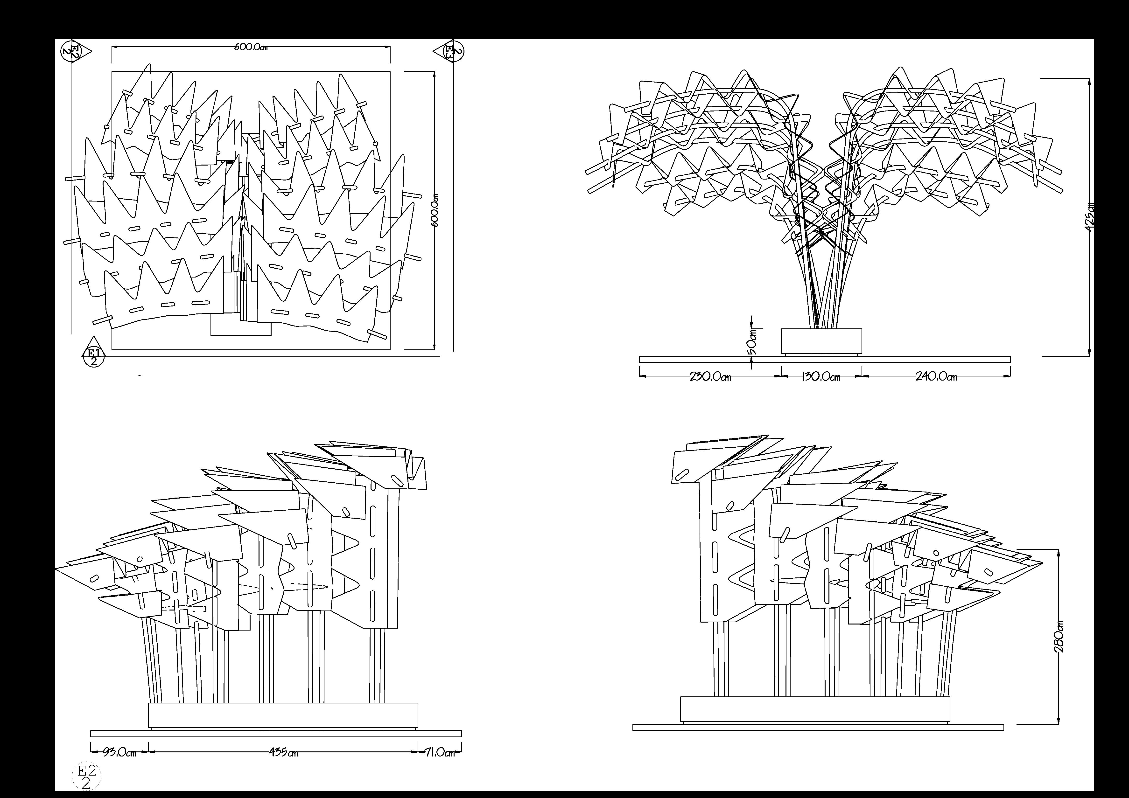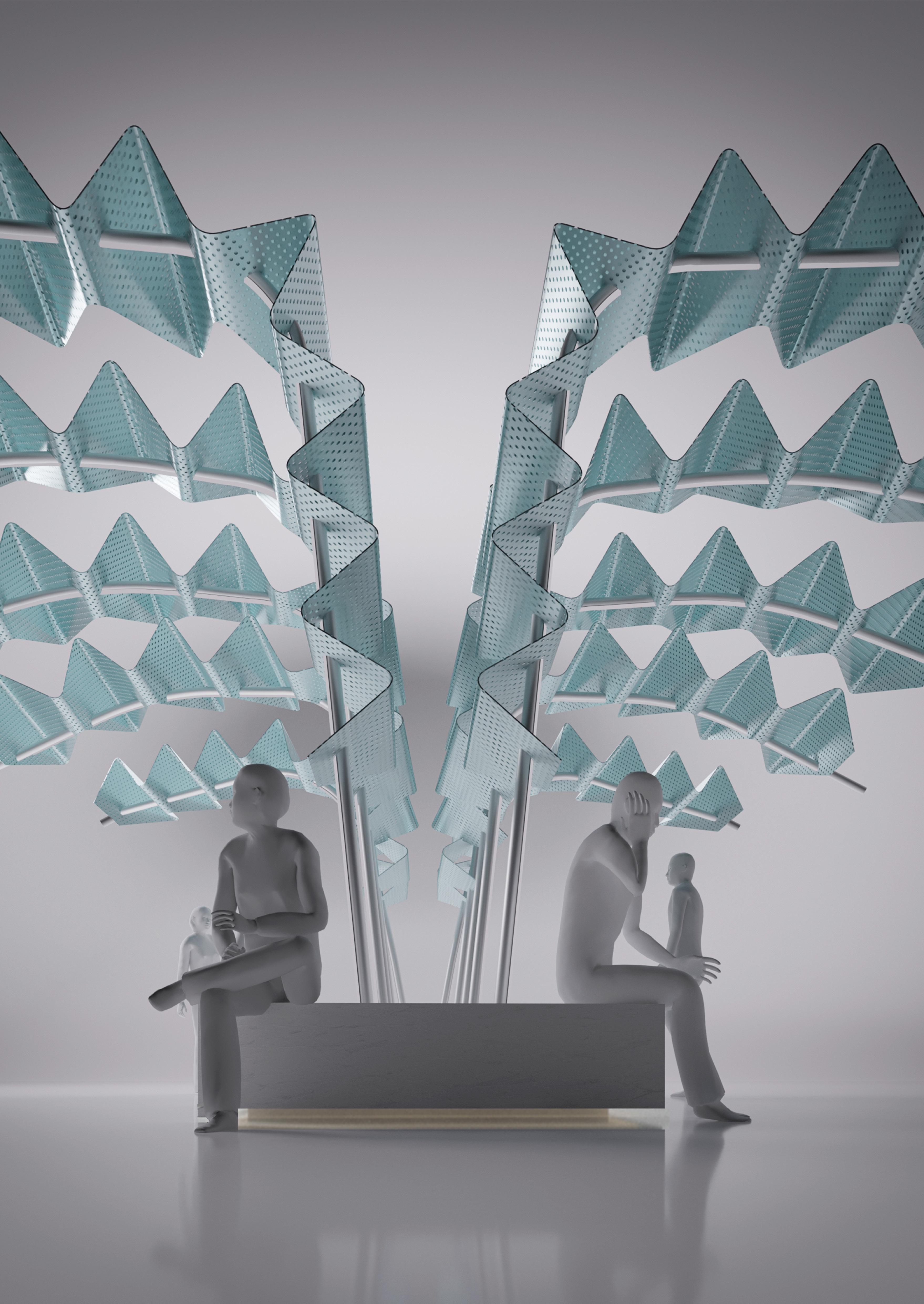 The design was chosen for construction to be displayed in “Dubai Design Week 2021” and then moved to Ajman University campus. The feathers overlap to form the shape of the wing. The rods which represent the skeleton of the bird wings are recovered from construction waste and cut to the desired length and formed to the desired shape. The bench is made of reused steel plates to provide structural stability finished with WPC.