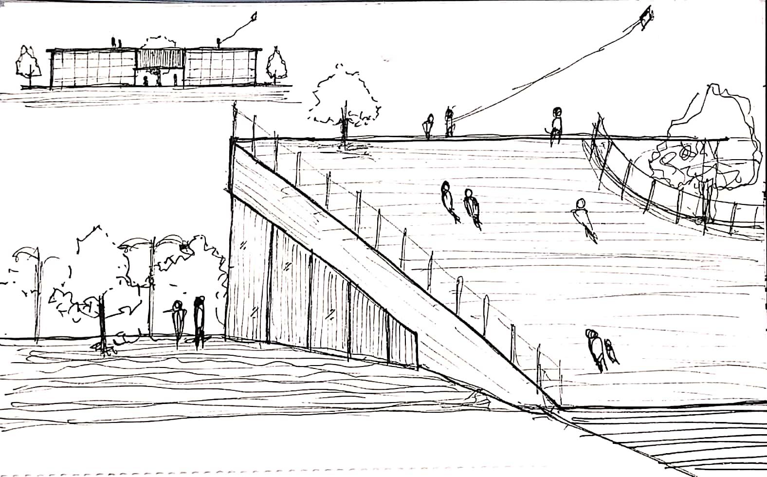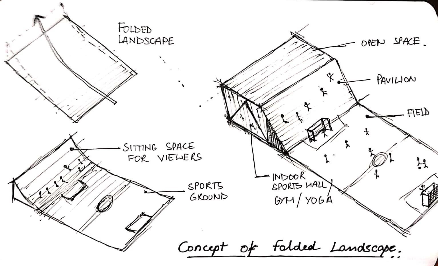The sports field is extended creating a folded field that accomodates indoor sports and games facilities underneath. A courtyard is created which makes the underneath space more interesting and playful.