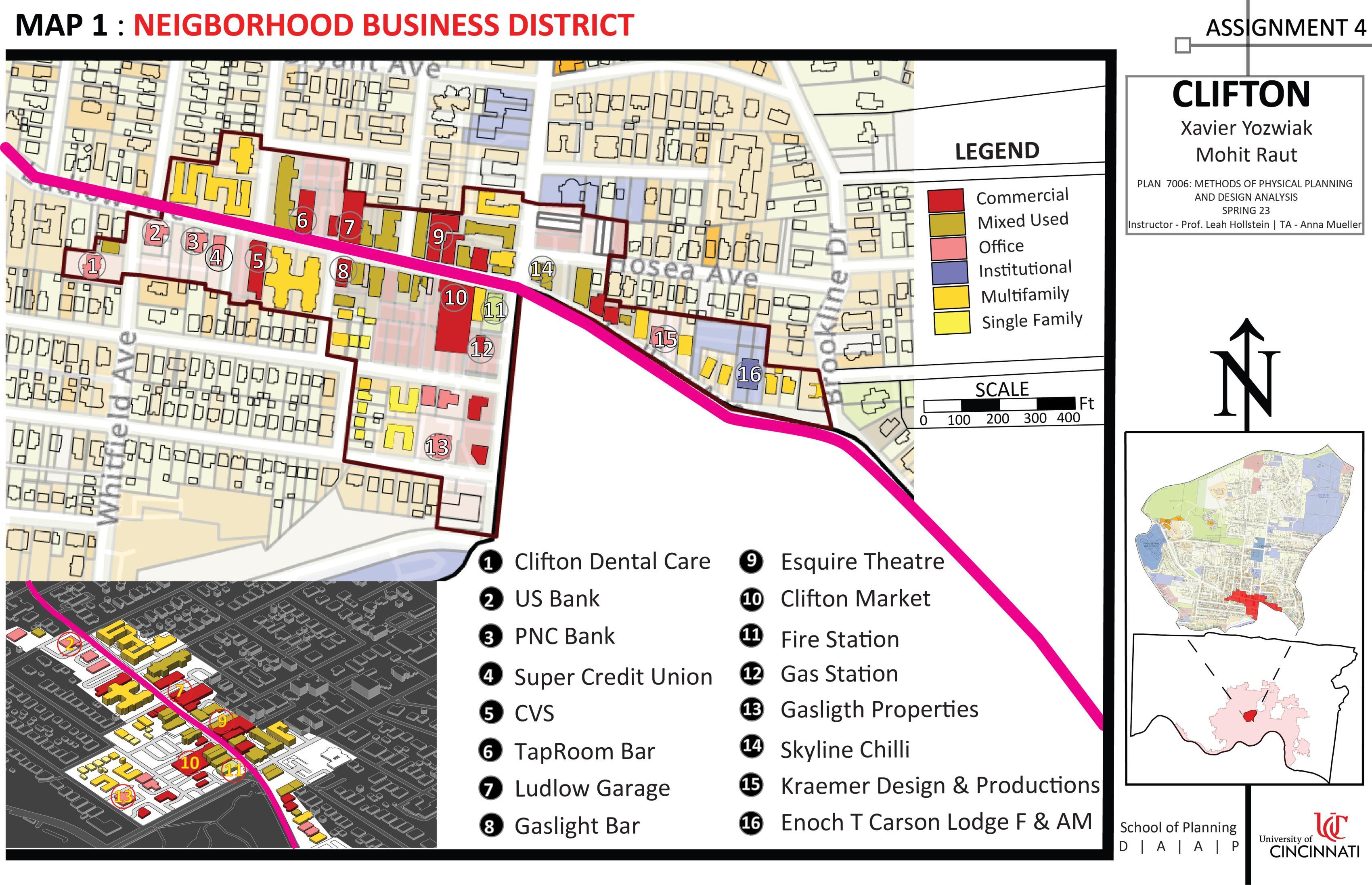 A semester long semi-studio class where we learned what are different types of neighborhood analysis process and how we can use those techniques for various Community Plans. For this class purpose I along with one classmate worked in a group on the neighborhood of Clifton Neighborhood in Cincinnati
