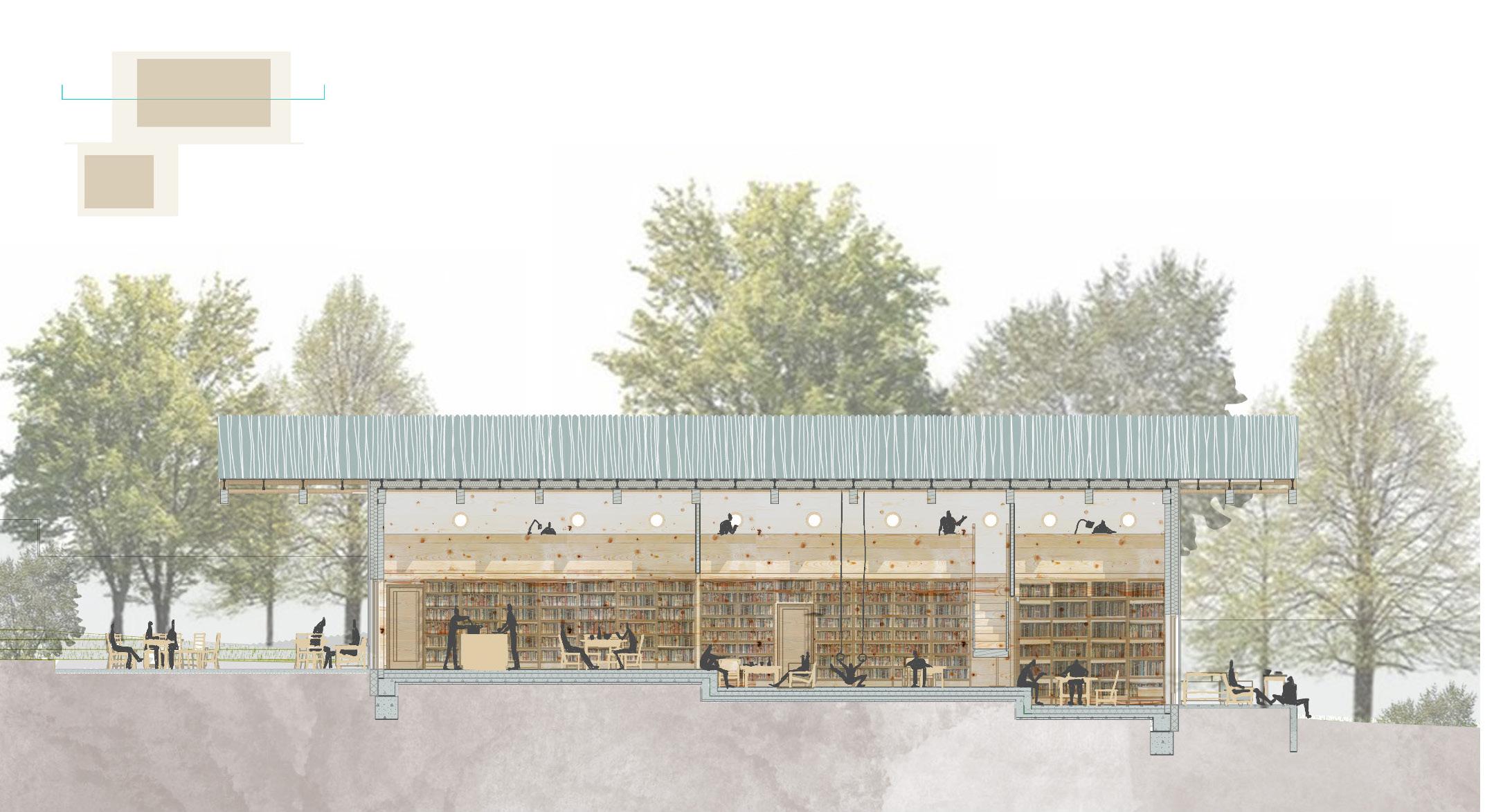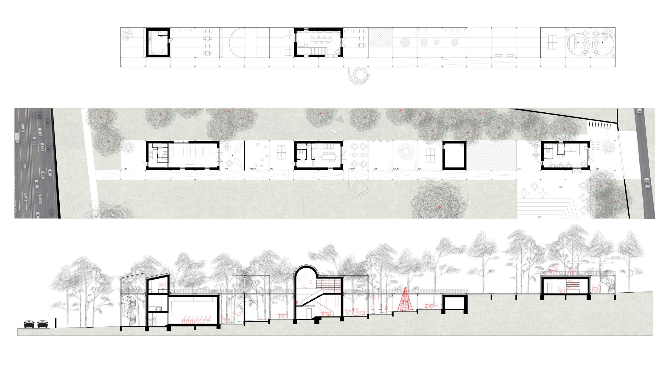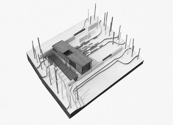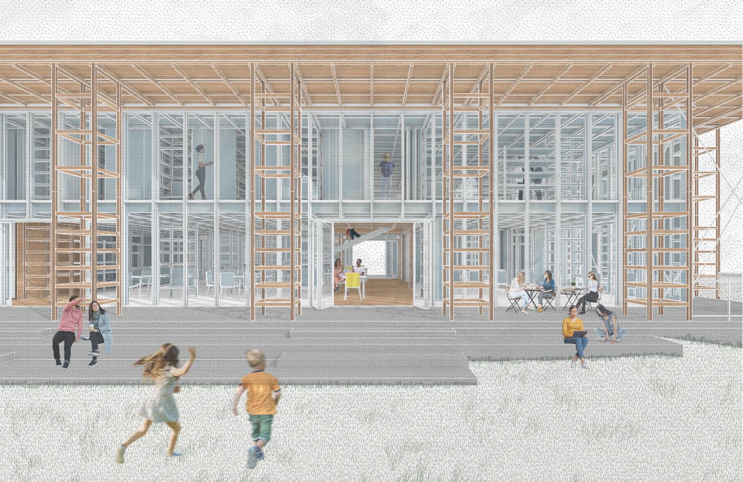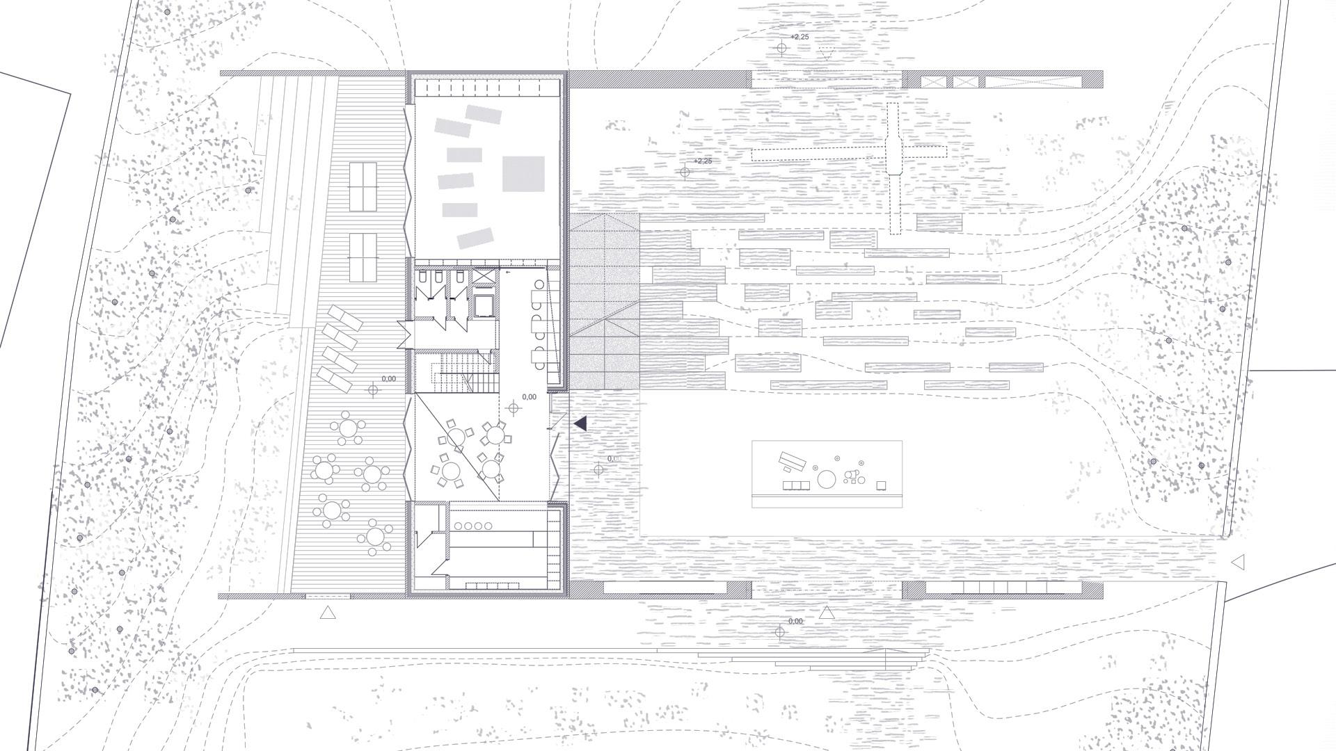A lábakon álló hosszanti épület ellebegtetve jelenik meg a telken, így nem bolygatja meg a jelenlegi állapotot. A forma és az elhelyezkedés a terület tengelyes karakteréhez igazodik. Az épületben helyet kap egy olvasó/ tanuló tér, büfé/bár terasszal és mosdók.