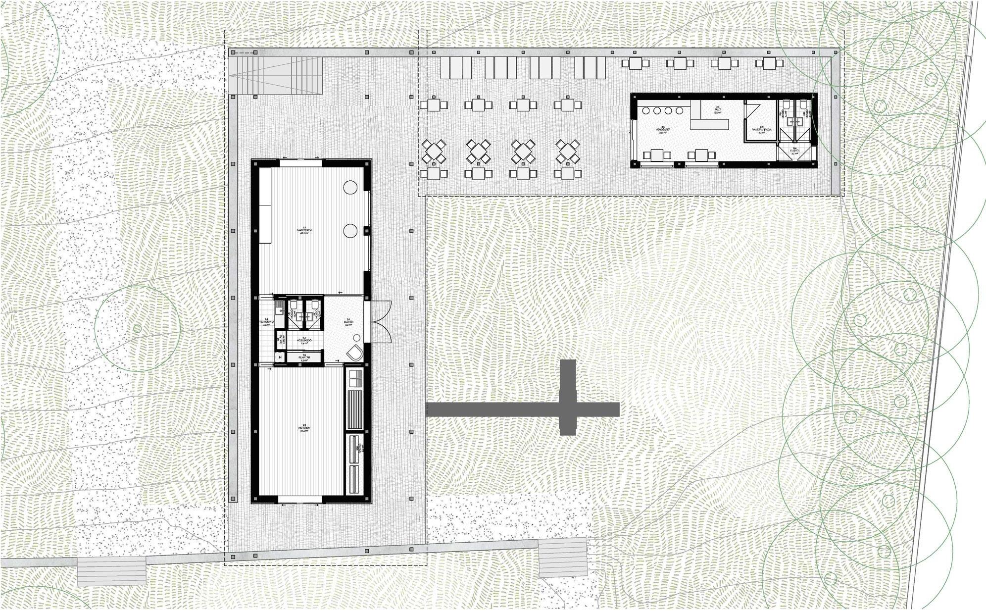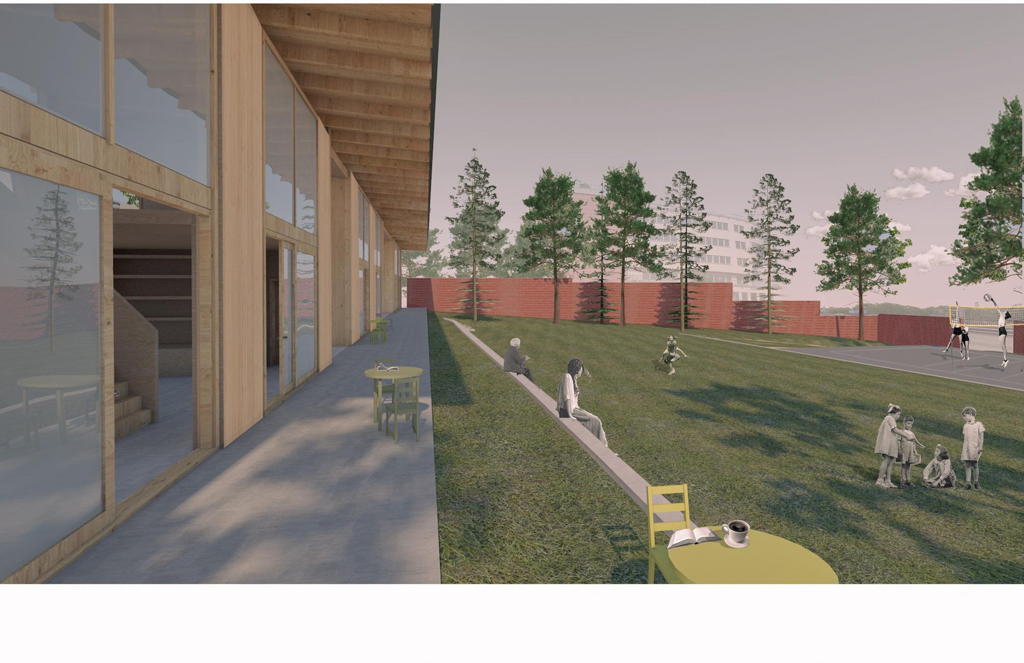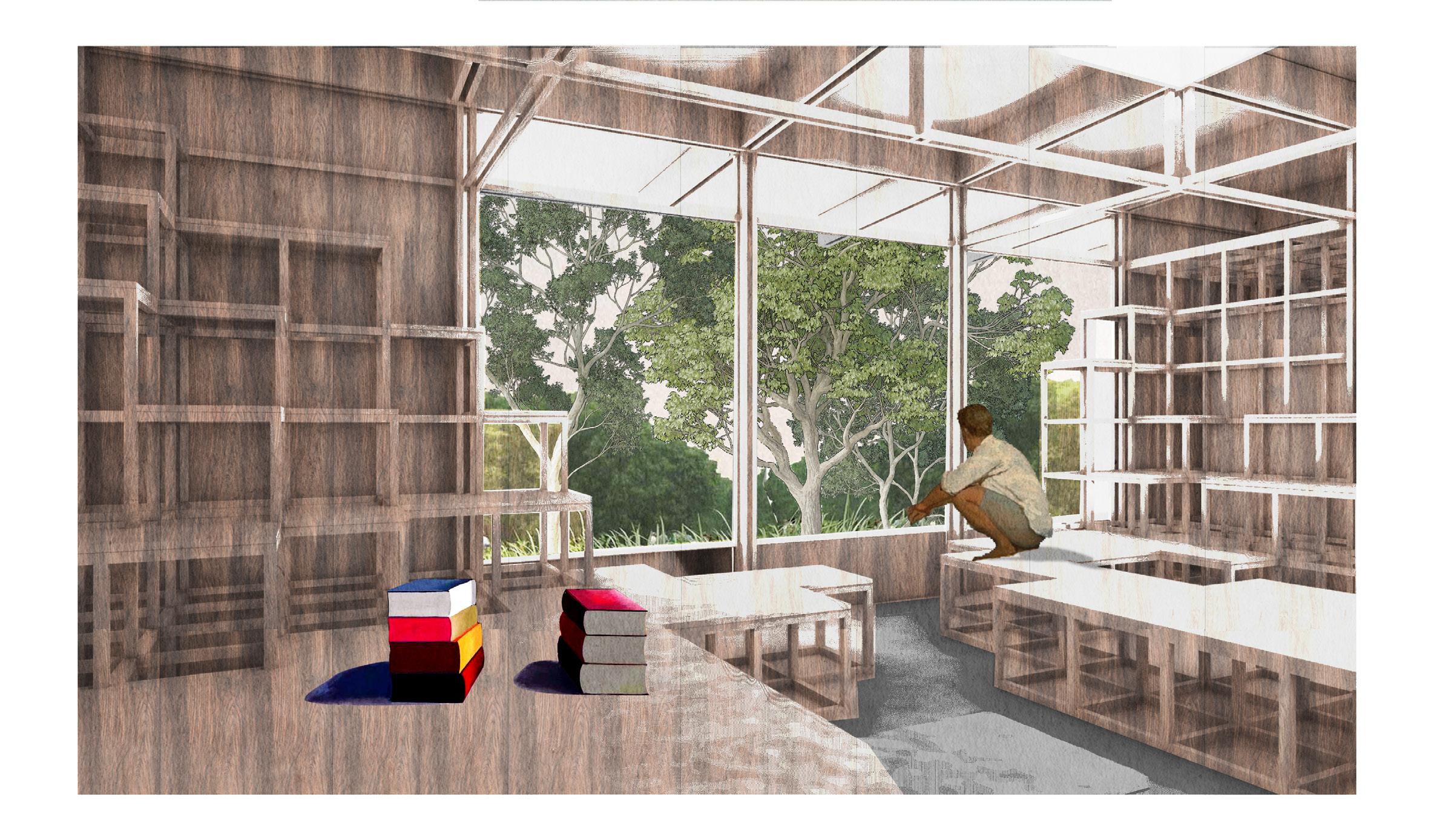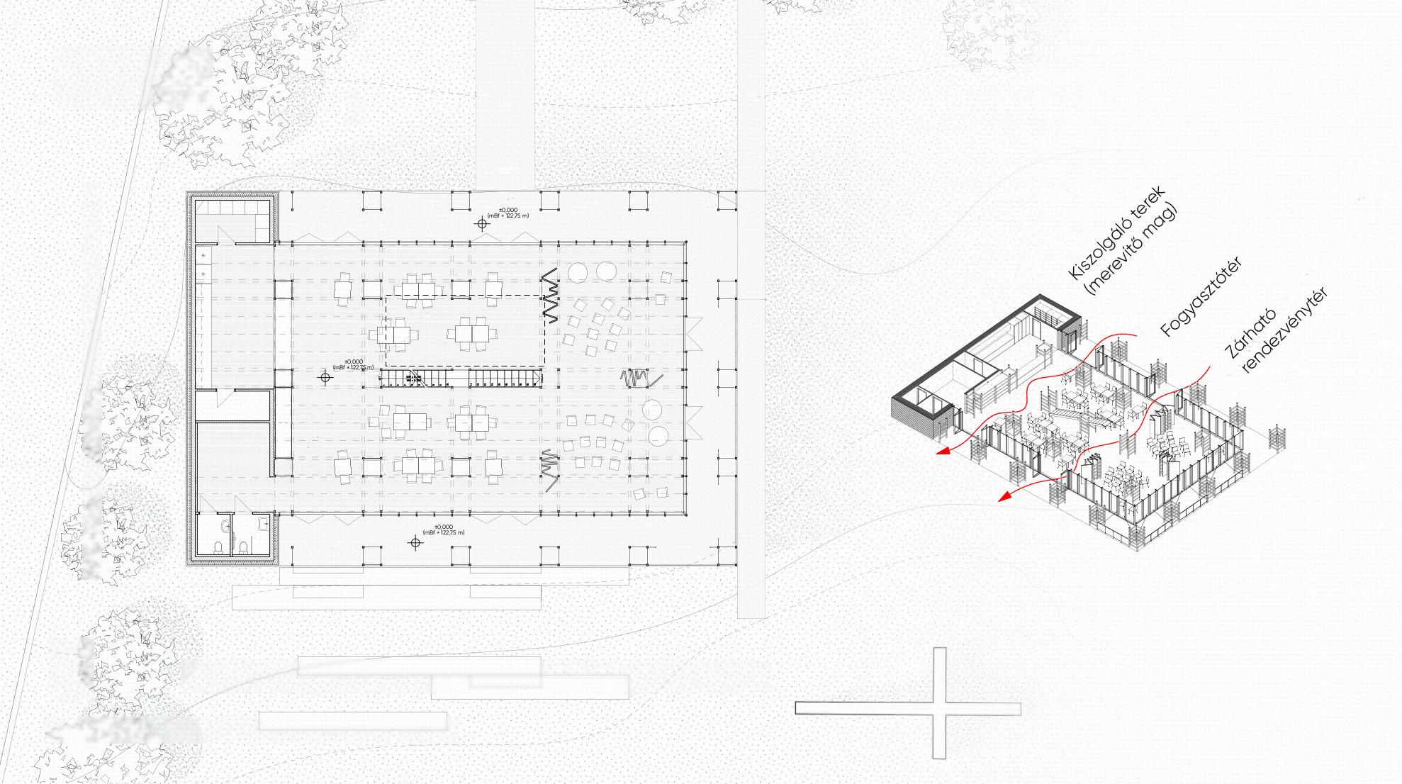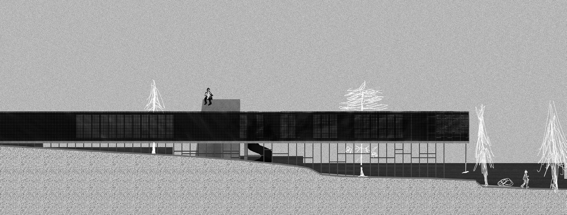 A lábakon álló hosszanti épület ellebegtetve jelenik meg a telken, így nem bolygatja meg a jelenlegi állapotot. A forma és az elhelyezkedés a terület tengelyes karakteréhez igazodik. Az épületben helyet kap egy olvasó/ tanuló tér, büfé/bár terasszal és mosdók.