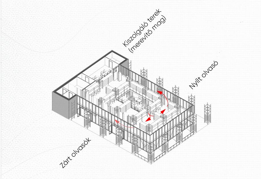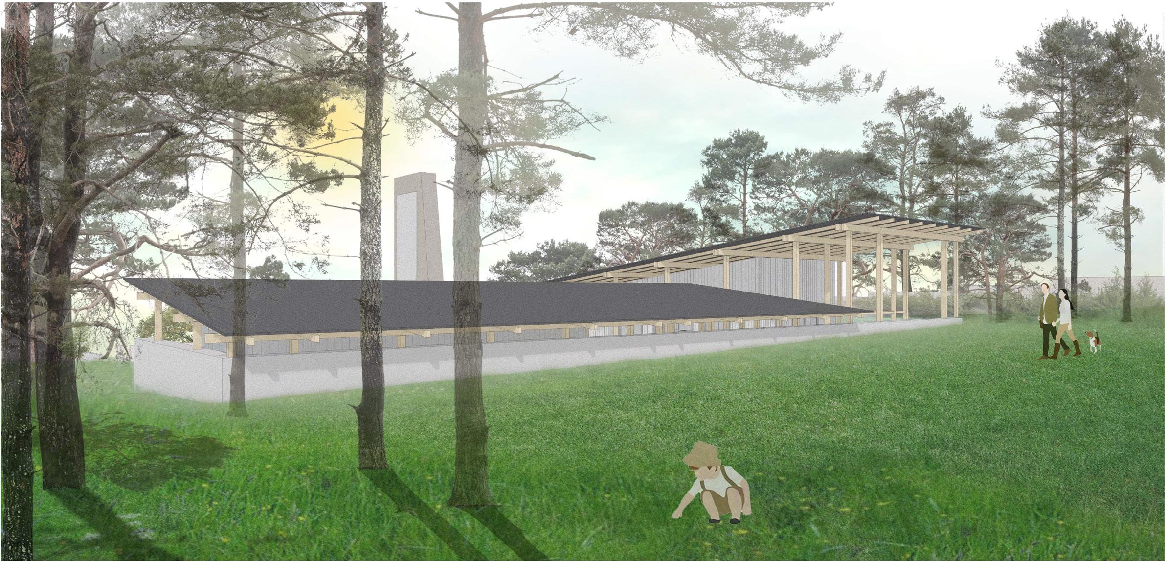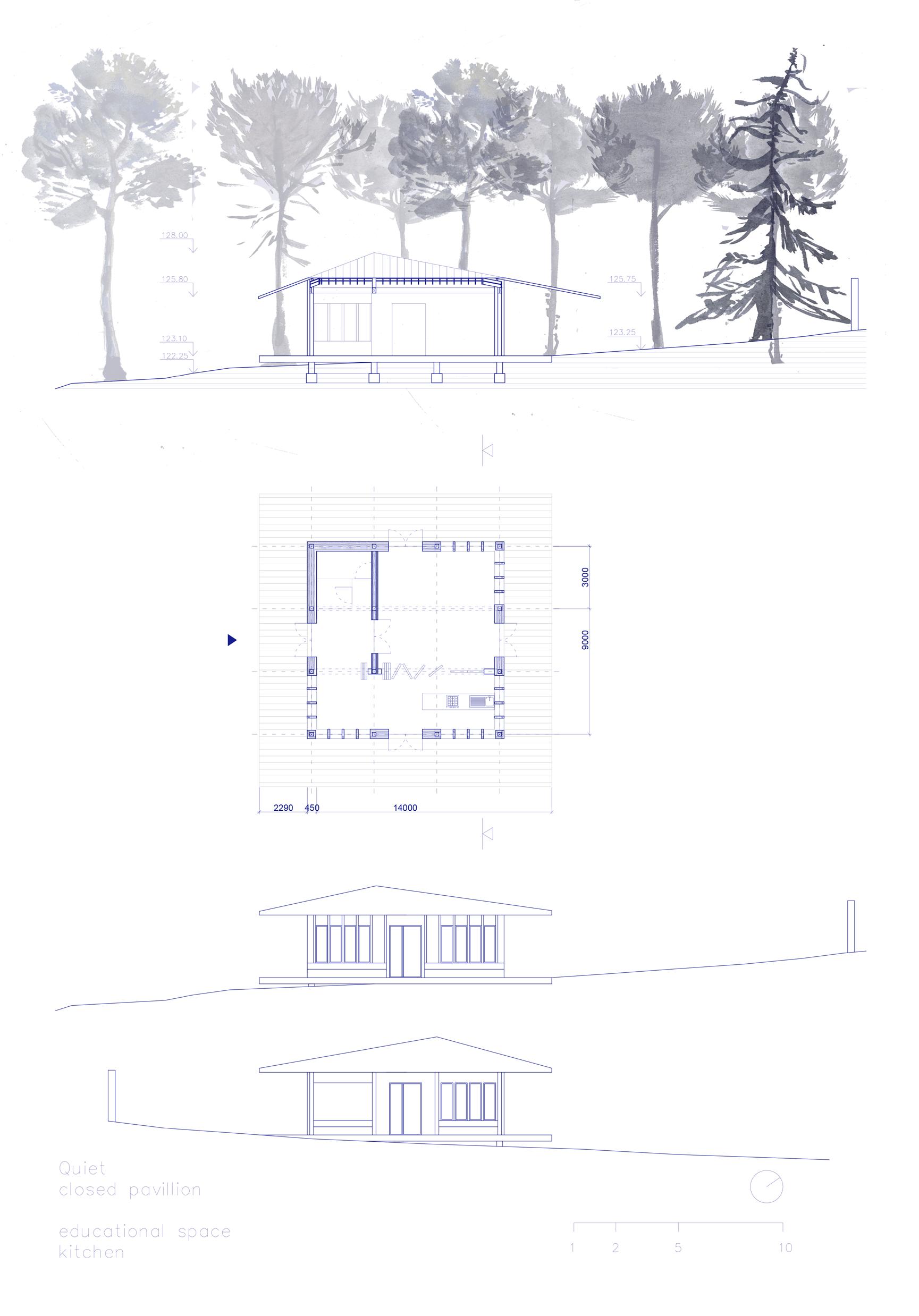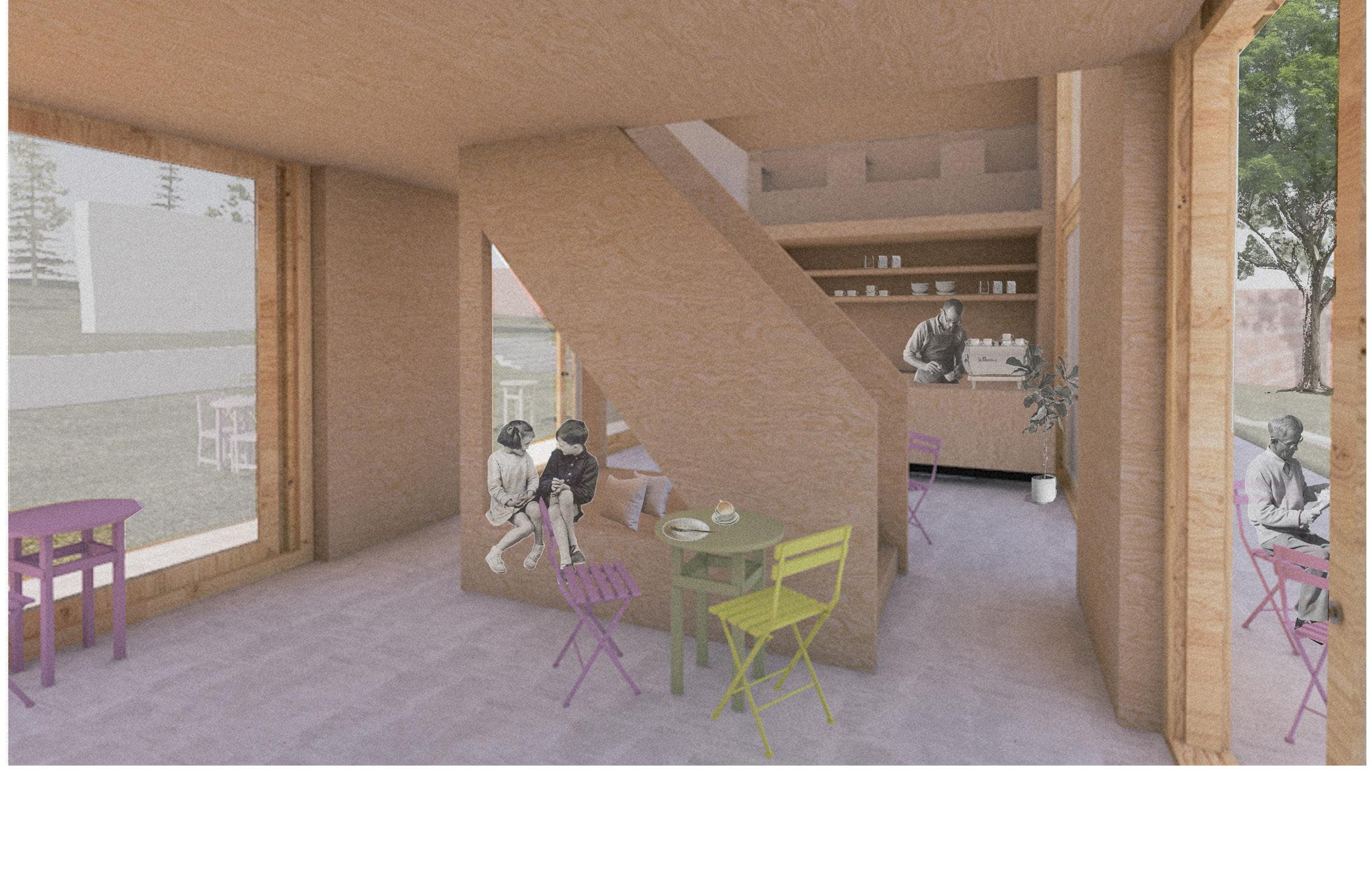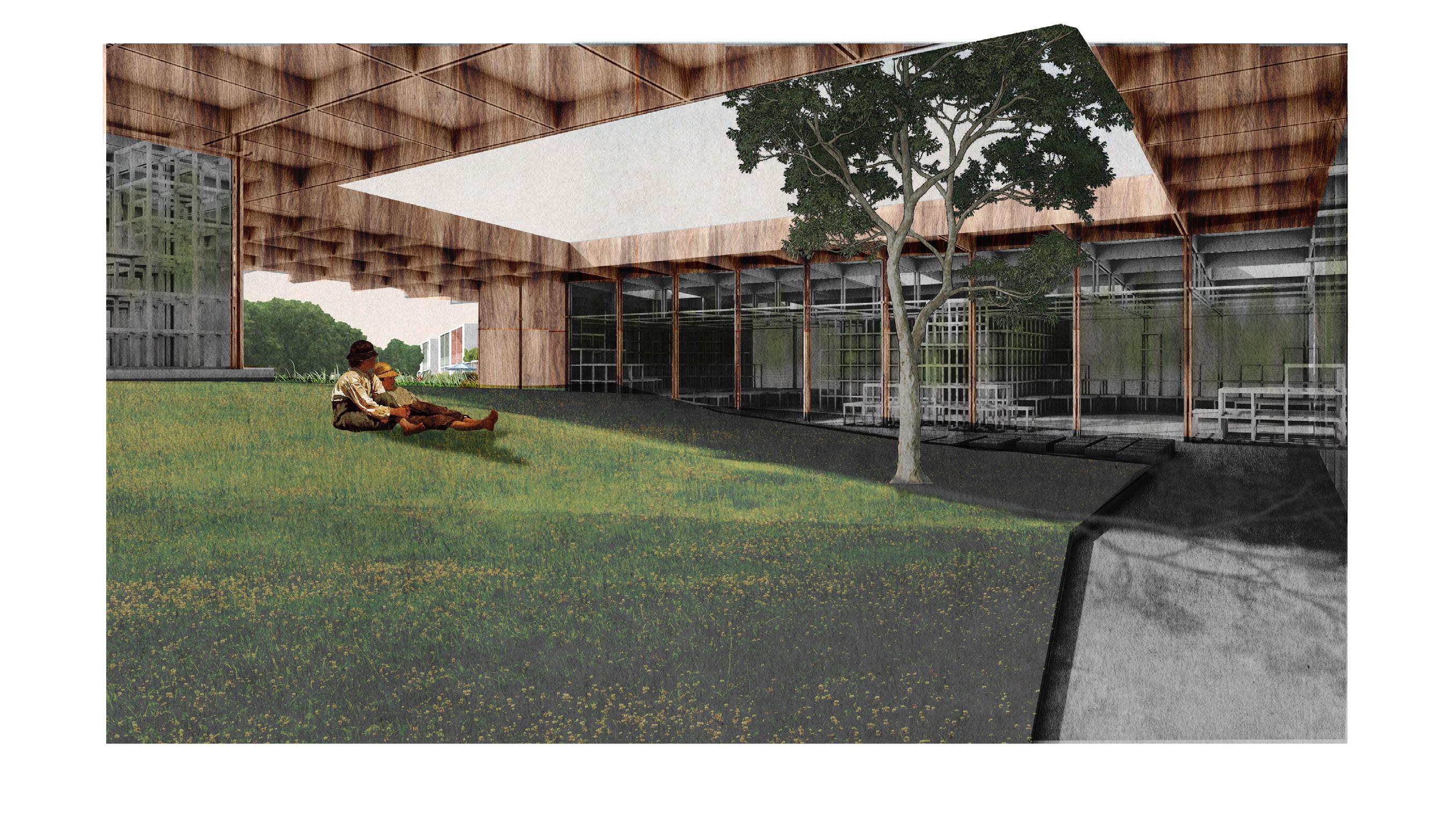 A lábakon álló hosszanti épület ellebegtetve jelenik meg a telken, így nem bolygatja meg a jelenlegi állapotot. A forma és az elhelyezkedés a terület tengelyes karakteréhez igazodik. Az épületben helyet kap egy olvasó/ tanuló tér, büfé/bár terasszal és mosdók.
