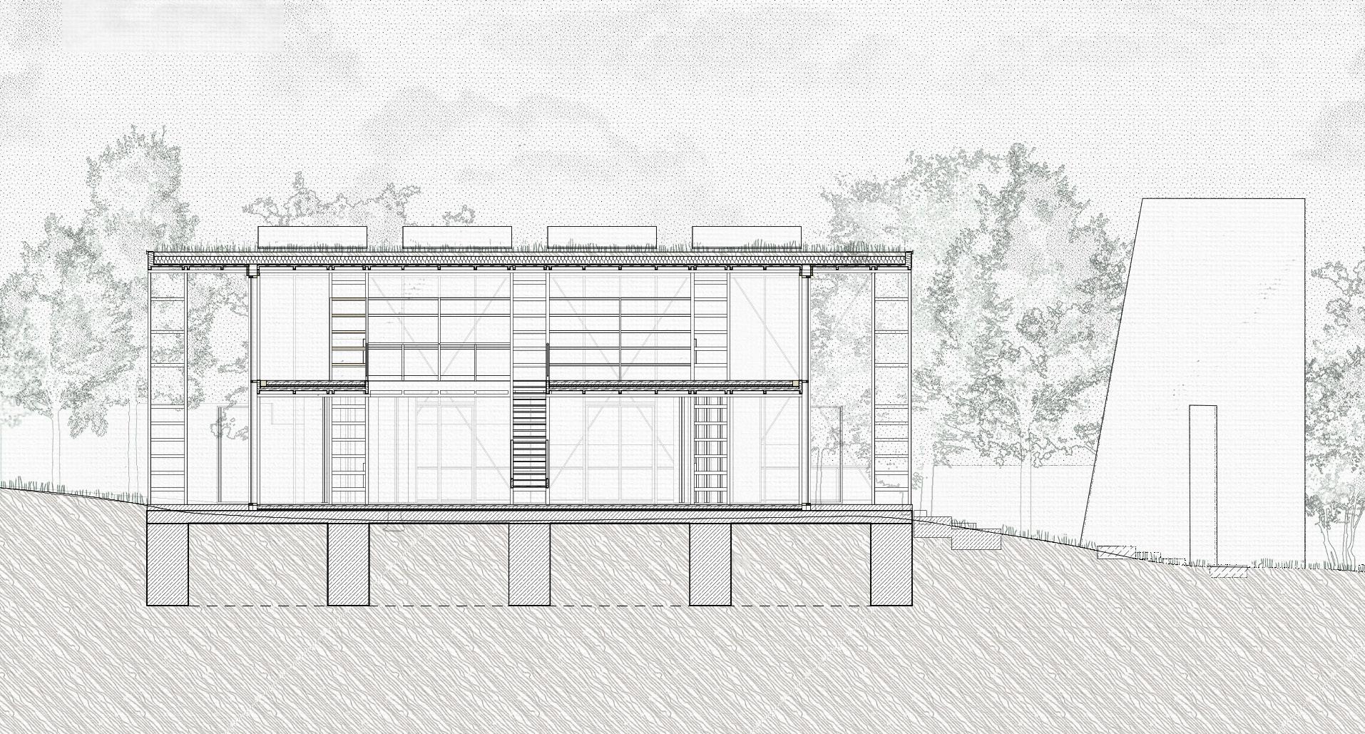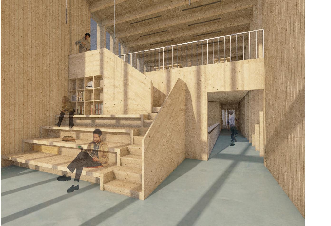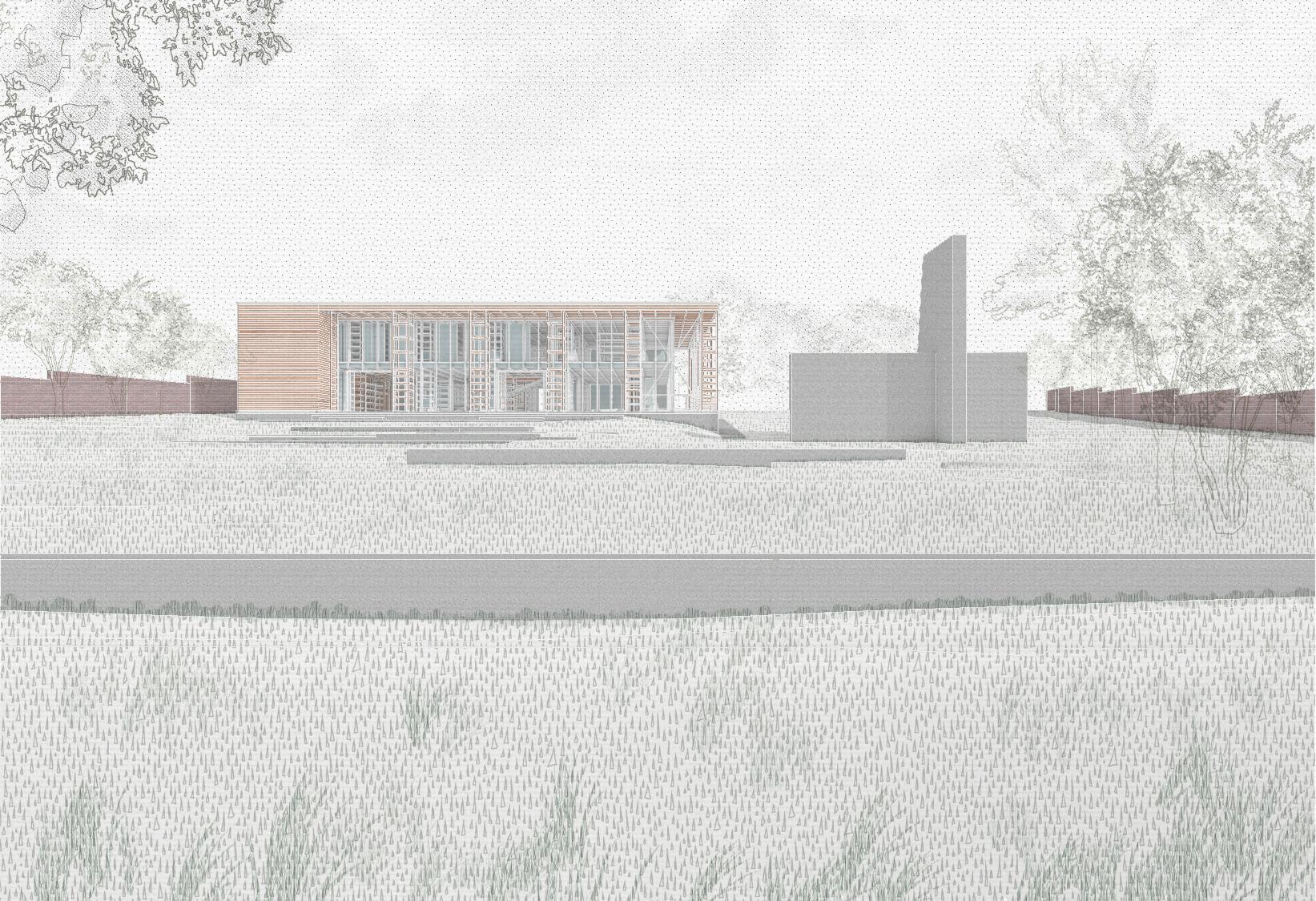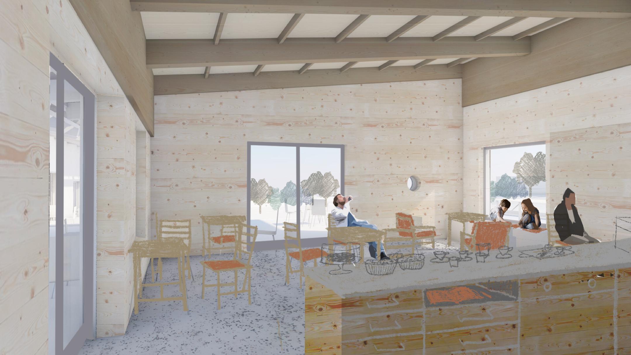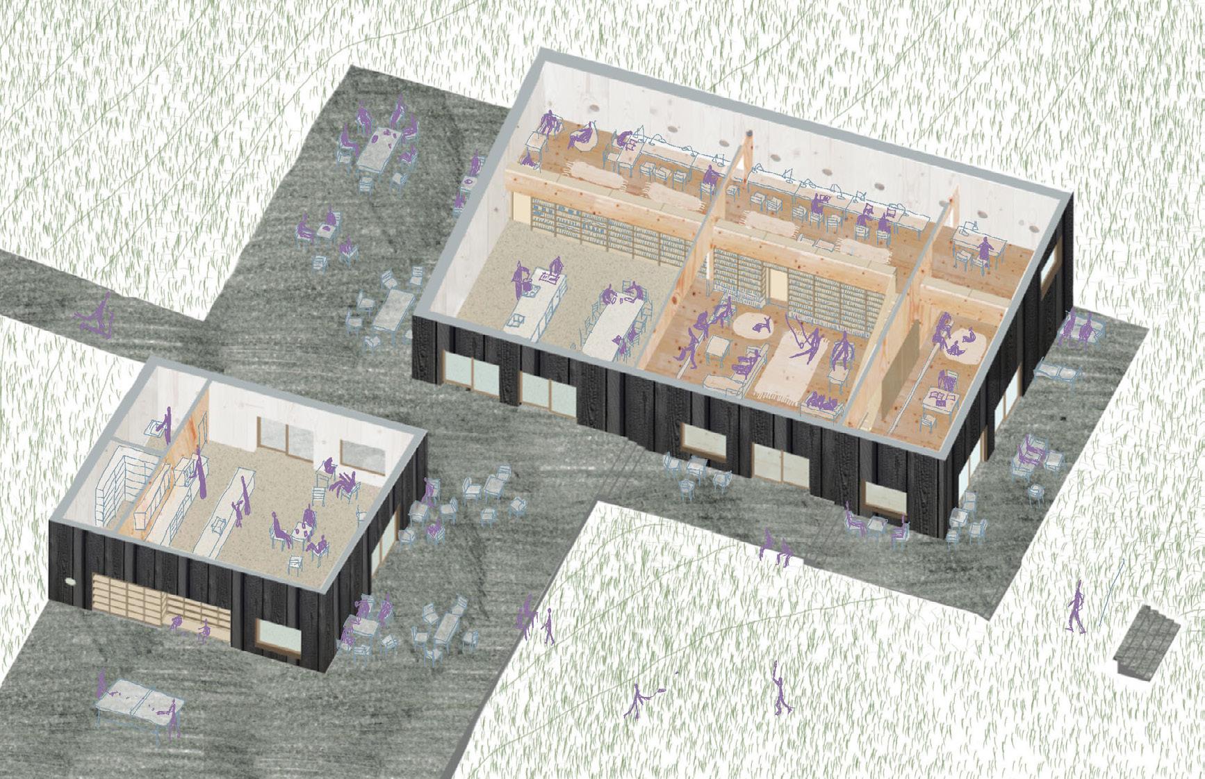 A lábakon álló hosszanti épület ellebegtetve jelenik meg a telken, így nem bolygatja meg a jelenlegi állapotot. A forma és az elhelyezkedés a terület tengelyes karakteréhez igazodik. Az épületben helyet kap egy olvasó/ tanuló tér, büfé/bár terasszal és mosdók.