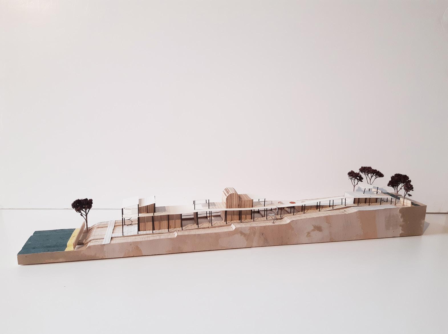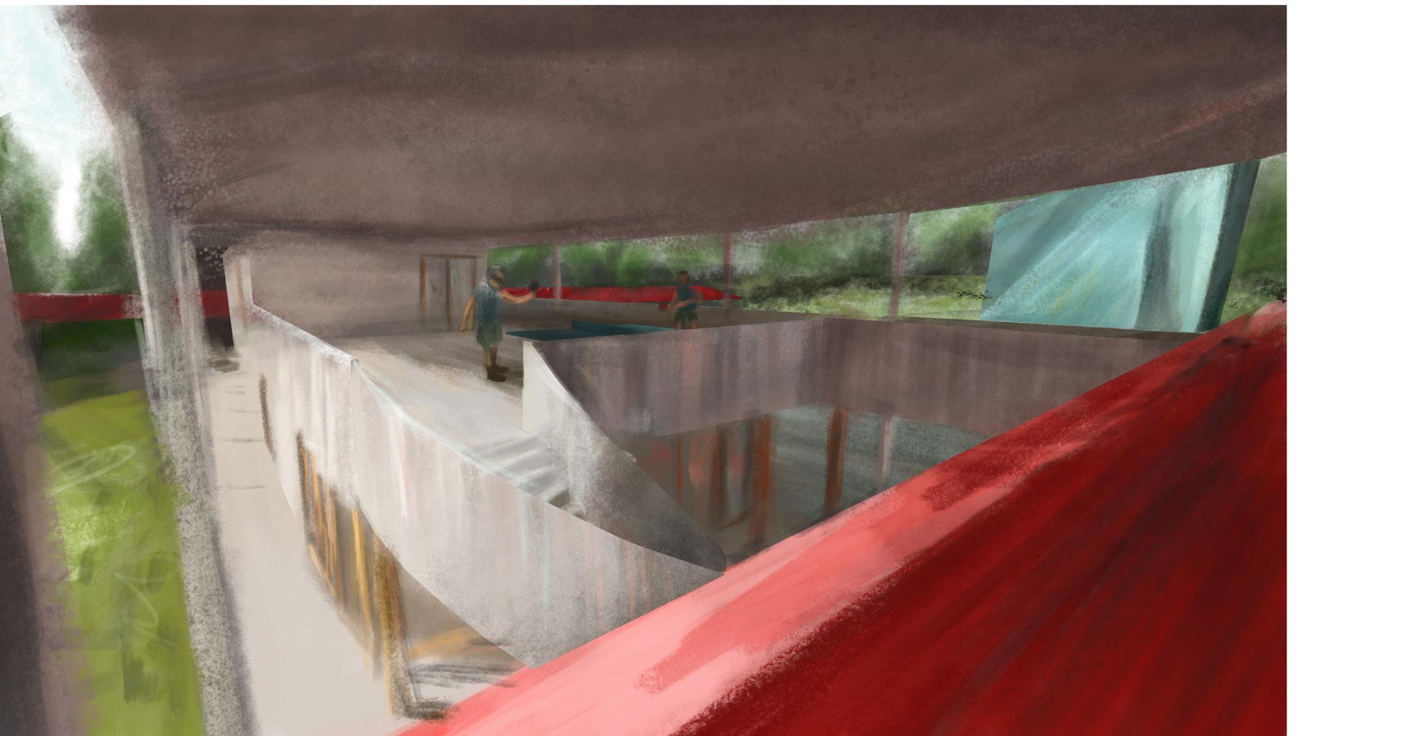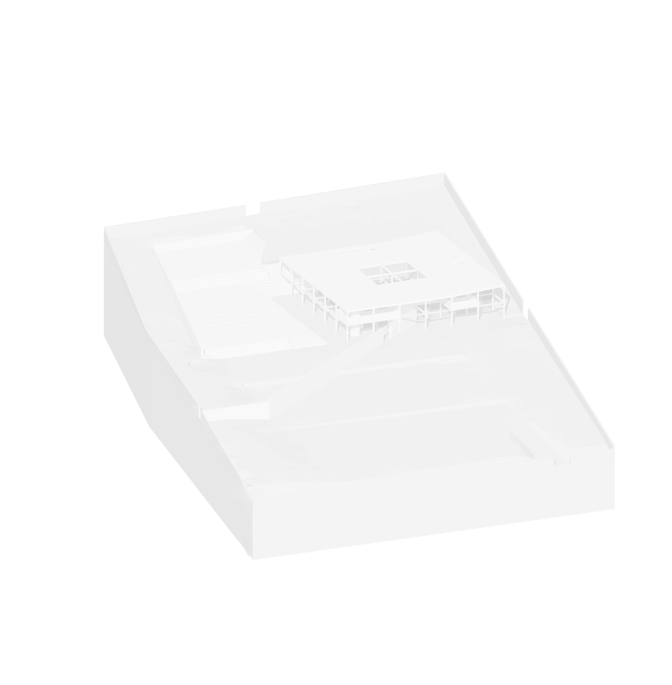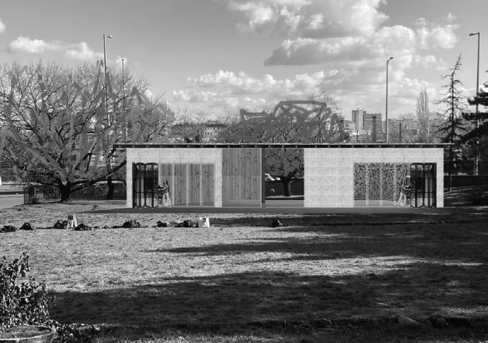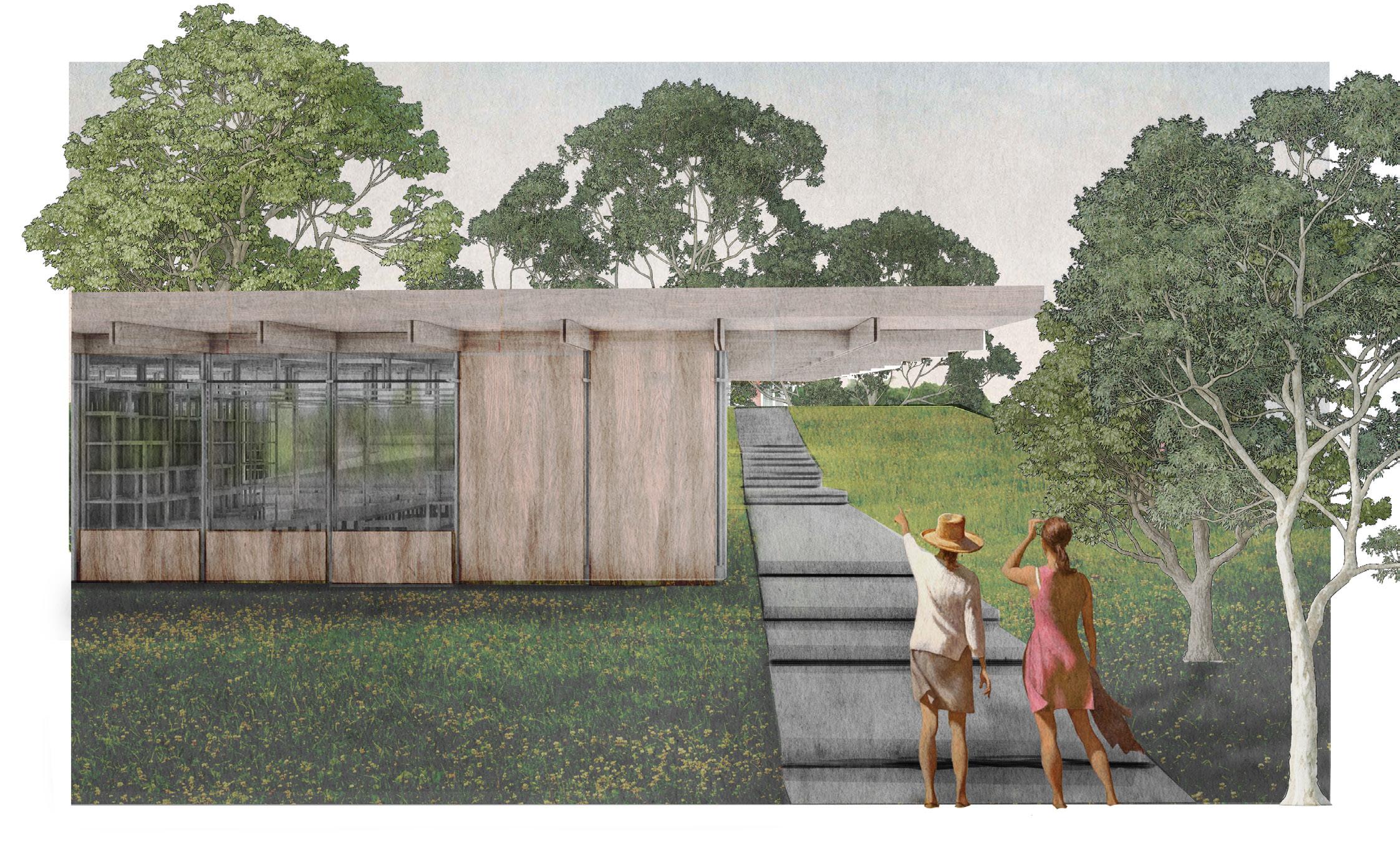 A lábakon álló hosszanti épület ellebegtetve jelenik meg a telken, így nem bolygatja meg a jelenlegi állapotot. A forma és az elhelyezkedés a terület tengelyes karakteréhez igazodik. Az épületben helyet kap egy olvasó/ tanuló tér, büfé/bár terasszal és mosdók.