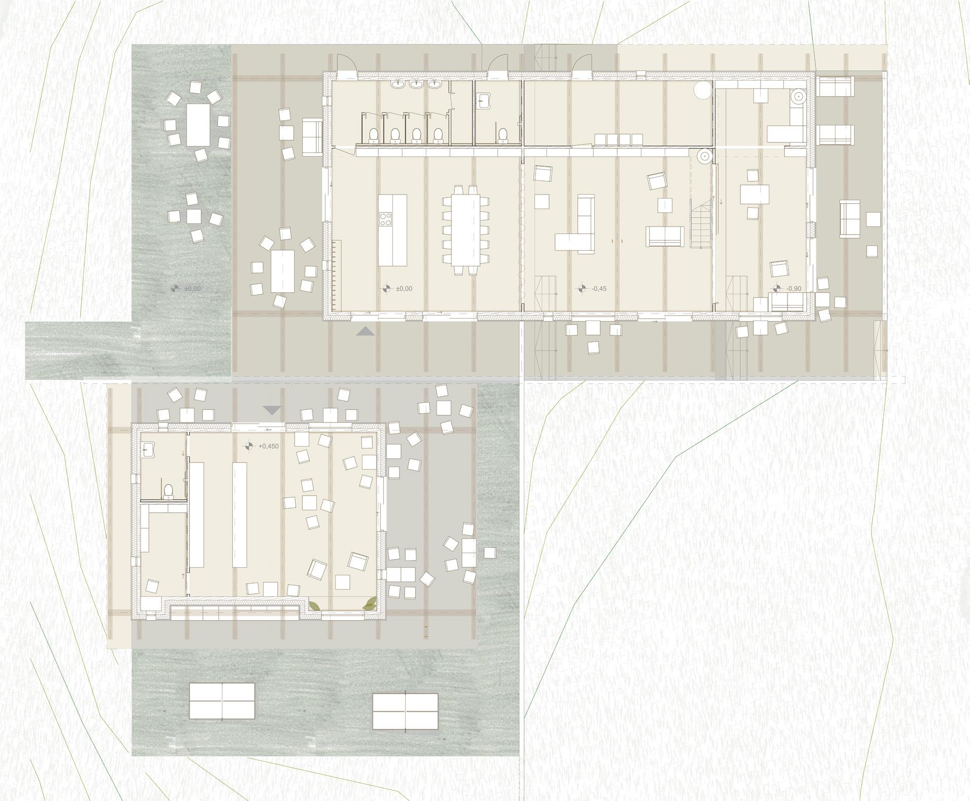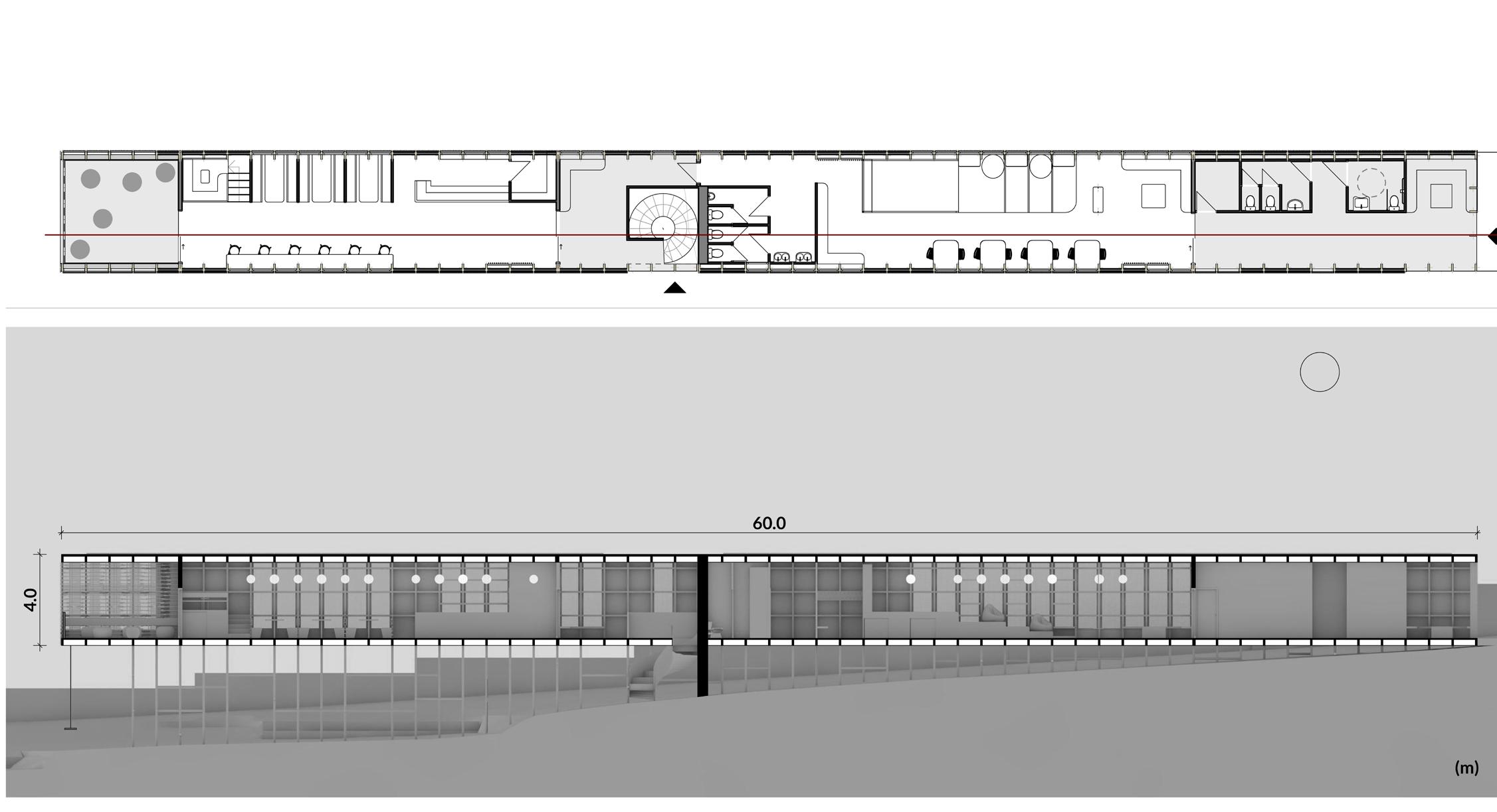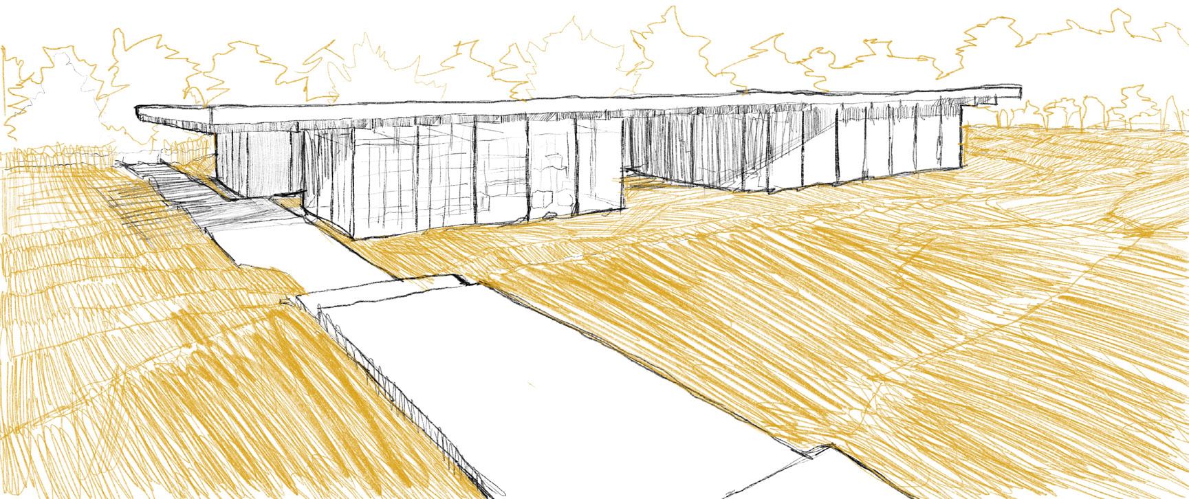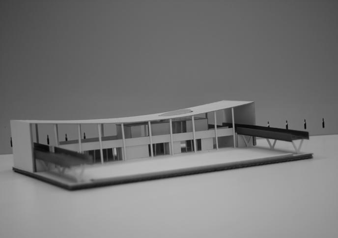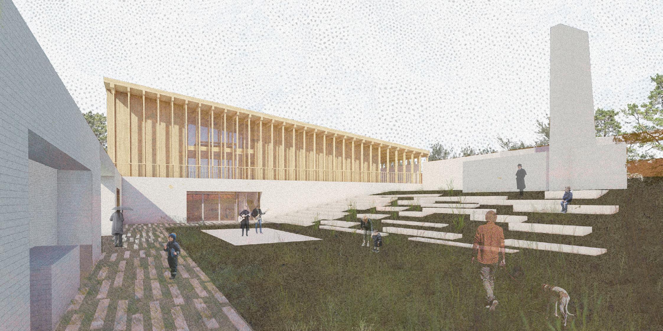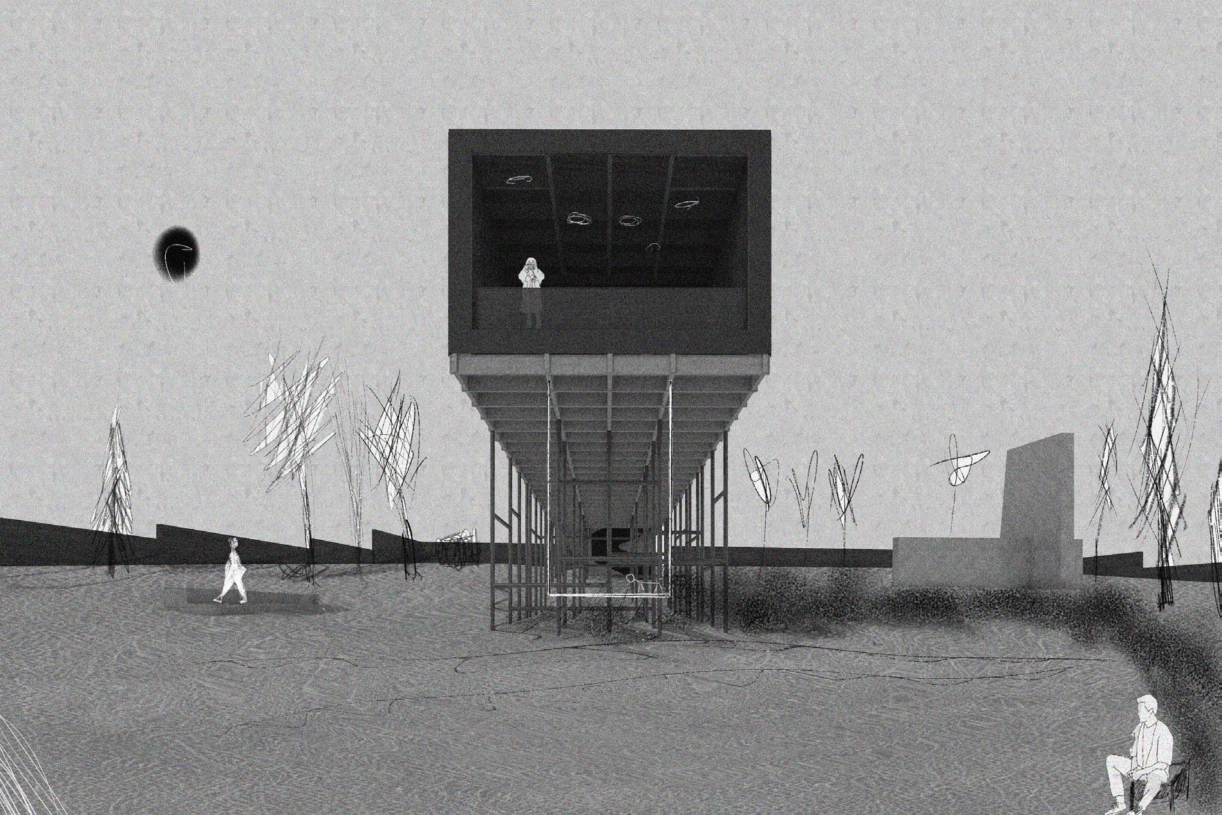 A lábakon álló hosszanti épület ellebegtetve jelenik meg a telken, így nem bolygatja meg a jelenlegi állapotot. A forma és az elhelyezkedés a terület tengelyes karakteréhez igazodik. Az épületben helyet kap egy olvasó/ tanuló tér, büfé/bár terasszal és mosdók.