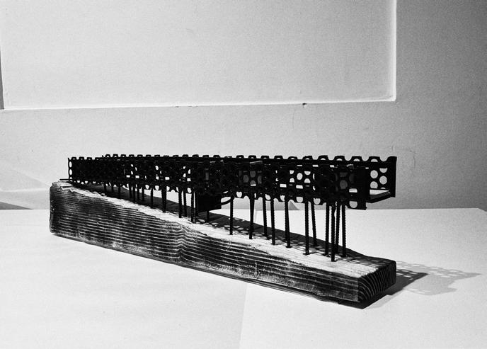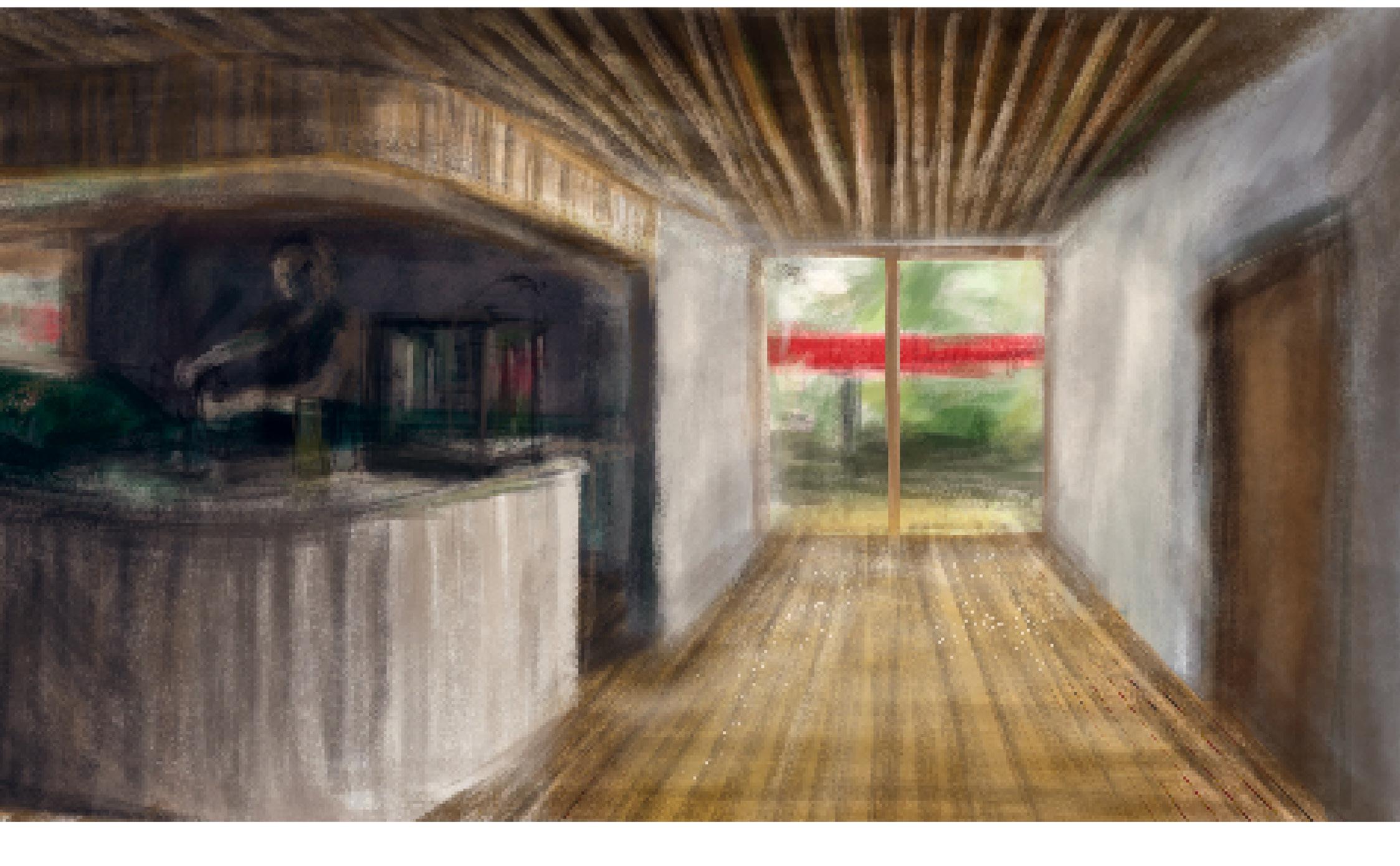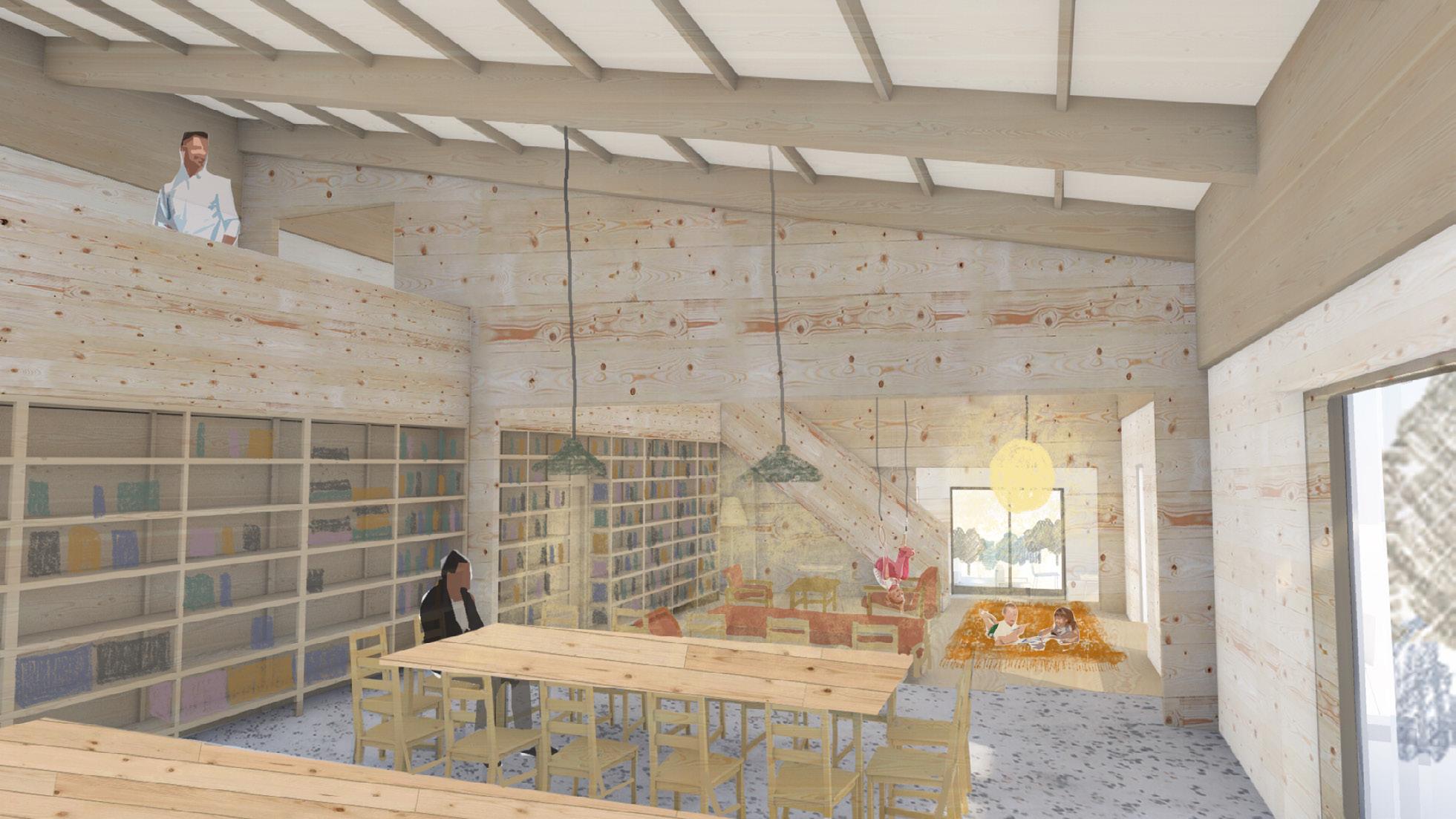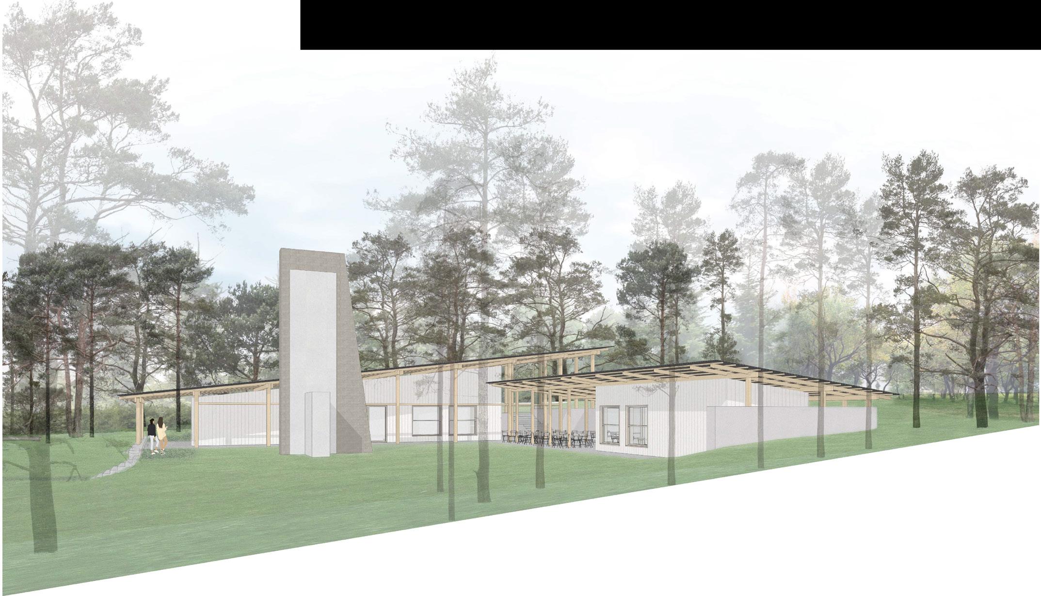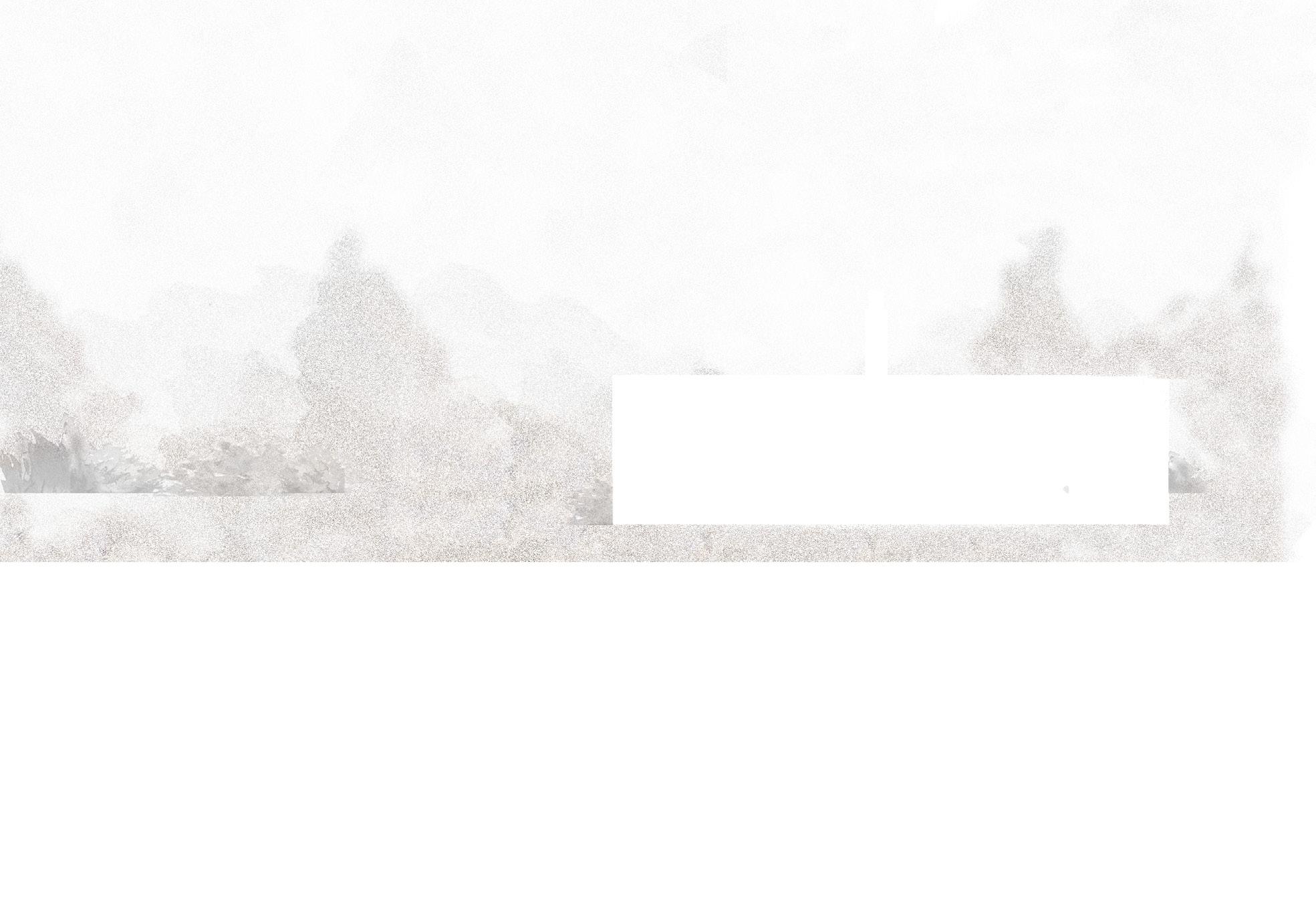 A lábakon álló hosszanti épület ellebegtetve jelenik meg a telken, így nem bolygatja meg a jelenlegi állapotot. A forma és az elhelyezkedés a terület tengelyes karakteréhez igazodik. Az épületben helyet kap egy olvasó/ tanuló tér, büfé/bár terasszal és mosdók.
