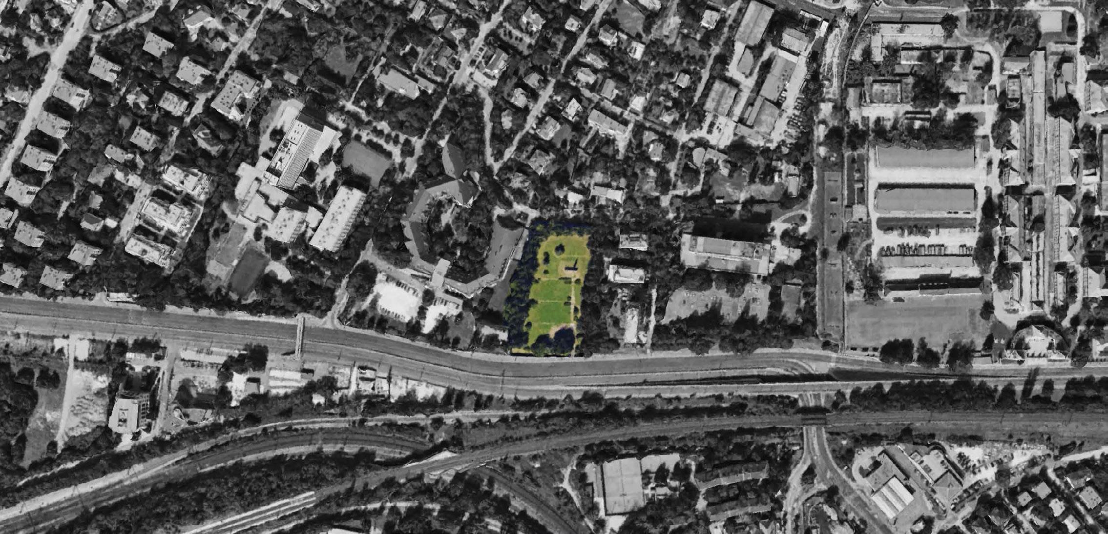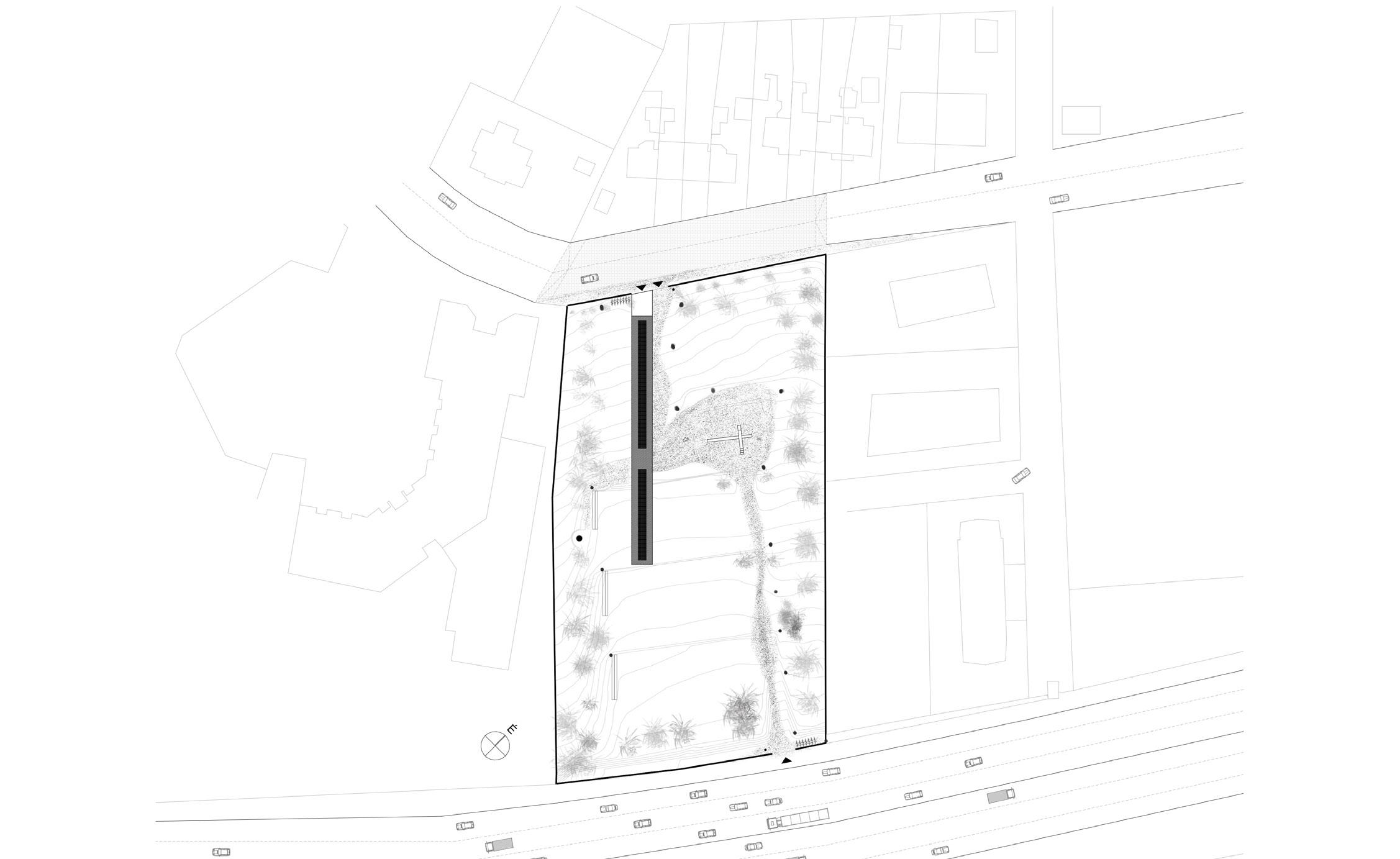 A helyszín a sokak számára jól ismert útvonal, az M1-M7 bevezetőszakaszának változó minőségű és hangulatú beépítései között rejtőző, téglafallal körbevett zöldterület. A volt amerikai katonai emlékhelyként funkcionáló telek mára kihasználatlanul bújik meg egy szállodakomplexum és egy irodaház között. Adottságai magában hordozzák korábbi funkcióját: a hosszúkás, lejtős telek a Budaörsi út felőli bejárattól egymás fölé sorolt, sík teraszokra van osztva. A bejárat tengelyében végigfutó, lépcsőkkel megtört ösvény végén, a telek felső harmadában egy modernista, pengefalak kompozíciójából felépülő emlékmű helyezkedik el. A telek lakóövezet felé eső vége teljesen zárt, zsákutcaként fordul a hegyoldal irányába. A területet körbekerítő téglafalon csak a Budaörsi út irányában találhatók nyílások, a kapun kívül kis kerek kivágatok engednek betekintést az utcáról. A kerítés mentén méretes lombhullatókból, illetve feketefenyőkből álló fasor fut körbe, mely intenzívebben választja el a belső világot a környezőtől, megszűrve az út zaját. Jelenlegi állapota e dupla keretezés által egy eldugott, zárványként is felfogható helyzetet eredményez, melyben – akár egy titkos kertben – sok lehetőség rejlik.