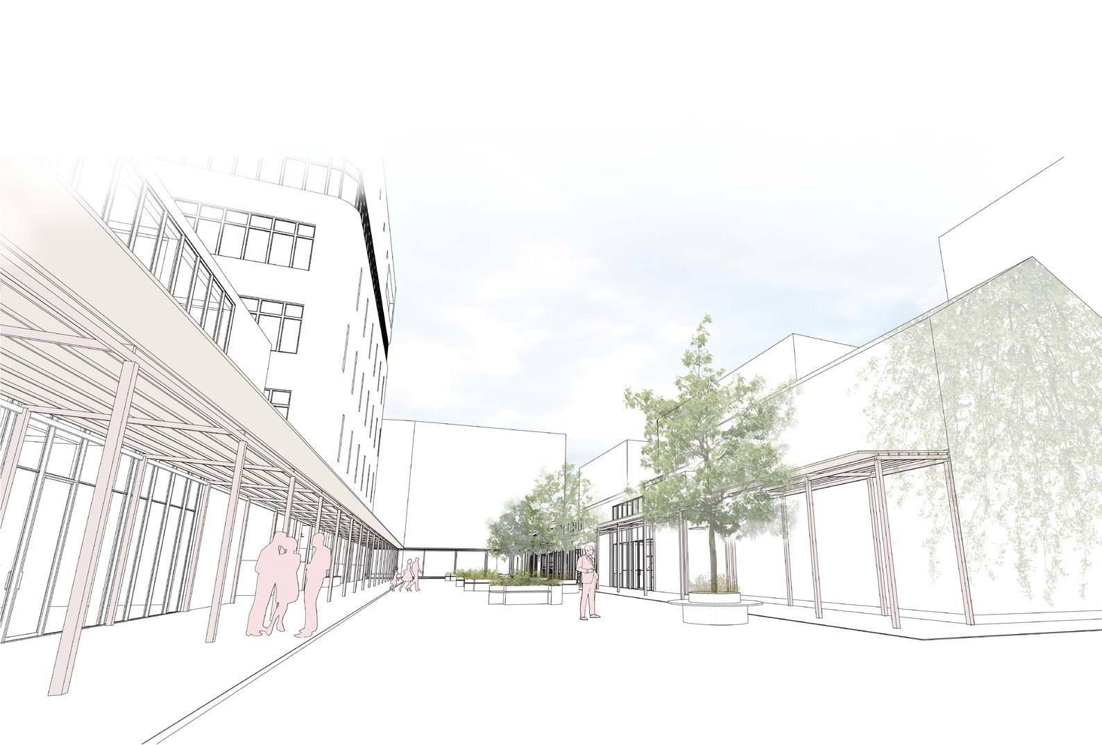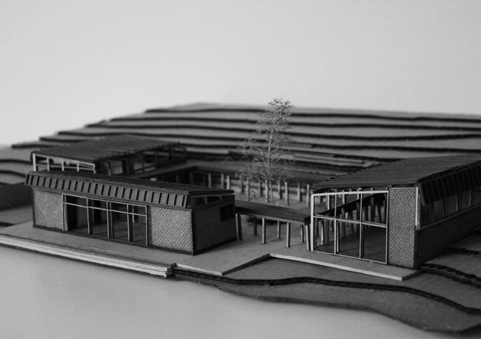 Három tégla-és acélszerkezetes pavilont hoztam létre, kerengővel összekötve egy nagy, burkolt tér körül.