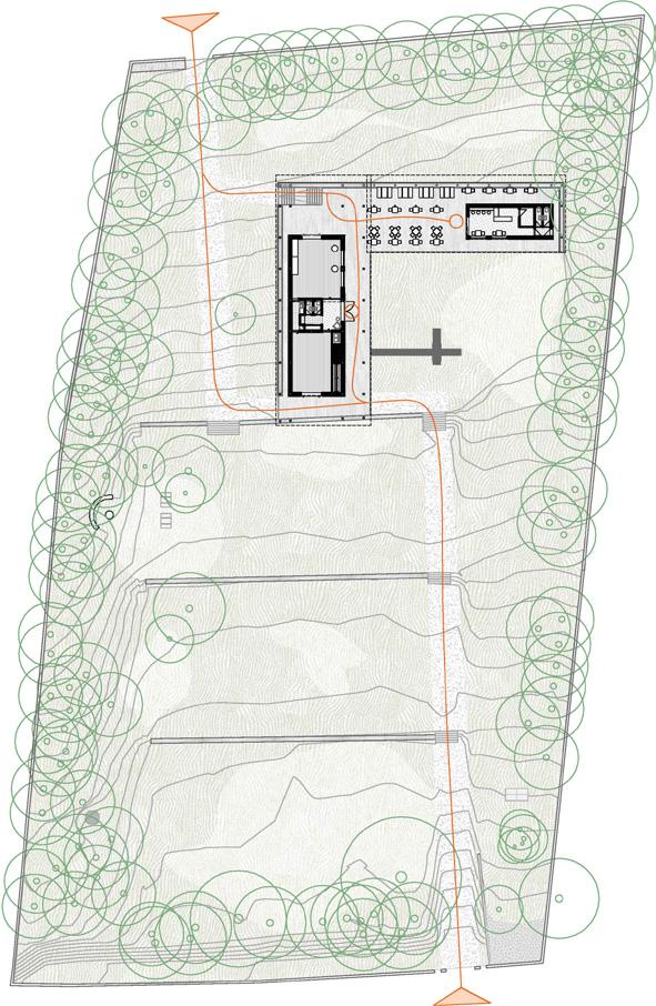 A fallal egybe olvadó kantinépület felhivja a gyelmet arra, hogy ezen a telken történik valami, becsábitja az erre járókat. Még akkor is, ha éppen nem az cél, hogy étkezzenek. Hiszen egy köztér szituáció is megtalálható, ahol piacokat lehet szervezni, ezenfelül még lehet falat mászni, mozogni.